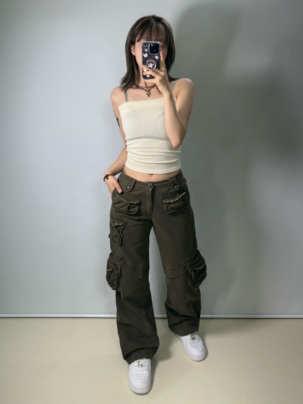 •브라운컬러의 카고팬츠에요!미니포켓 디테일과 전체적인 실루엣이 굉장히 멋있는 팬츠랍니다:) 완전 잘샀다 템.......!