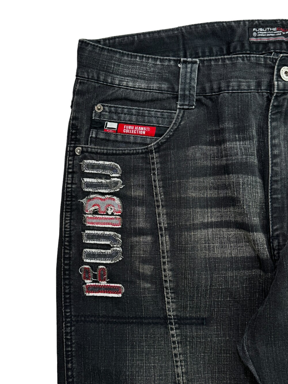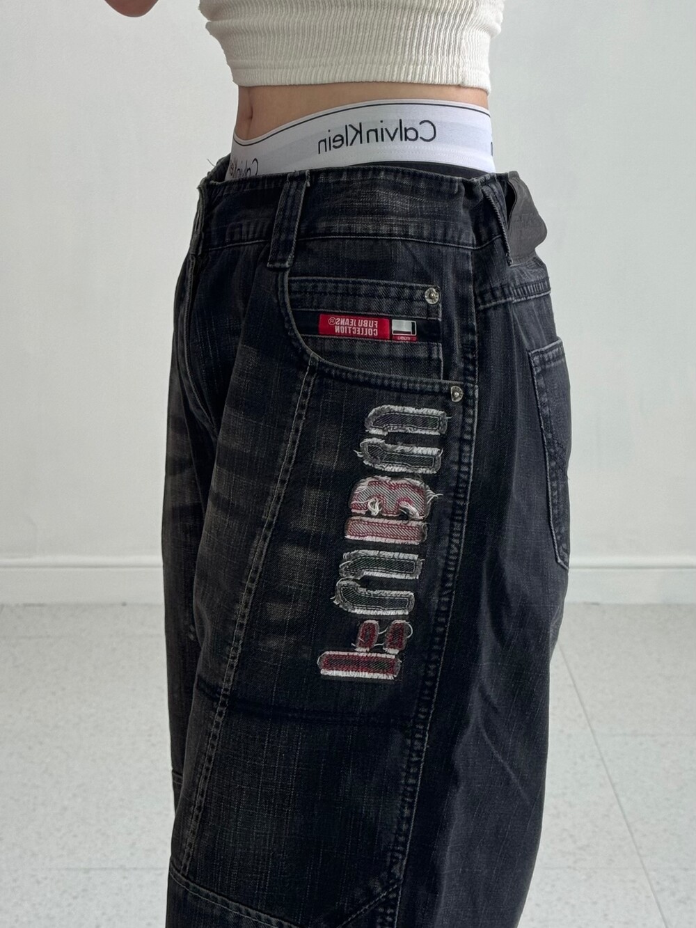 •푸부 흑청 데님팬츠 입니다! 패치로 로고가 귀엽게 들어가있어서 더 마음에 들어요..><