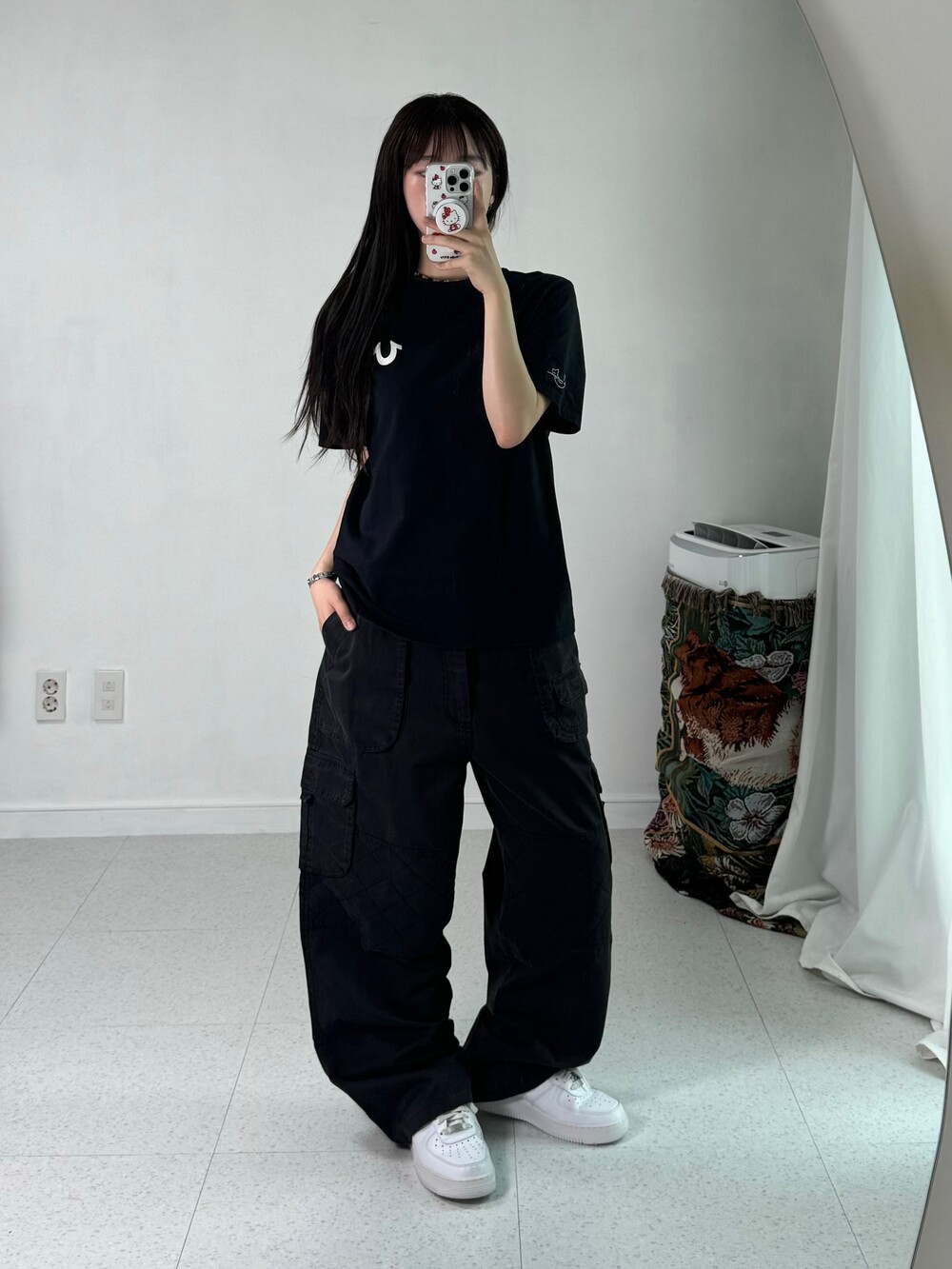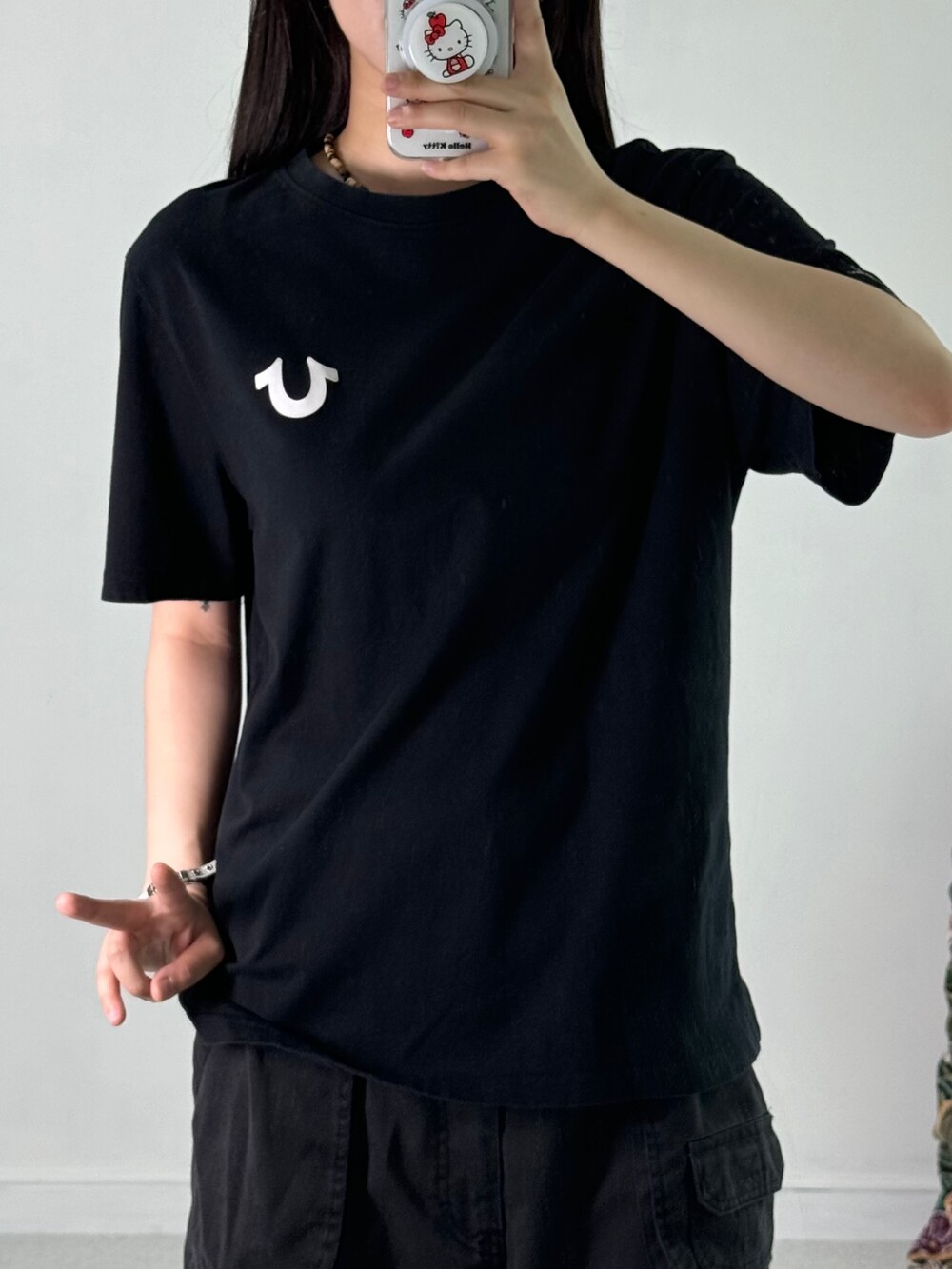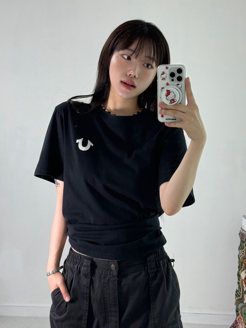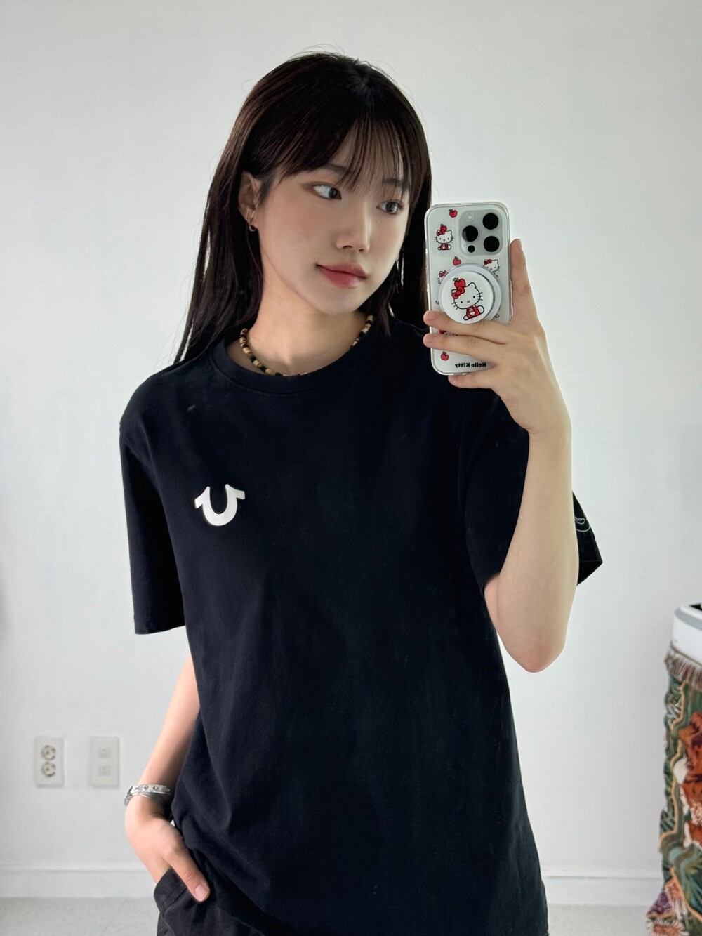•트루릴리젼 반팔이에요! 앞에는 미니로고 뒤에는 빅로고 포인트로 올블랙룩에도 귀엽게 입어주시기 좋은 디자인이에요ㅎㅎ 살짝 크롭해서 입어주셔도 귀여워욥 ㅎㅎ