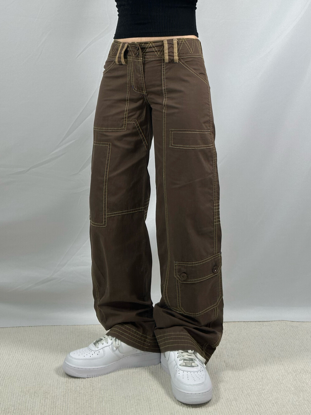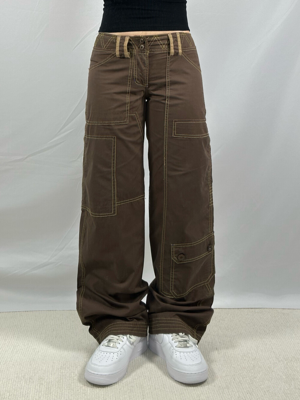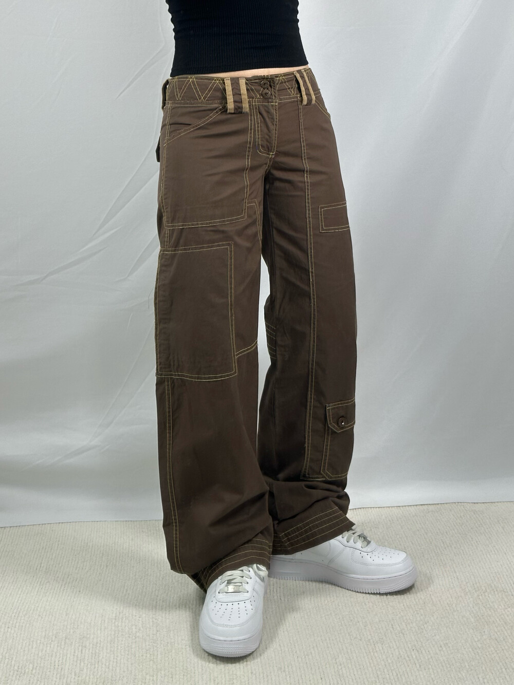 •로우라이즈로 착용하는 카고팬츠에요! 브라운에 옐로우 스티치가 들어가있어 한층 귀여움을 업 시켜주는 팬츠••🤎 봄 여름 가을에 입기 좋은 얇은 원단감이에요:)