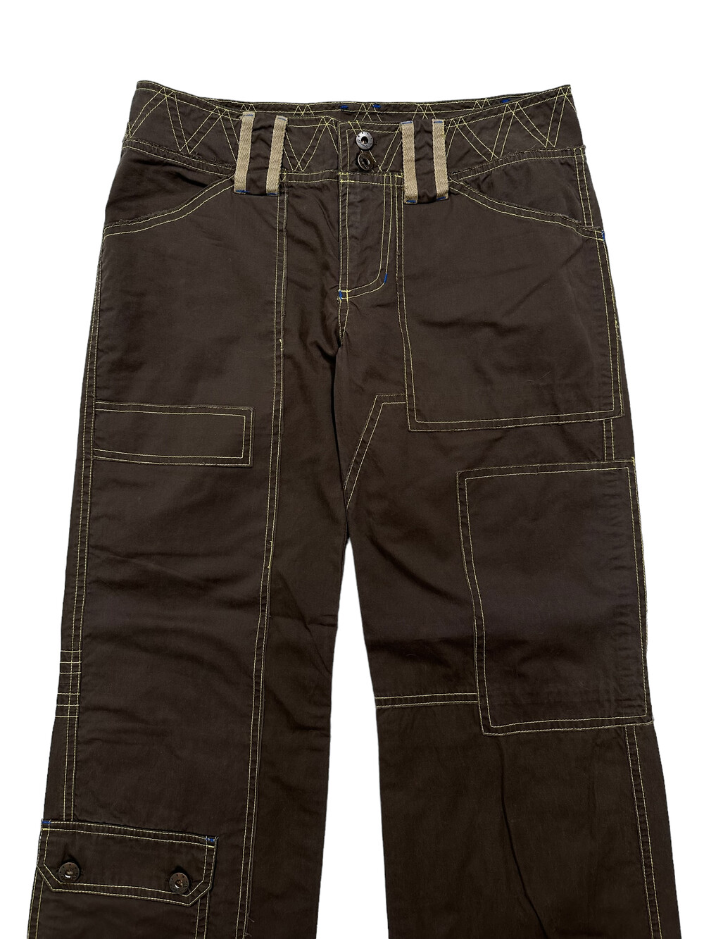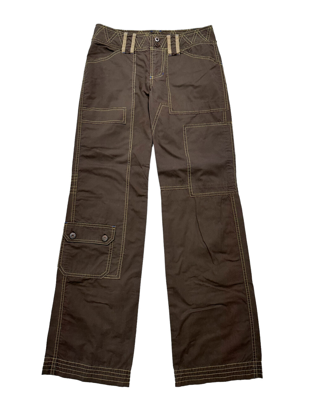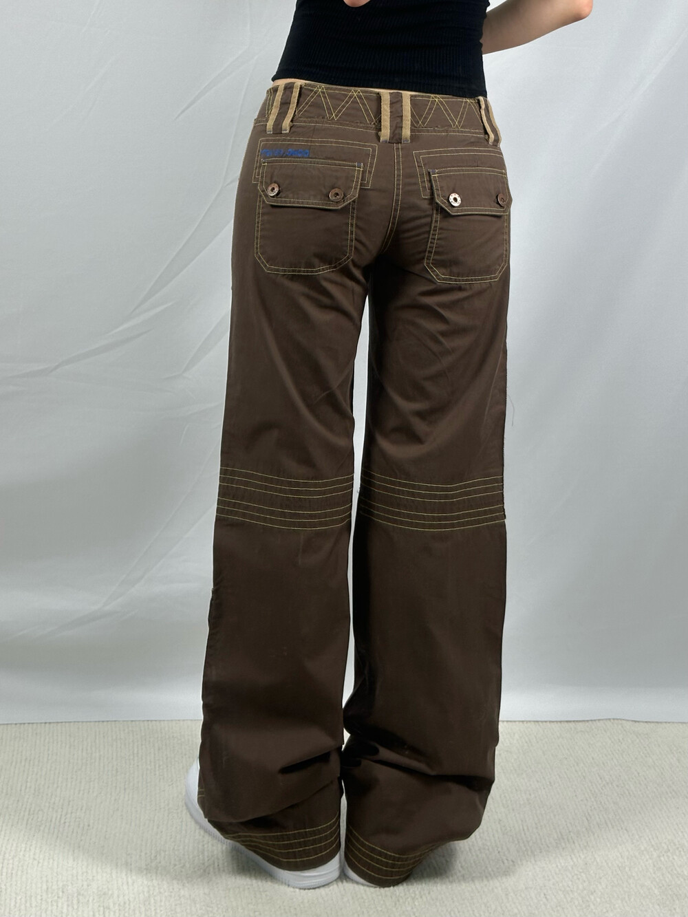•로우라이즈로 착용하는 카고팬츠에요! 브라운에 옐로우 스티치가 들어가있어 한층 귀여움을 업 시켜주는 팬츠••🤎 봄 여름 가을에 입기 좋은 얇은 원단감이에요:)