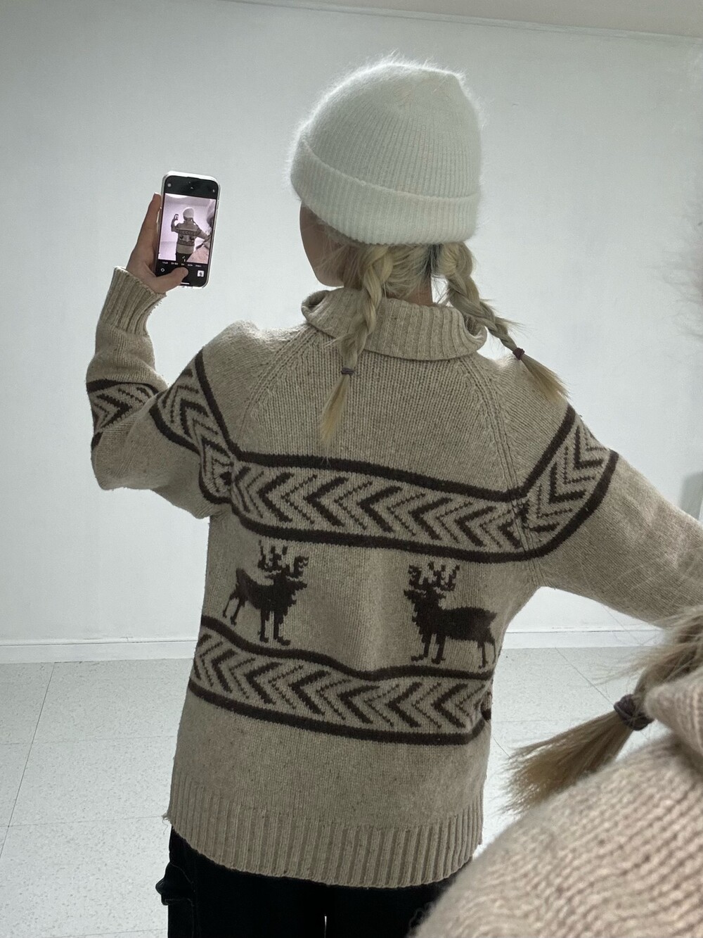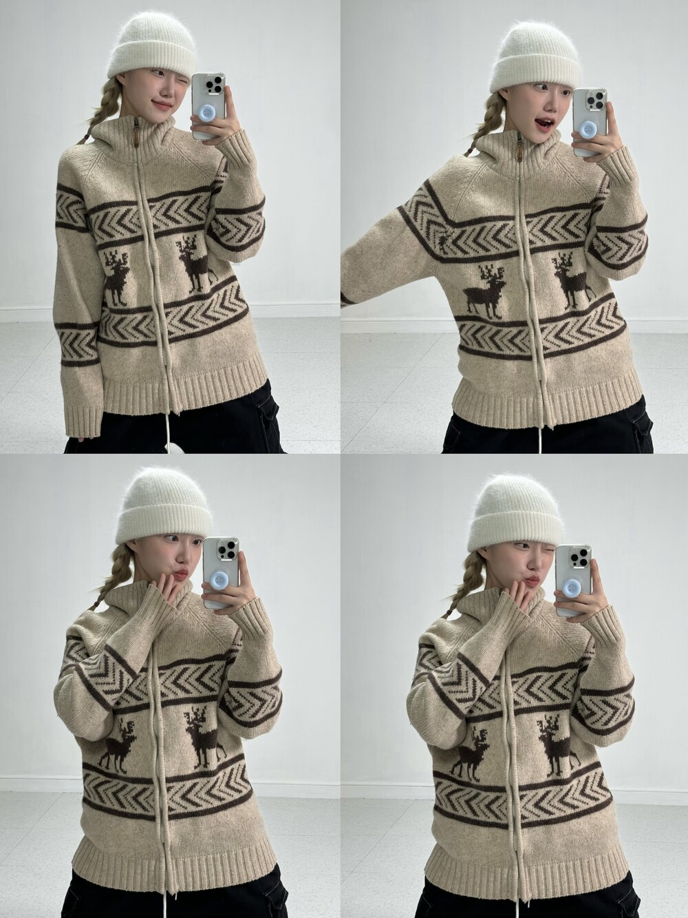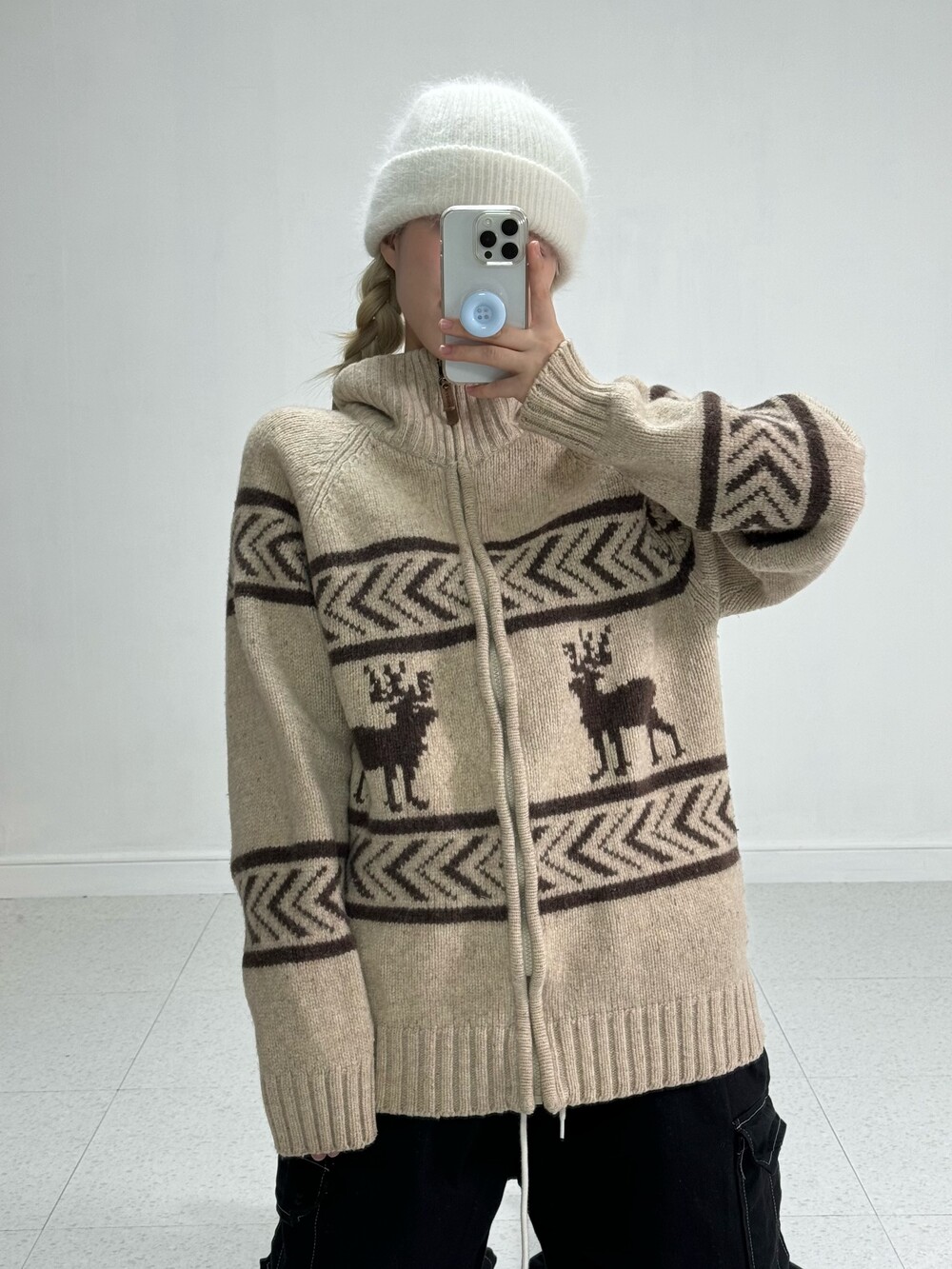 •베이지컬러의 도톰한 노르딕 집업이에요ㅎㅎ 사슴디자인까지 들어가있어 더욱 겨울+연말느낌 가득이구요.. 핏감 미쳤고요, 까슬거림 5점만점중 2점 드리겠습니다