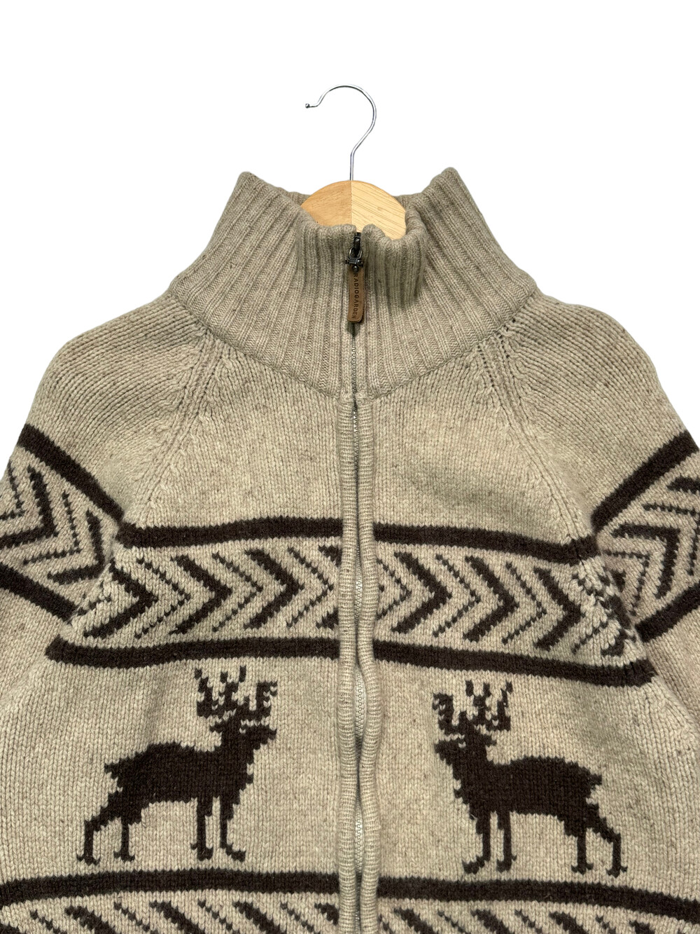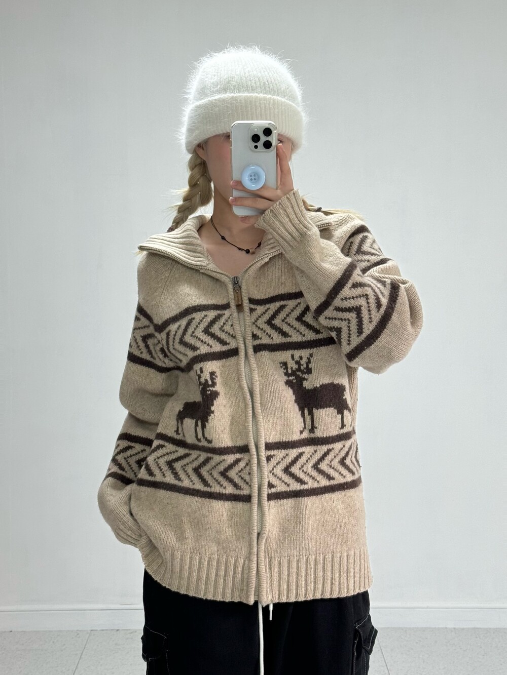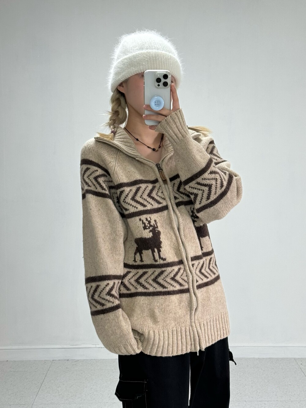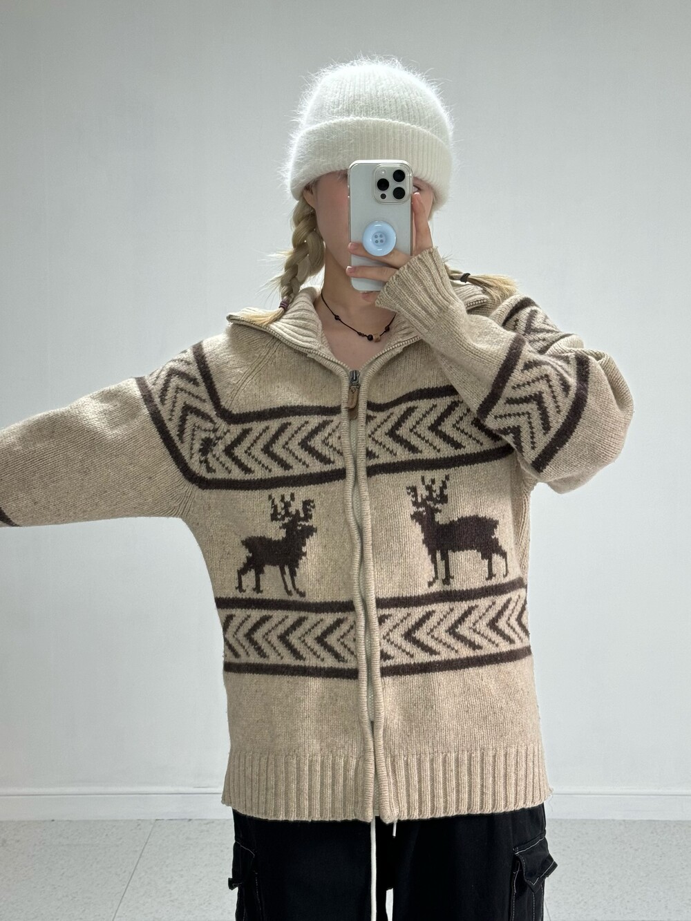 •베이지컬러의 도톰한 노르딕 집업이에요ㅎㅎ 사슴디자인까지 들어가있어 더욱 겨울+연말느낌 가득이구요.. 핏감 미쳤고요, 까슬거림 5점만점중 2점 드리겠습니다