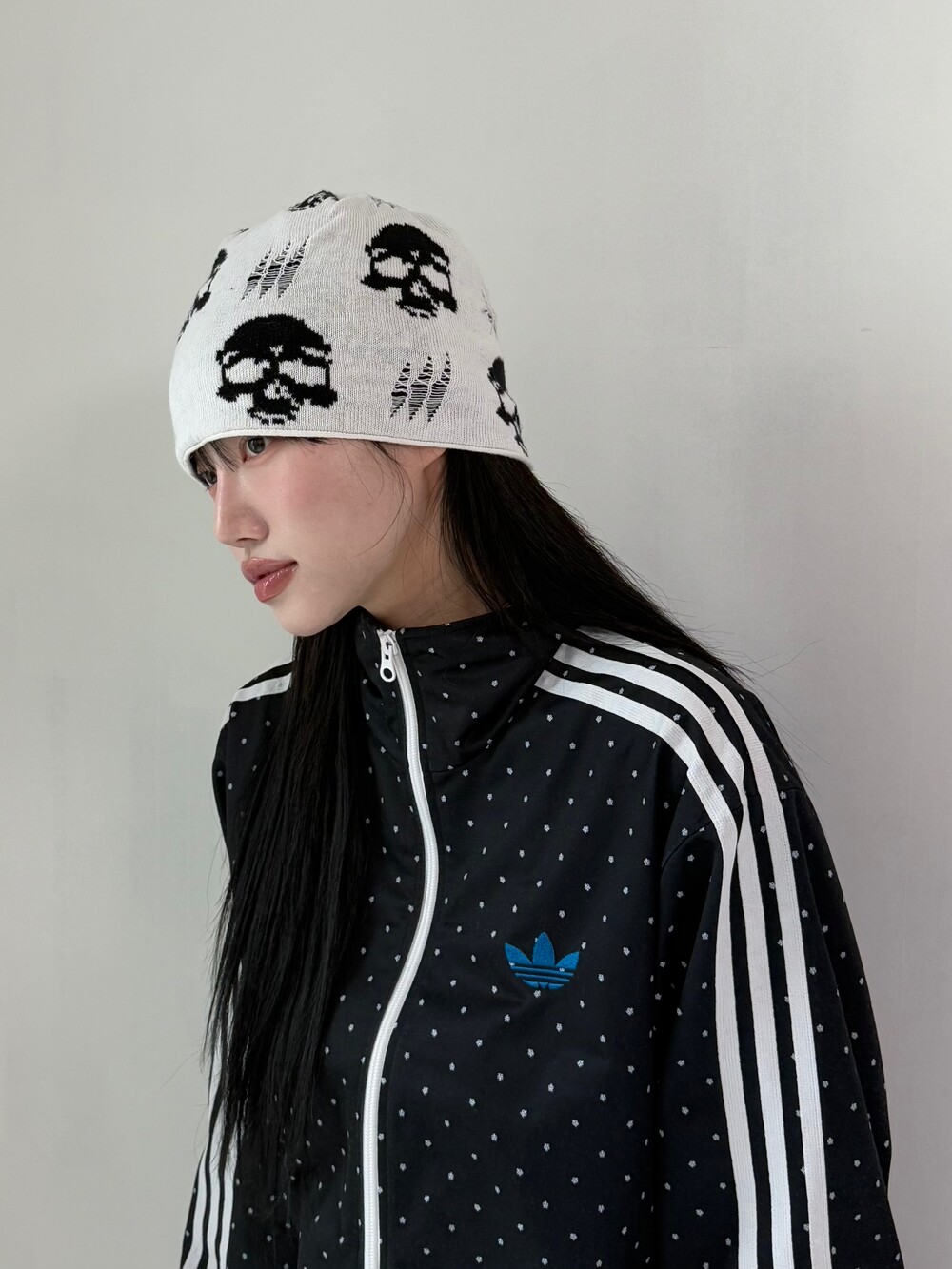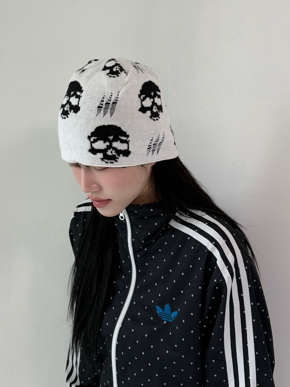 해골패턴이 멋스러운 니트 비니에요! 데미지 디테일까지 들어간 와이투케이 무드 빈희ㅎㅎ 제가 정말 애정하는 아이템이여요..><