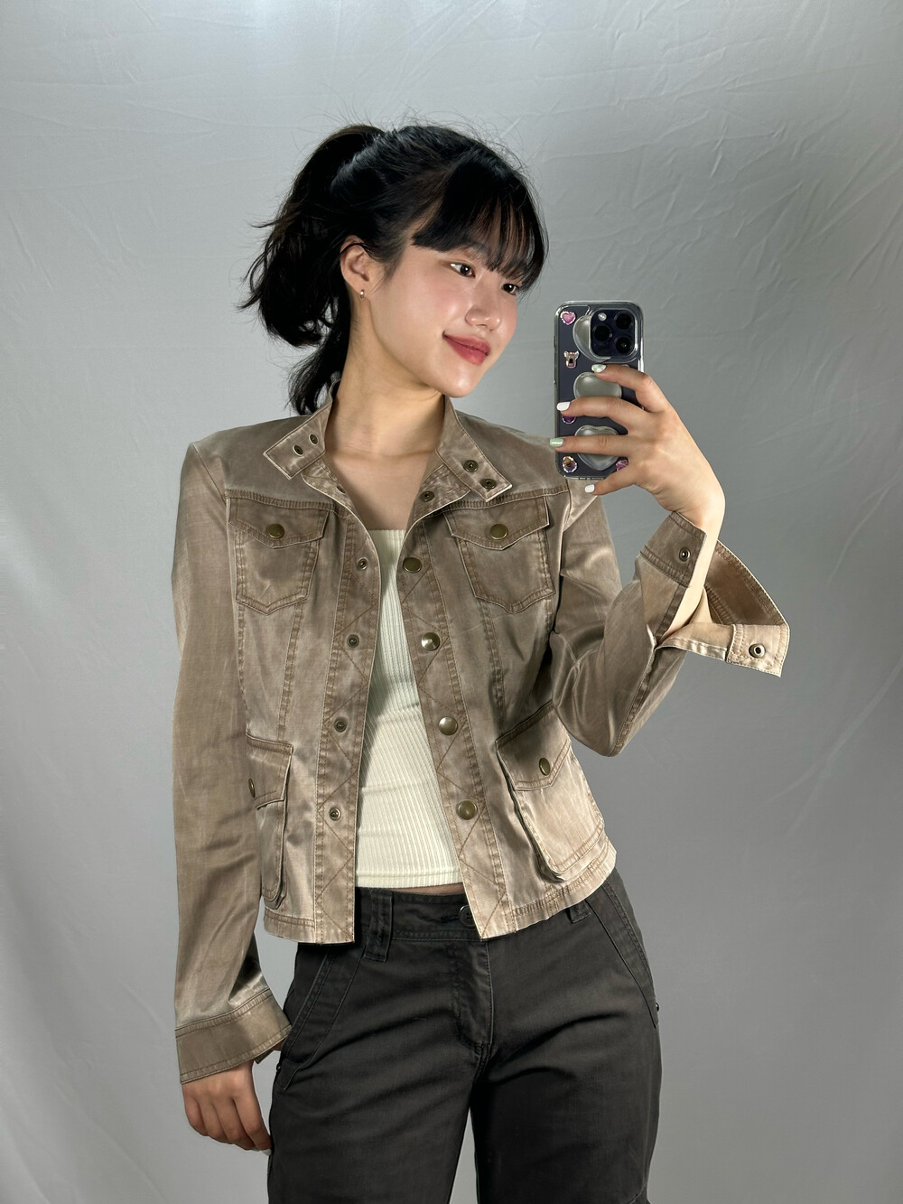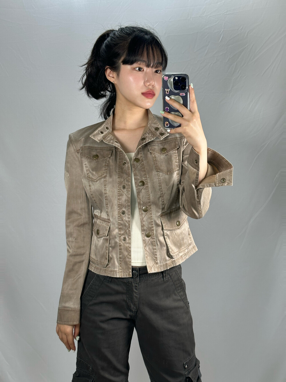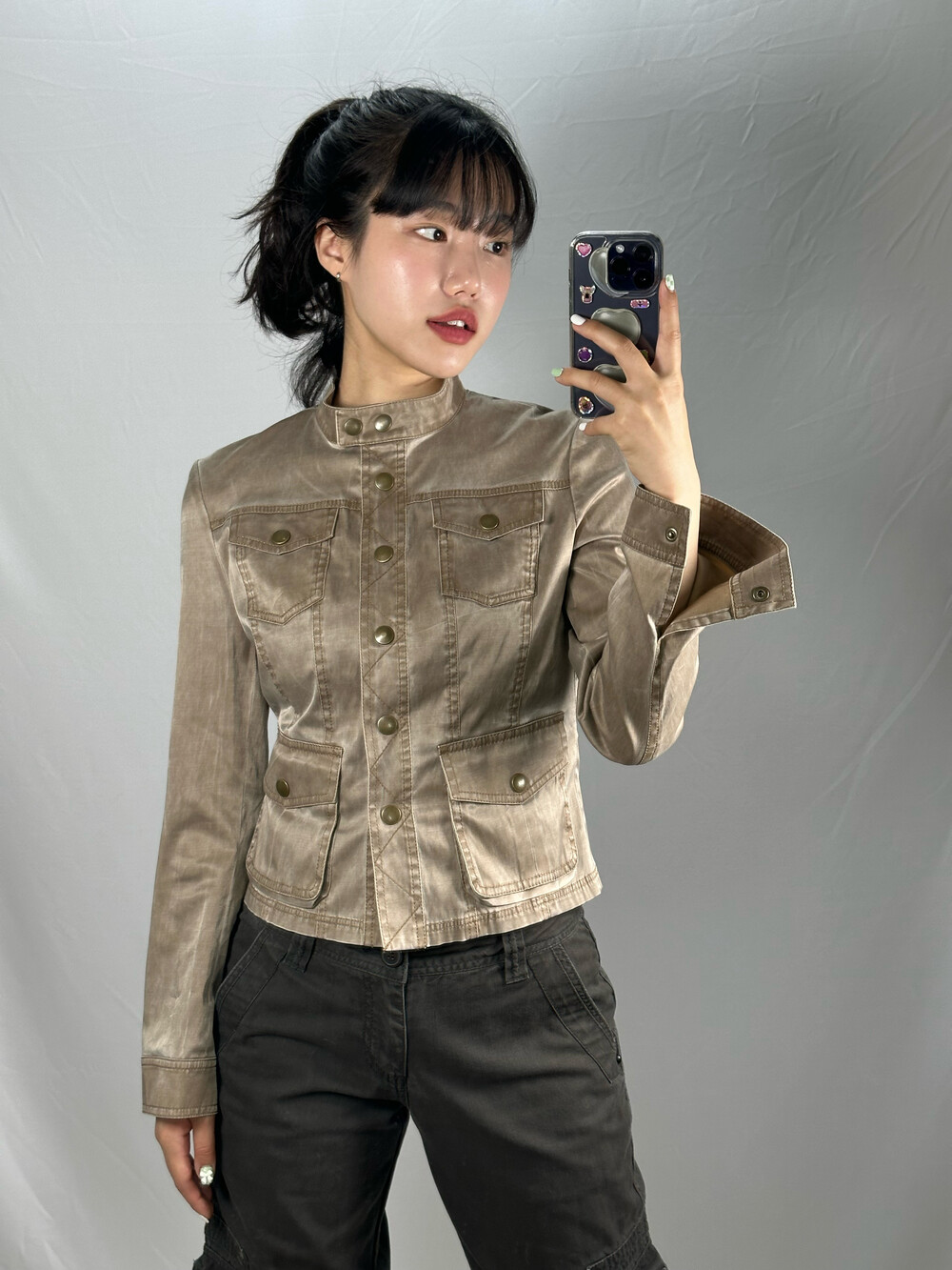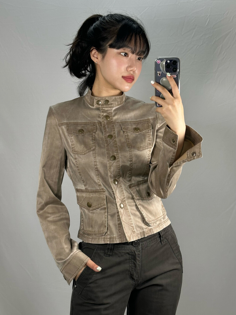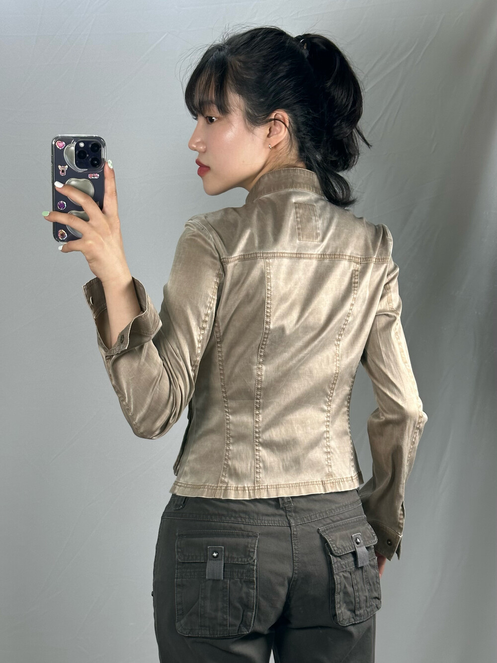 골반에 살짝 숏하게 걸쳐지는 기장감과 부드러운 실크원단과 폴리 느낌이 느껴지는 아주 매력적인 자켓입니다! 은은하게 베이지 색상 광택감이 돌아서 너무 예쁜제품이라 꼭 추천드리고 싶은 제품이에요!