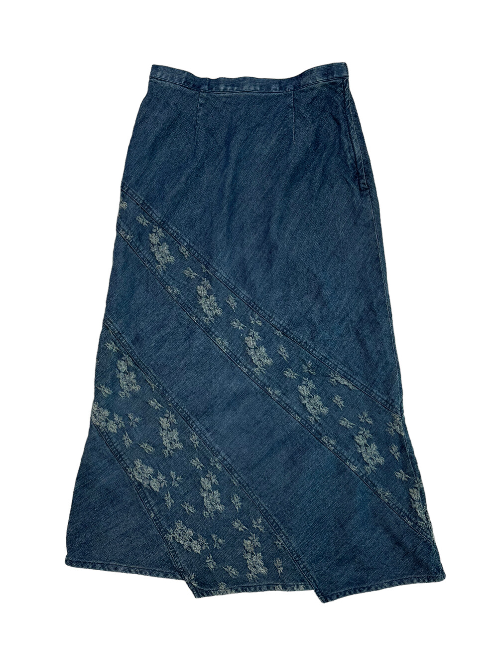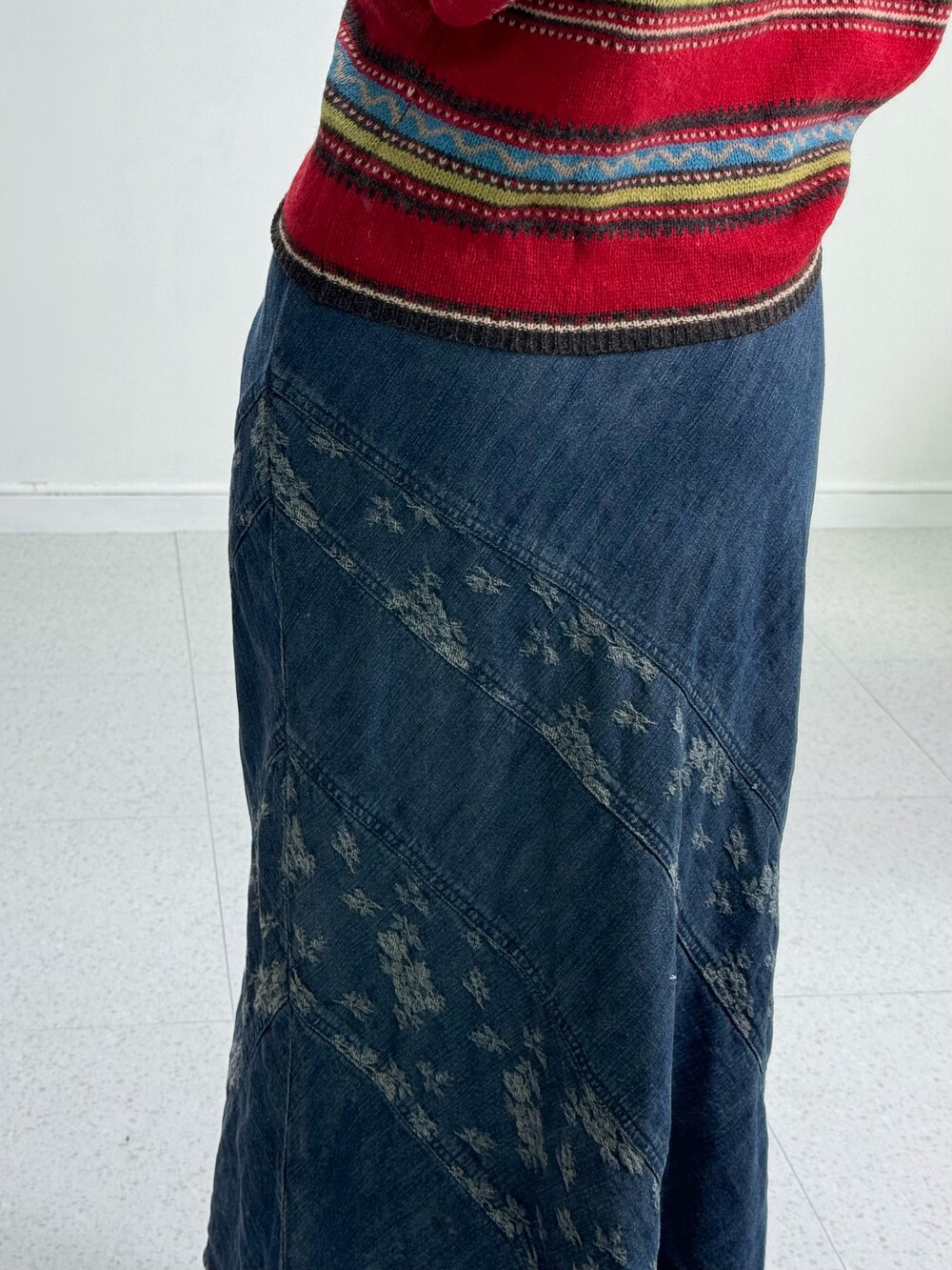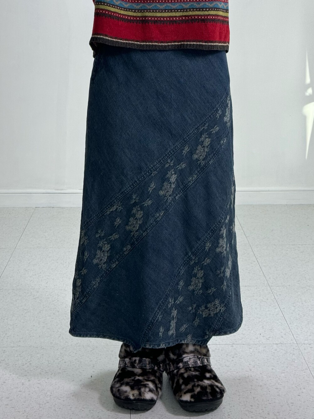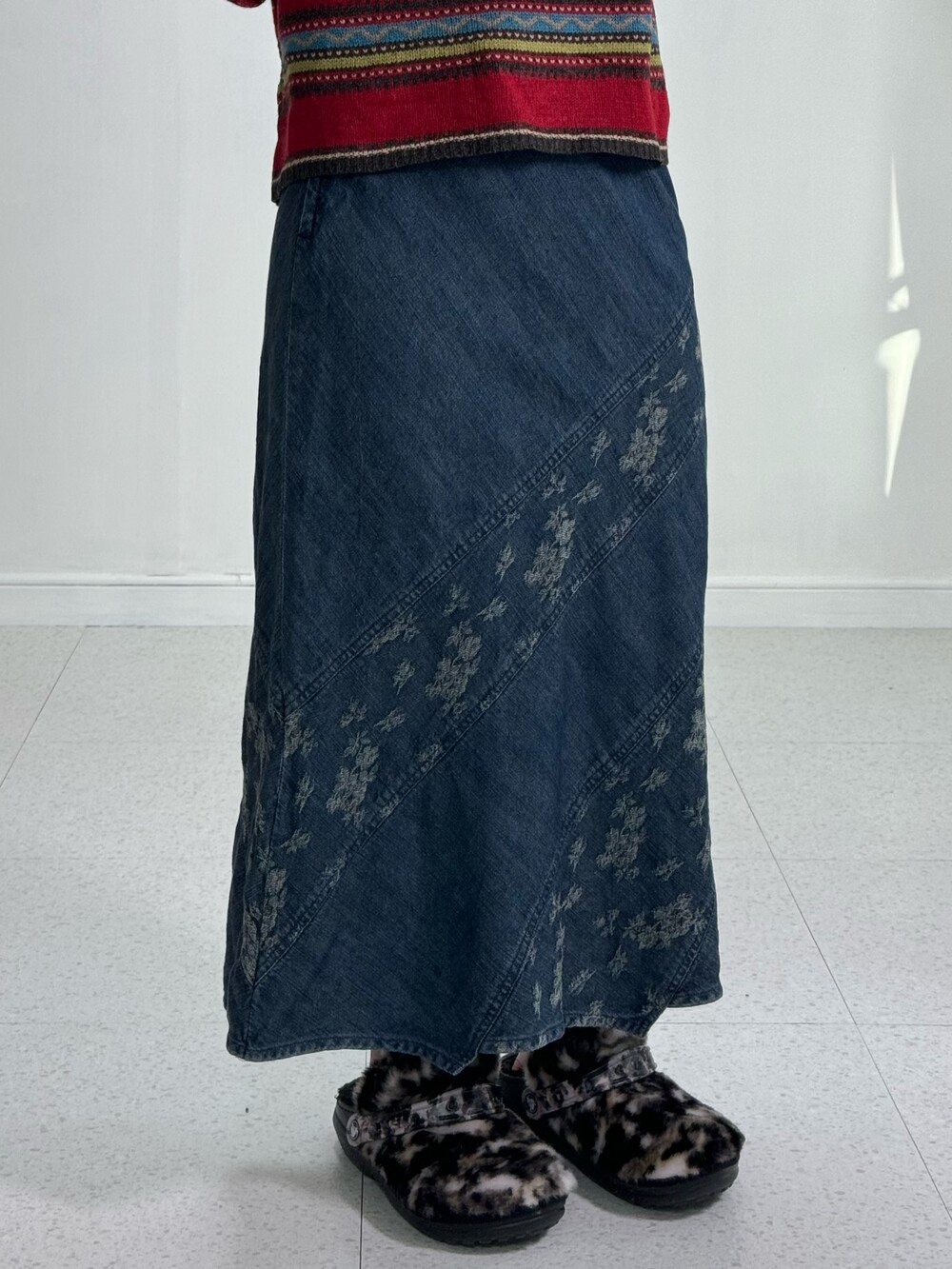 •에스닉한 분위기 가득 플라워 자수 디테일이 들어간 데님 롱스커트 입니다!