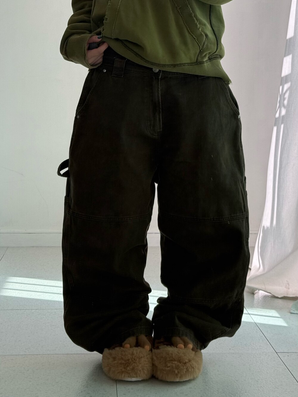 •색감이 매력적인 카키브라운 카펜터 입니다. 와이드하면서 묵직한 실루엣이 멋스러운 아이템이에요!