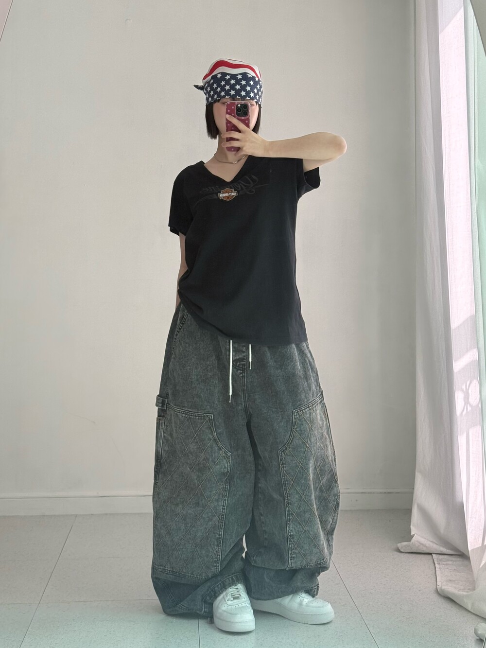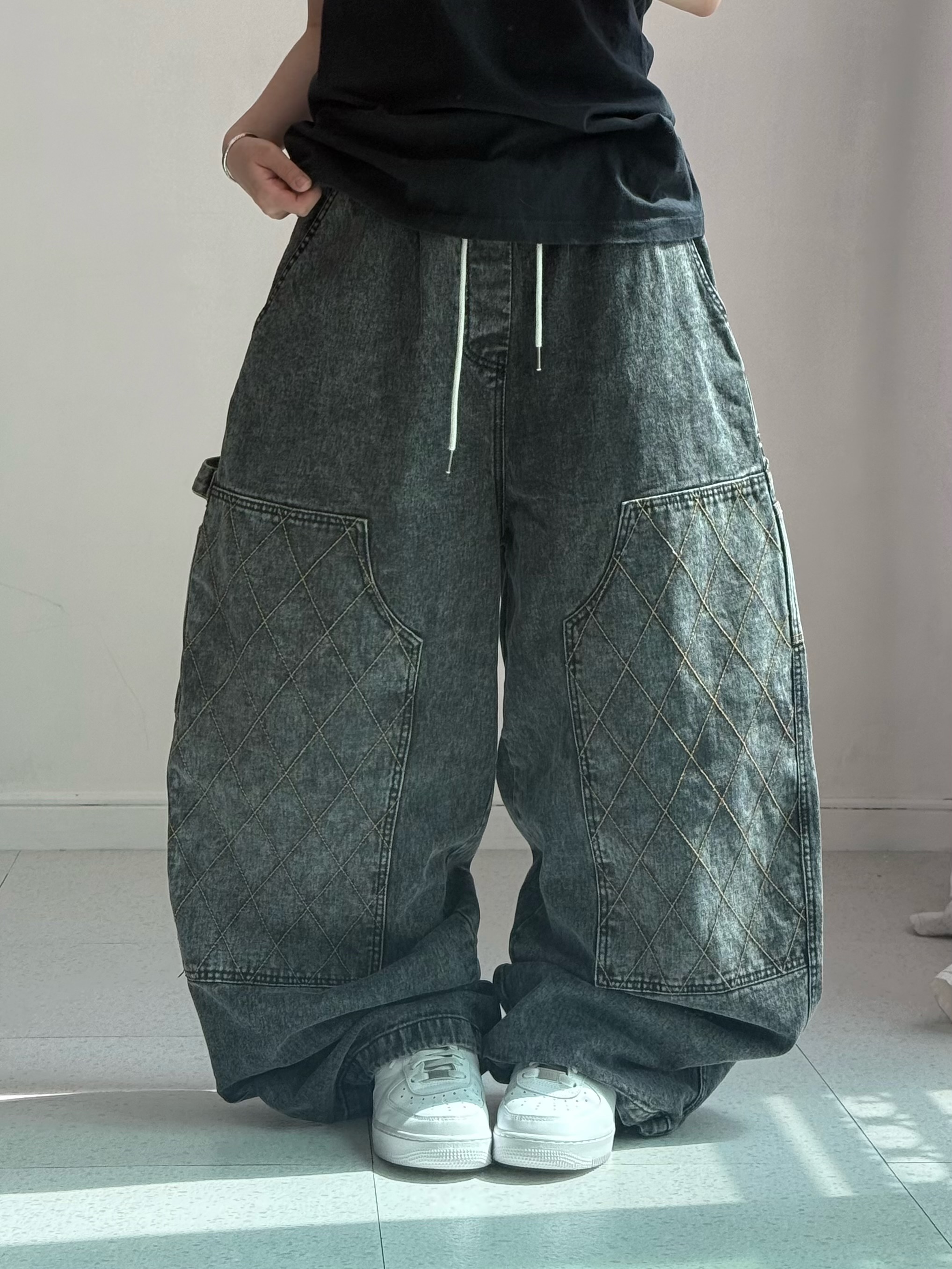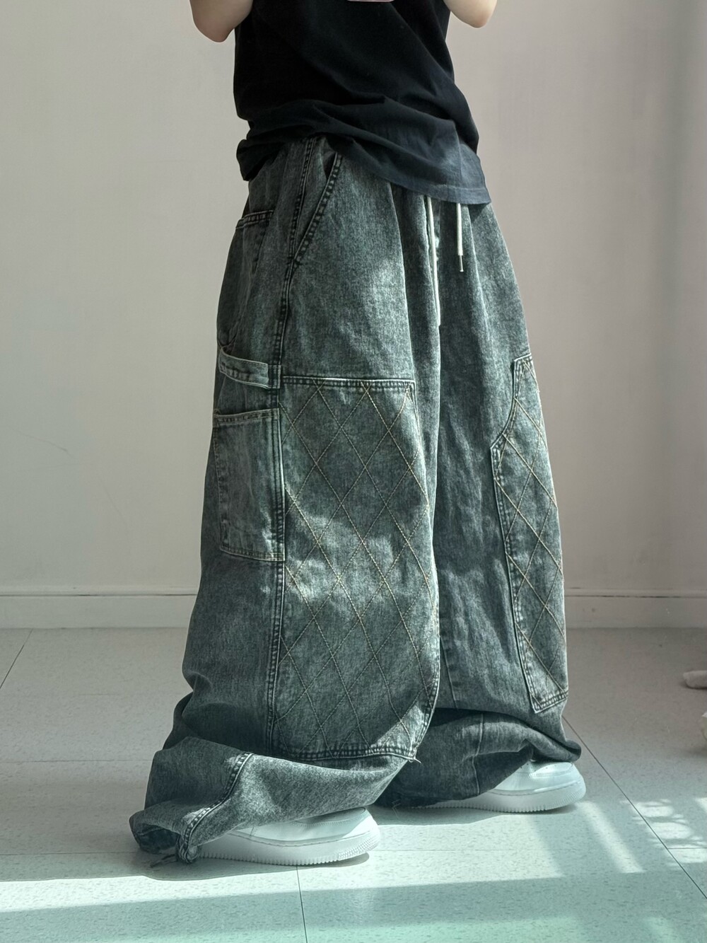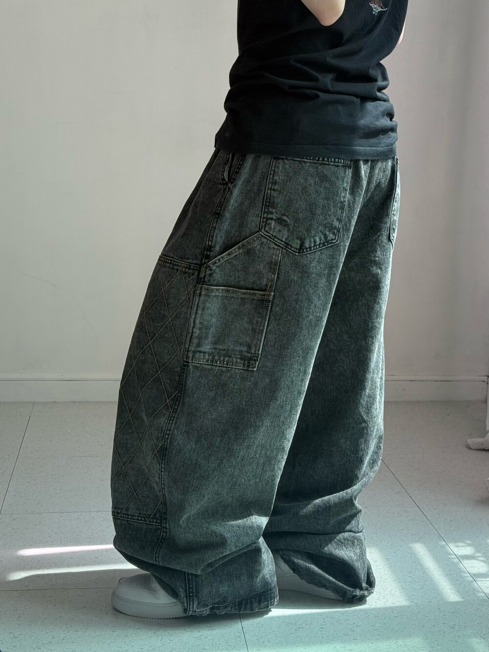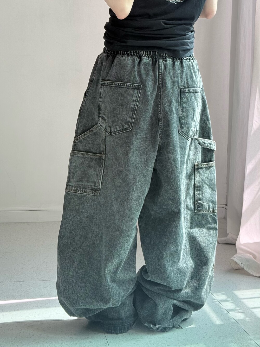 •와이드 벌룬 묵직핏의 데님팬츠 입니다! 더블니 카펜터 디자인이에요ㅎ.ㅎ 핏이 진짜 도라방스,,