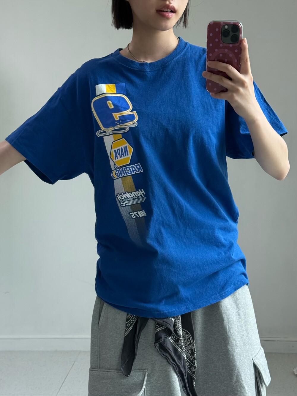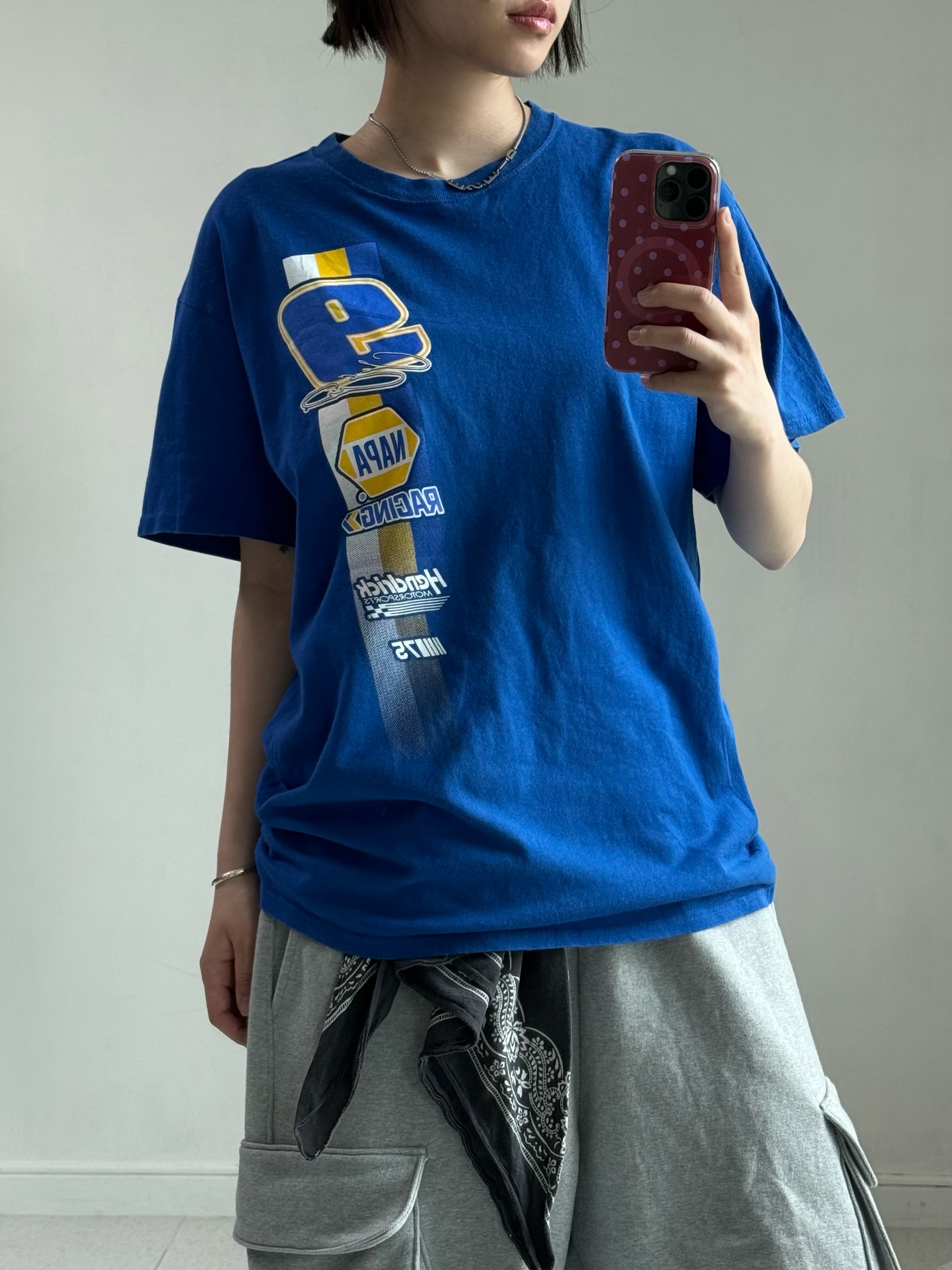 •빈티지 레이싱 반팔티 입니다. 시원한 블루 컬러에 큼직하게 들어간 프린팅이 뽀인트-