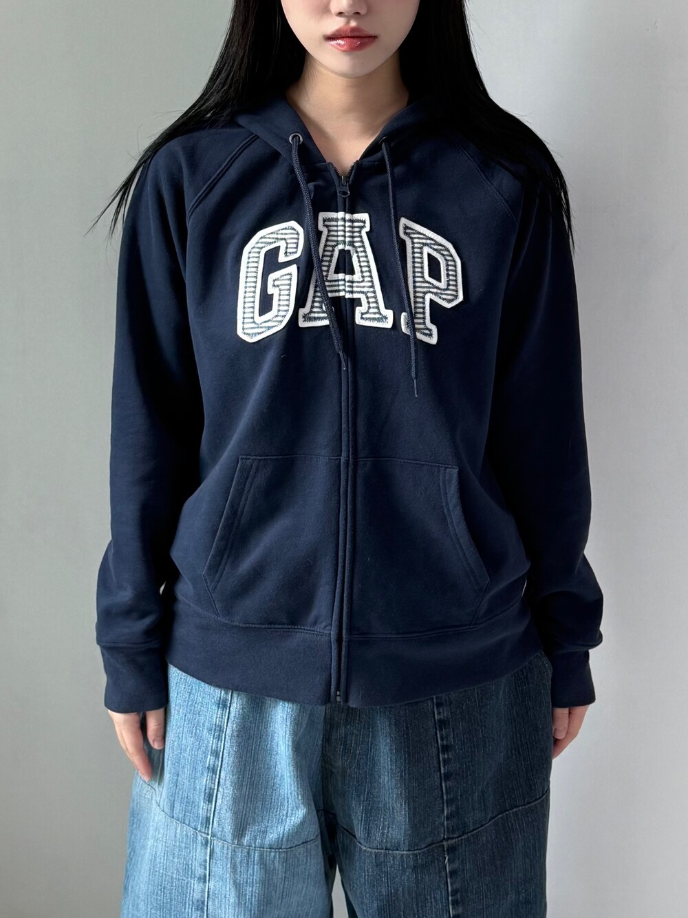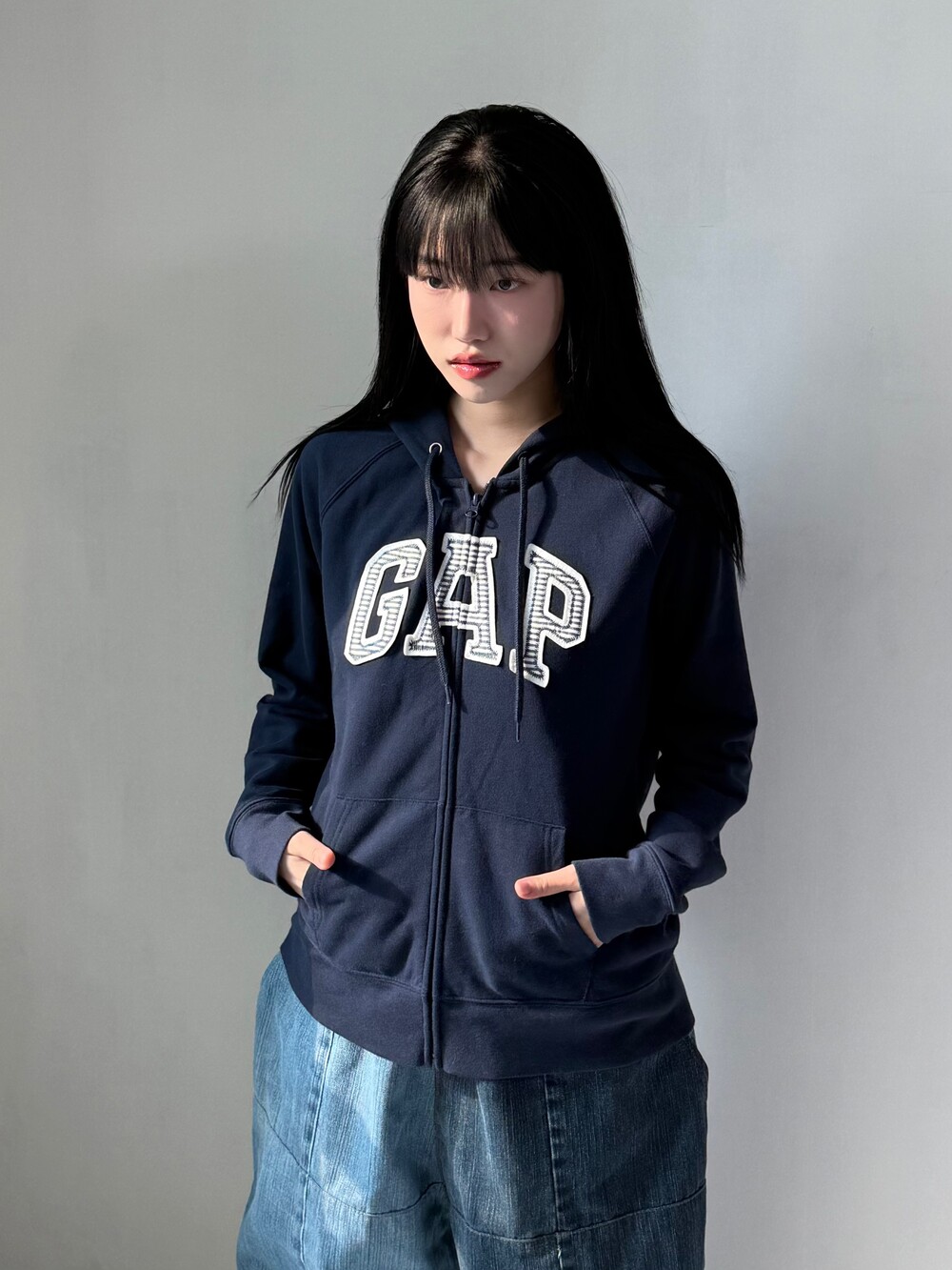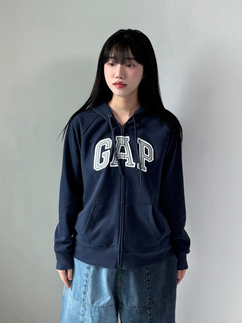 •로고가 스트라이프 디자인으로 들어가있는 귀여운 갭 후드집업! 얇은 기모 안감이라 두꺼운 아우터 안에 살짝 입어주시기 좋아요@!