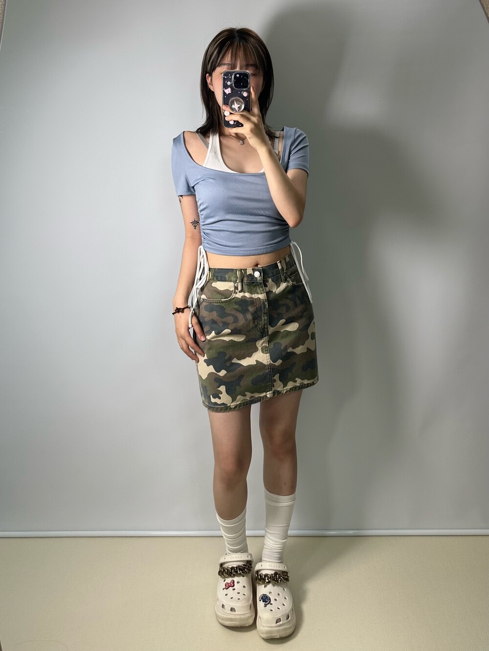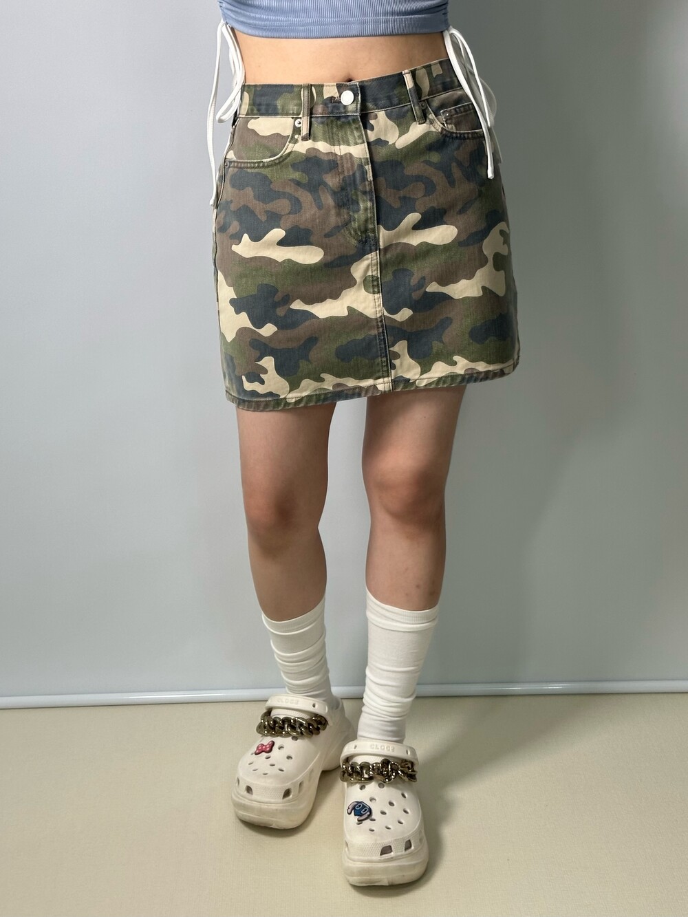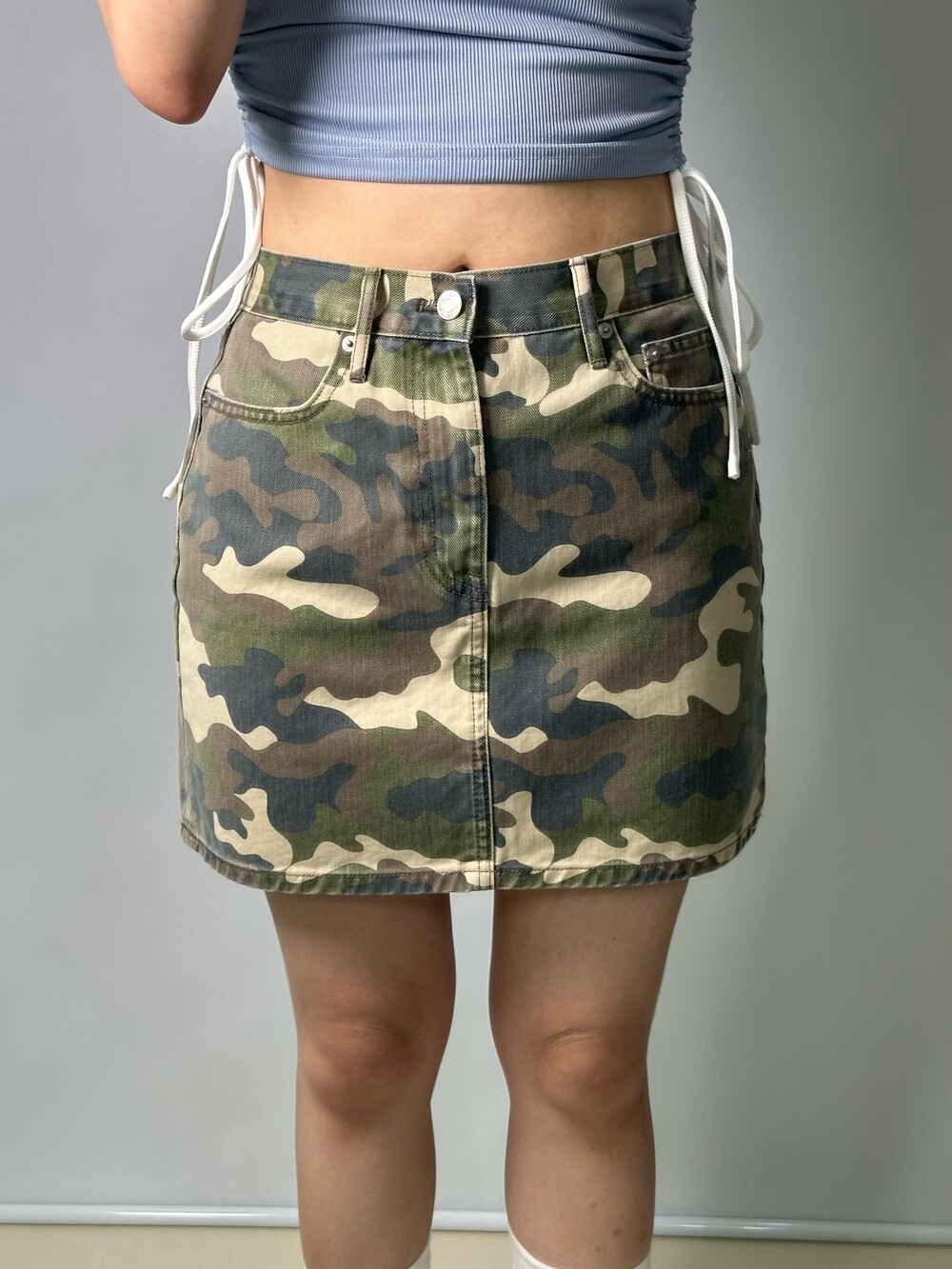 •깔끔한 핏을 가지고 있는 카모 스커트에요! 너무 짧지 않아 편안하게 착용하기 좋아요:) 엉덩이 라인을 깔끔하게 잡아주는데 넘 맘에 들어요>,<