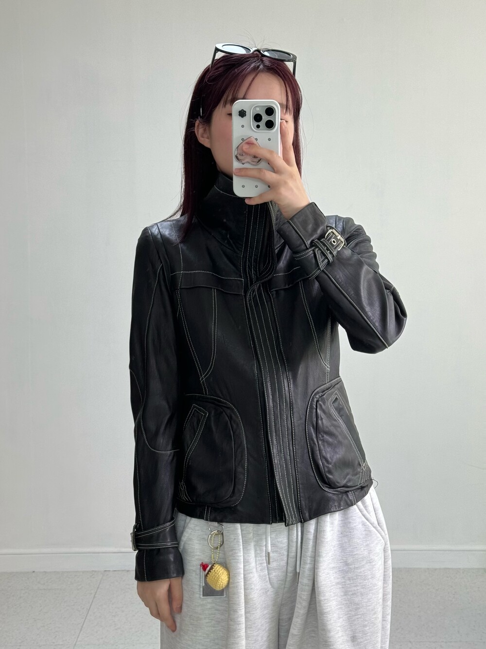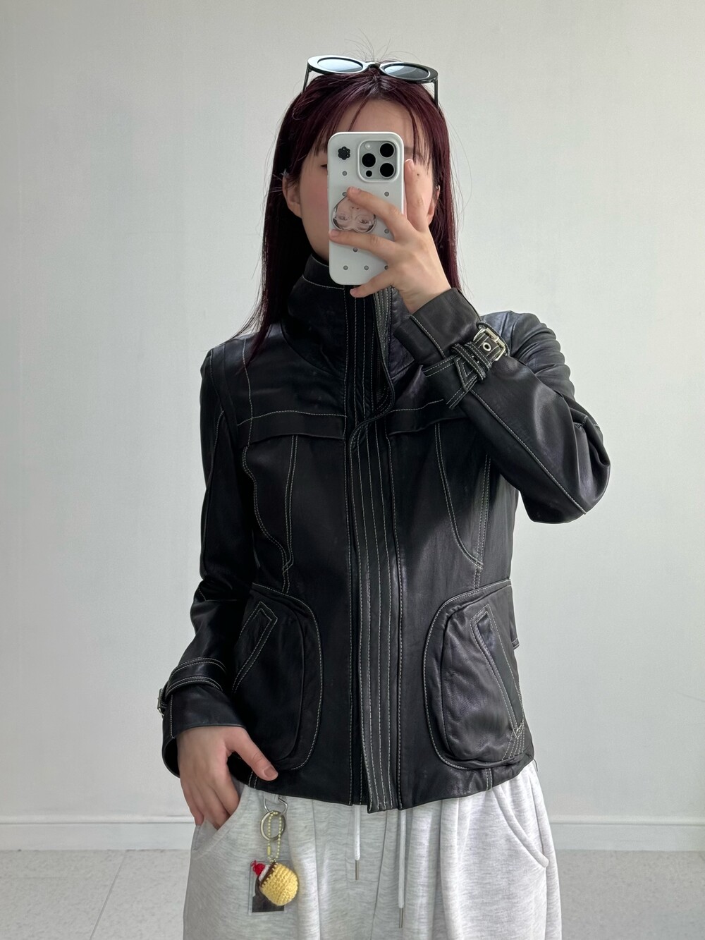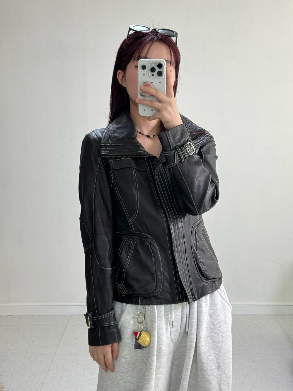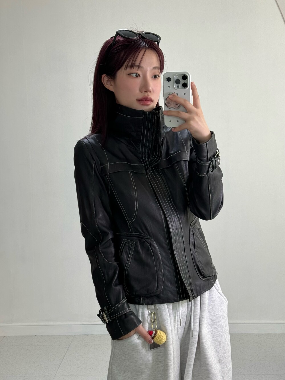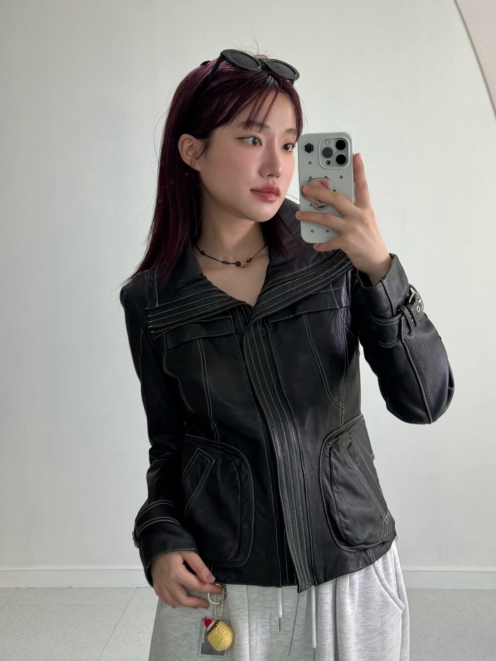 •끝까지 올려입어도 갑갑하지 않아서 더욱 마음에 들었던 레더 집업인데요! 화이트 스티치가 굉장히 멋스럽습니다>,< 소매와 등쪽 벨크로 디자인 넘 멋있어요 🖤