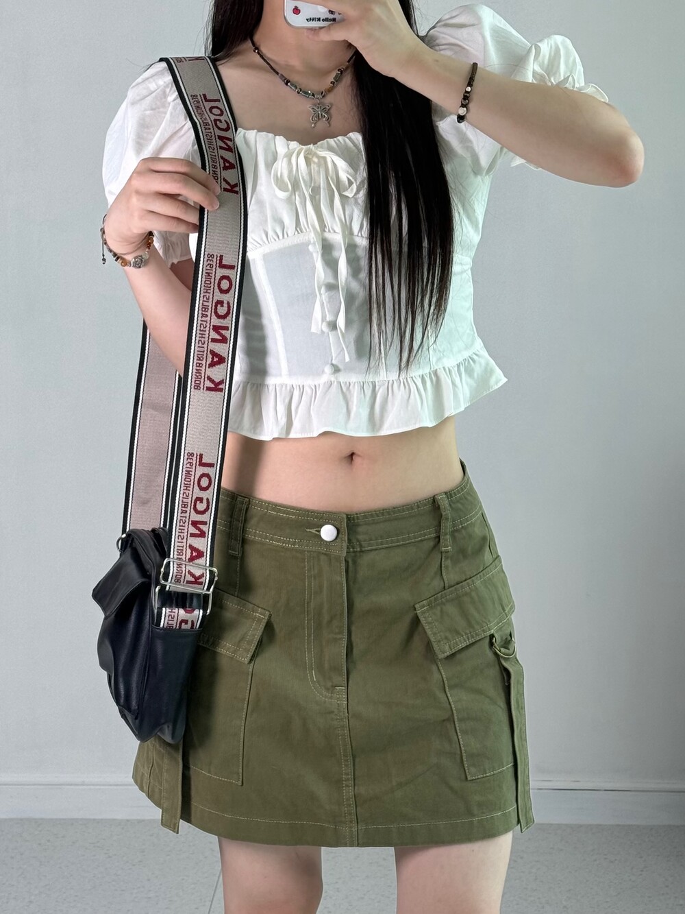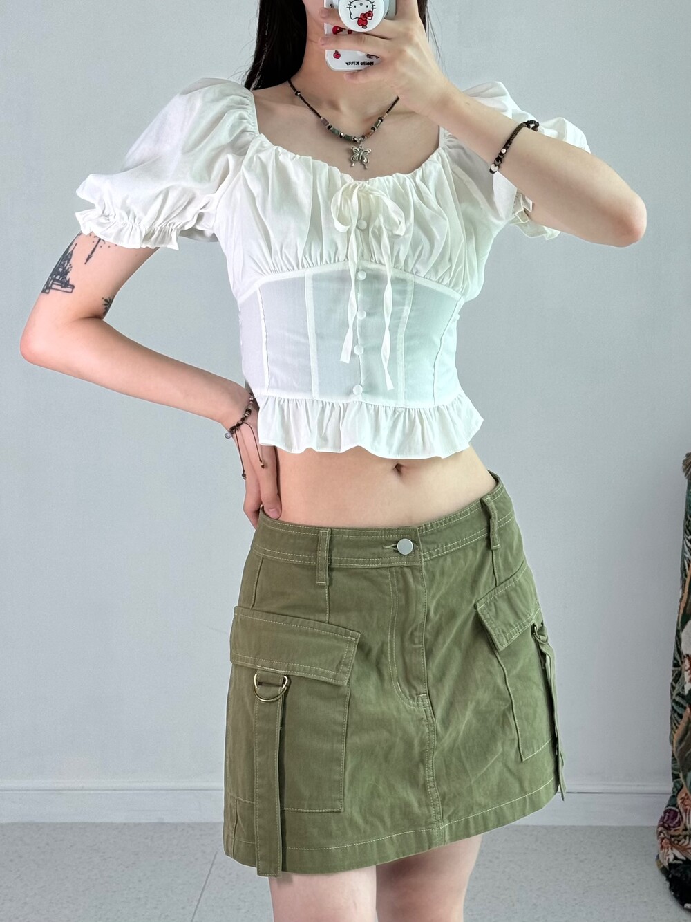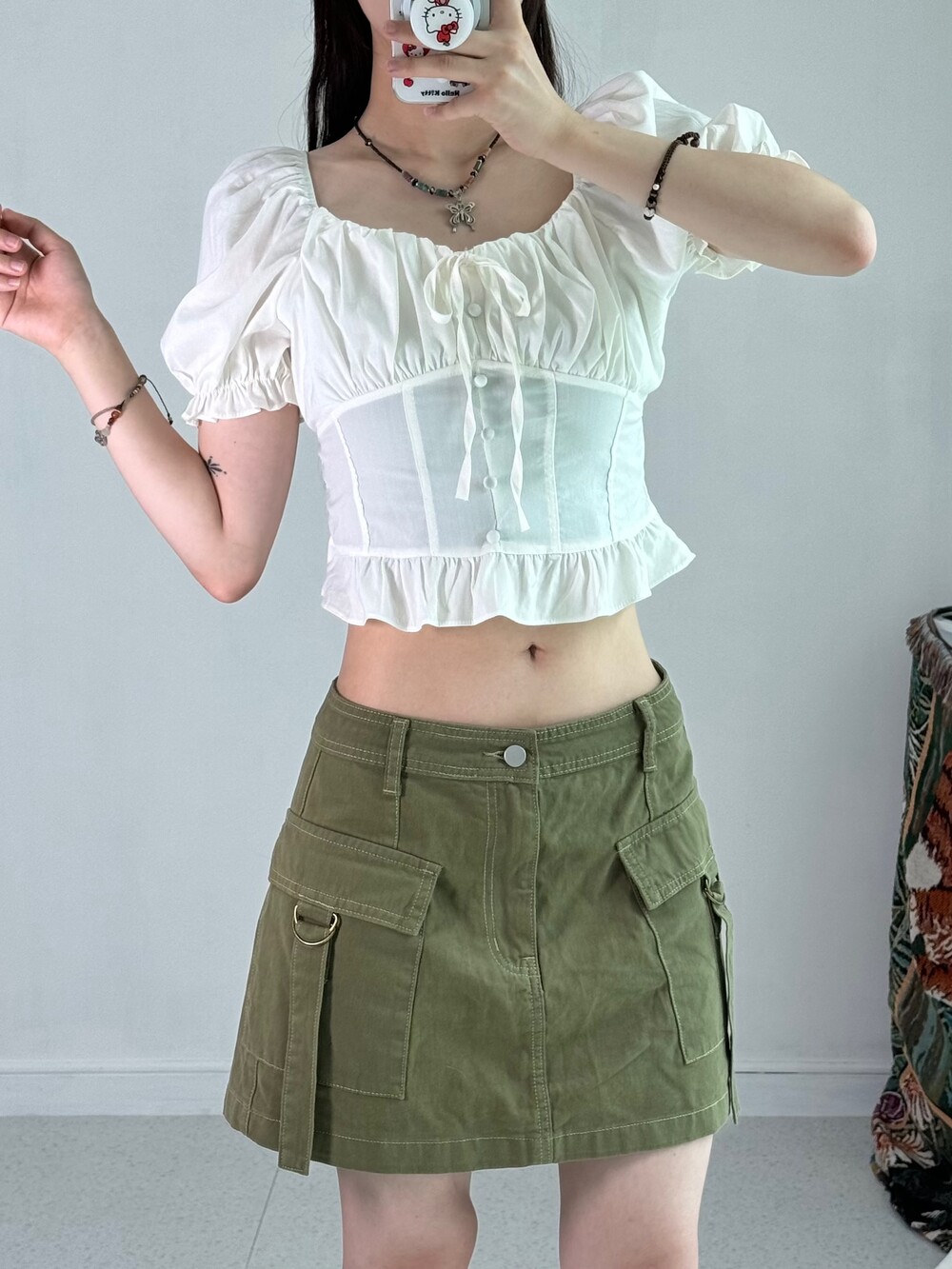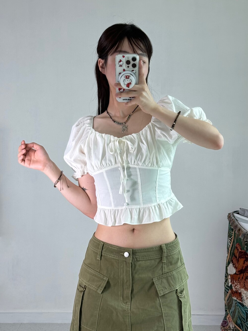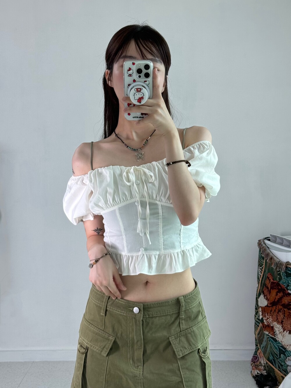 •러블리 페미닌 무드 퍼프 블라우스에요! 크롭기장에 부드러운 원단감이라 착용감이 넘 좋아요ㅎㅎ 오프숄더도 가능!