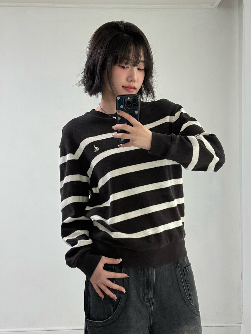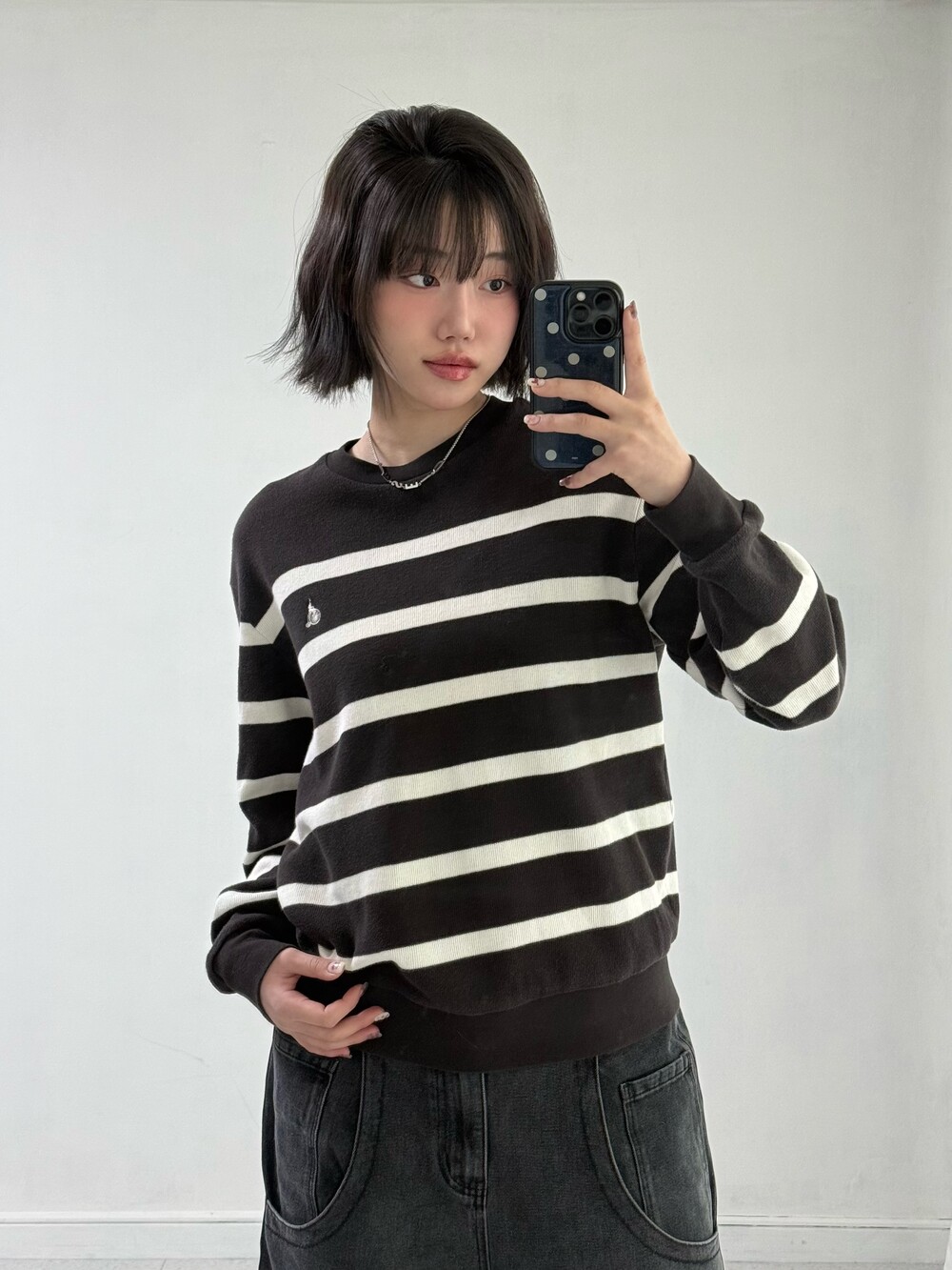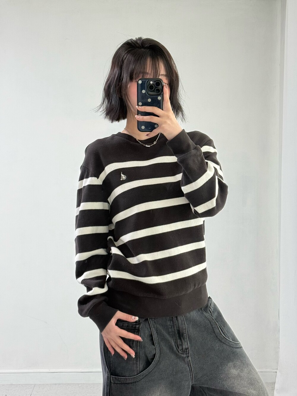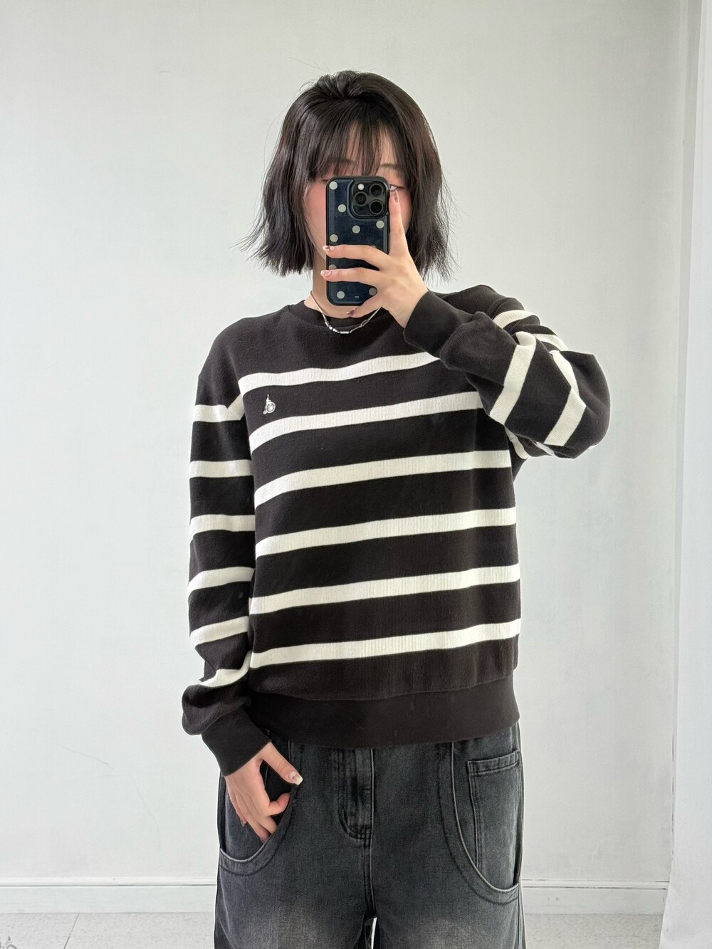 •빈폴 뮤트 딥브라운 스트라이프 니트 입니다. 색감이 정말 예뻐요! 핏도 살짝 널널한 정핏으로 착용감도 편한 아이템이에요:)