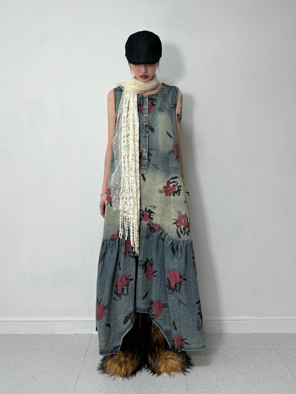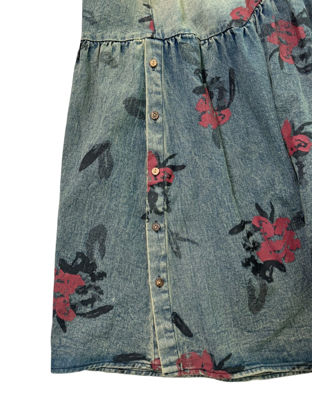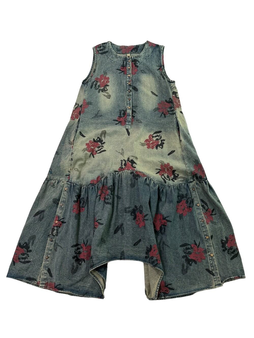•맥시한 기장감의 플라워 데님 원피스 입니다! 기장감이 언발란스 하면서 밑단 사이드에는 단추 디테일까지 들어가있는 아주 귀여운 제품이에요! 워싱도 빈티지스러우면서 넘 예쁘지 않나요>,<