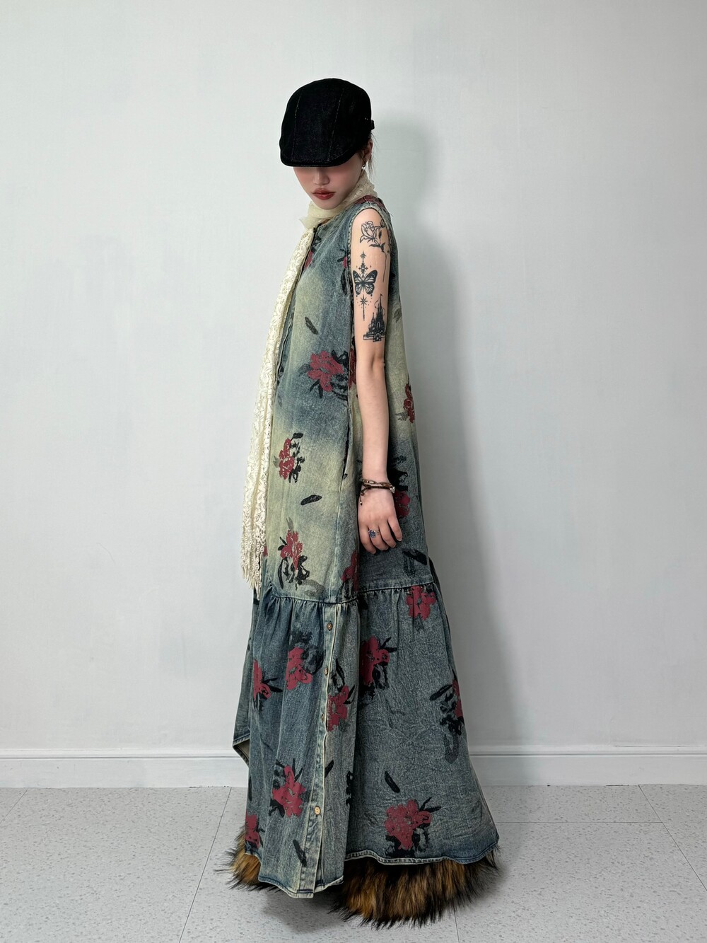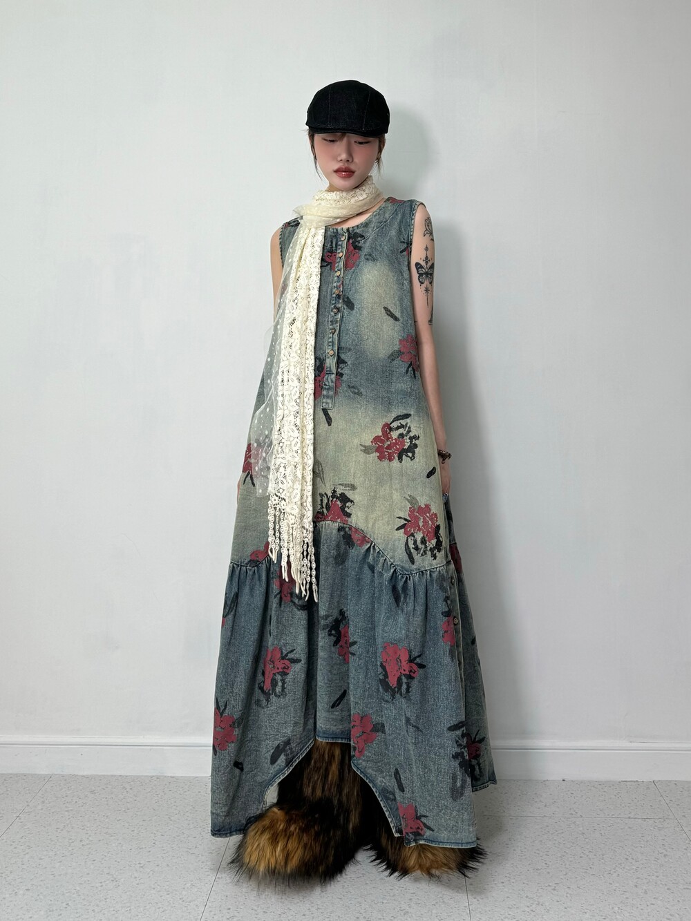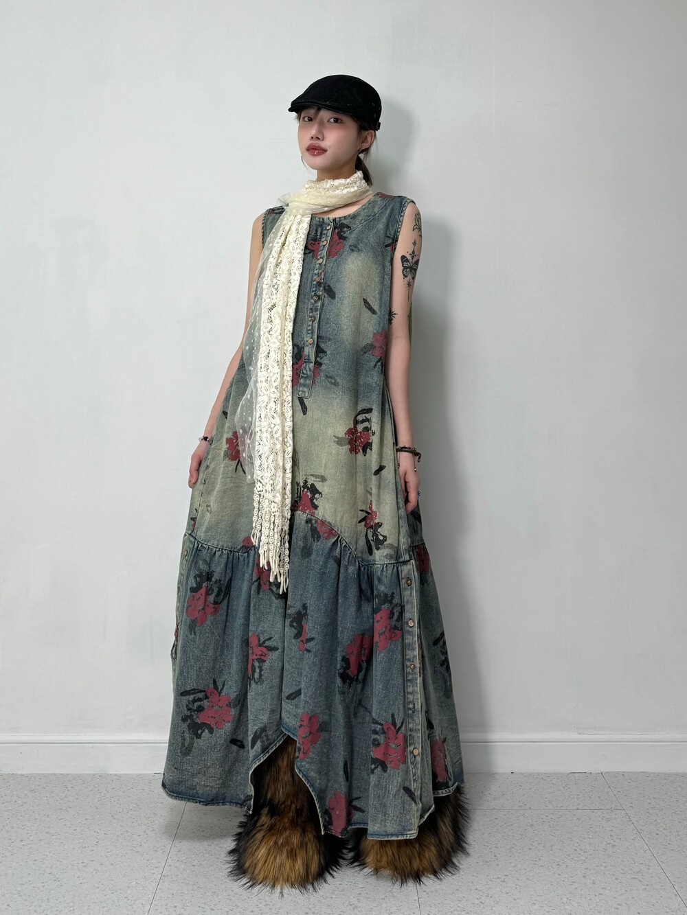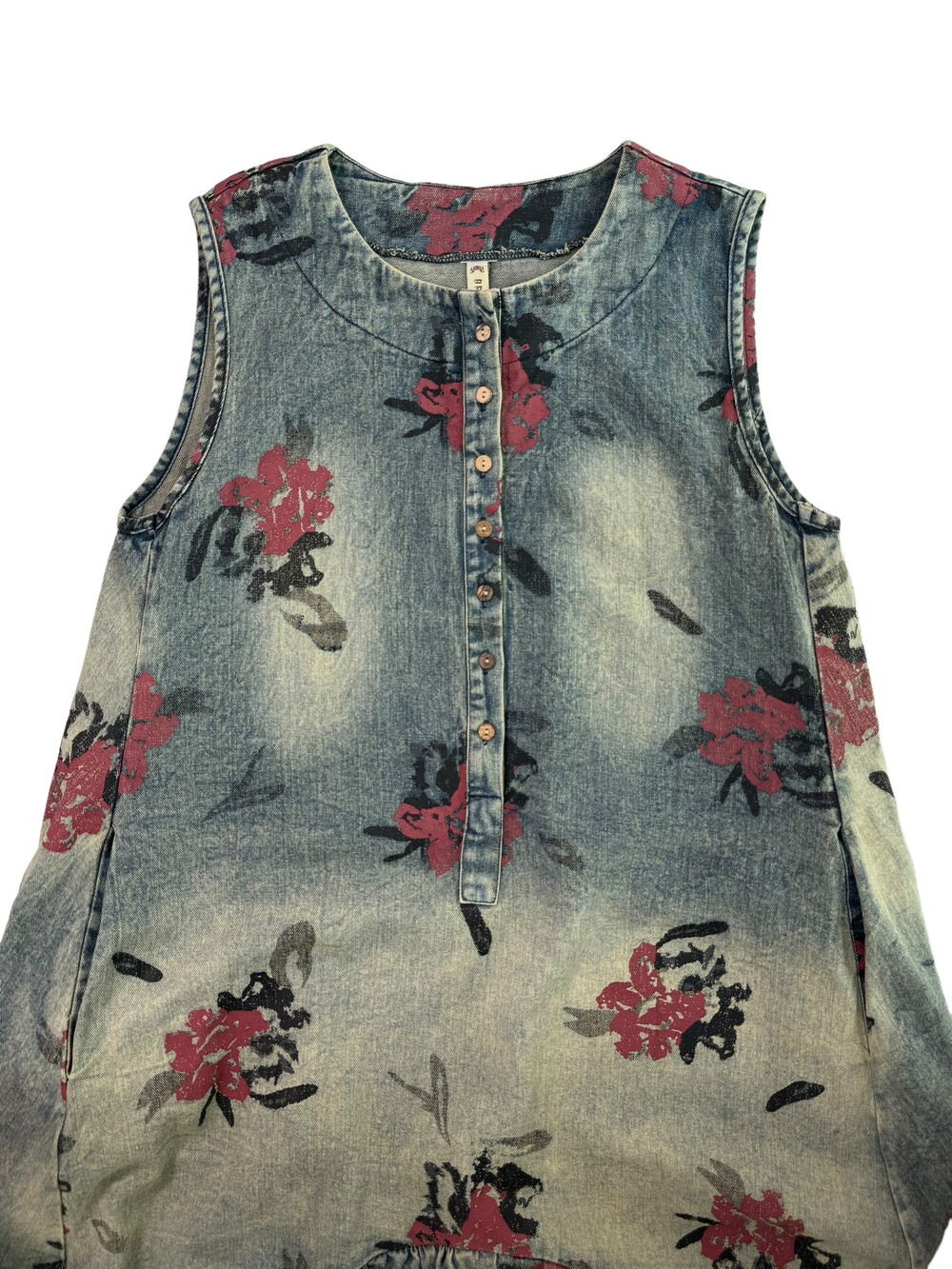 •맥시한 기장감의 플라워 데님 원피스 입니다! 기장감이 언발란스 하면서 밑단 사이드에는 단추 디테일까지 들어가있는 아주 귀여운 제품이에요! 워싱도 빈티지스러우면서 넘 예쁘지 않나요>,<