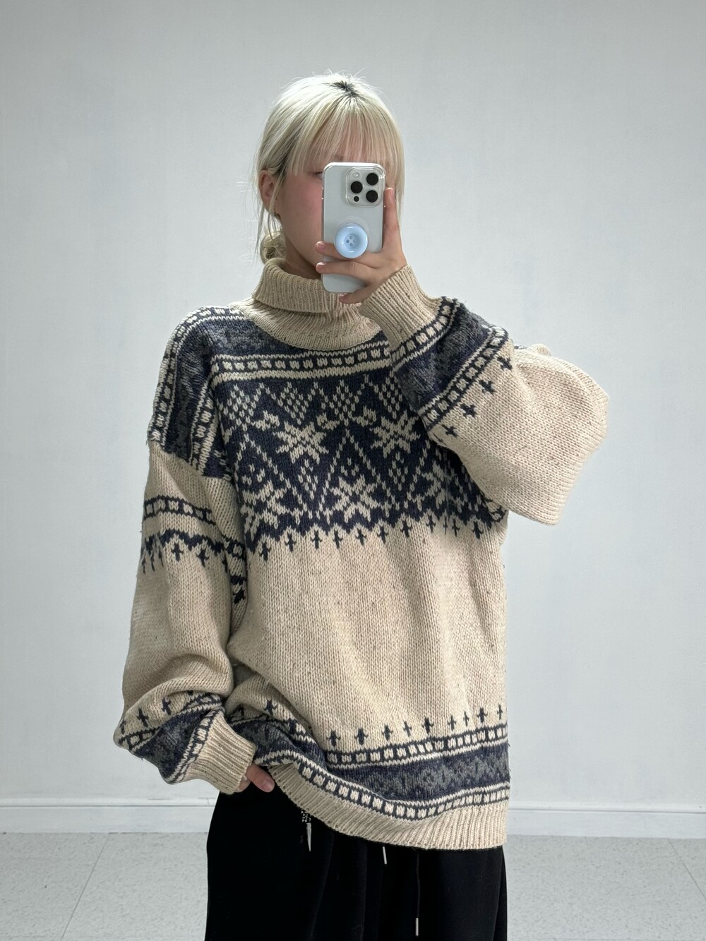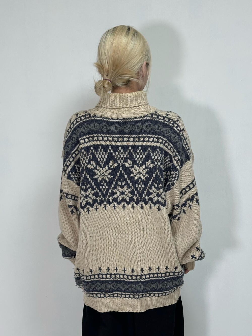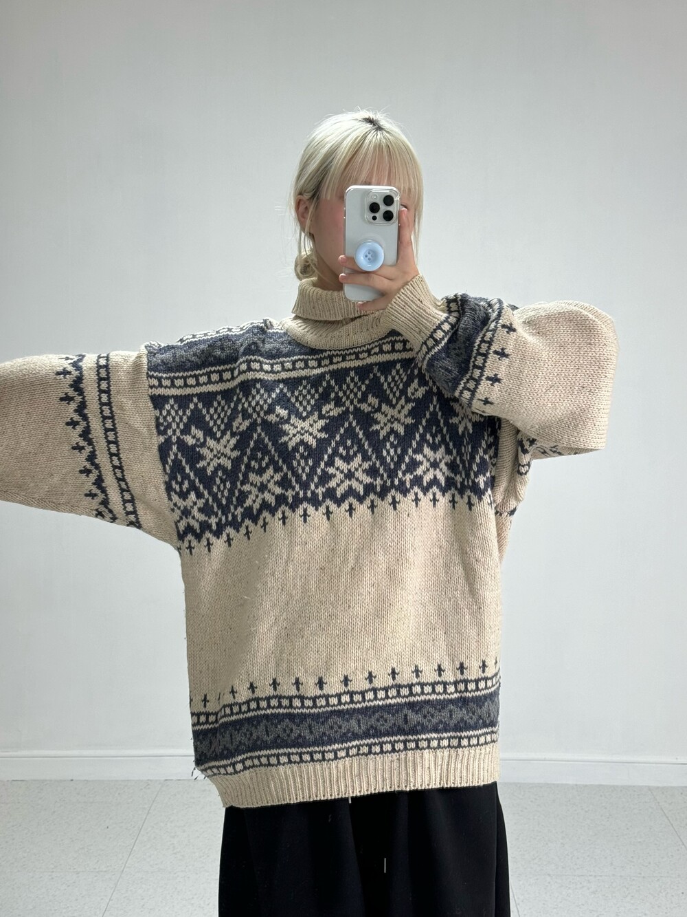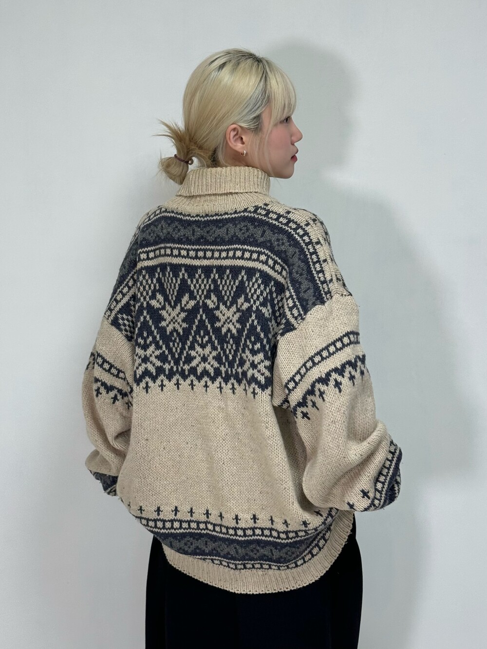 •큼지막한 노르딕 패턴들이 빈티지스러움과 멋스러움을 더해줍니다! 반목폴라로 널널하게 착용되어 오히려 좋은 대박적 니트에요 🖤