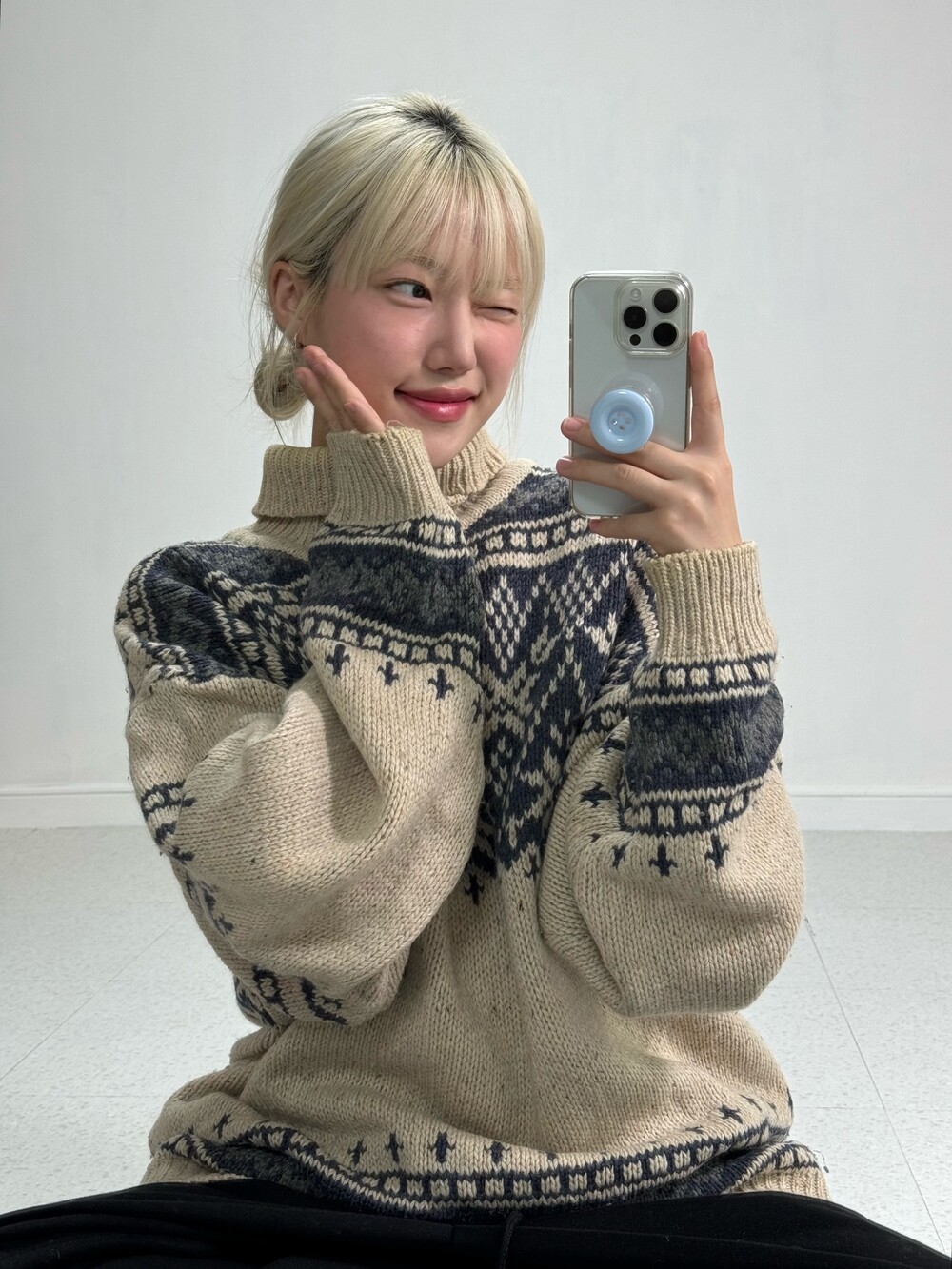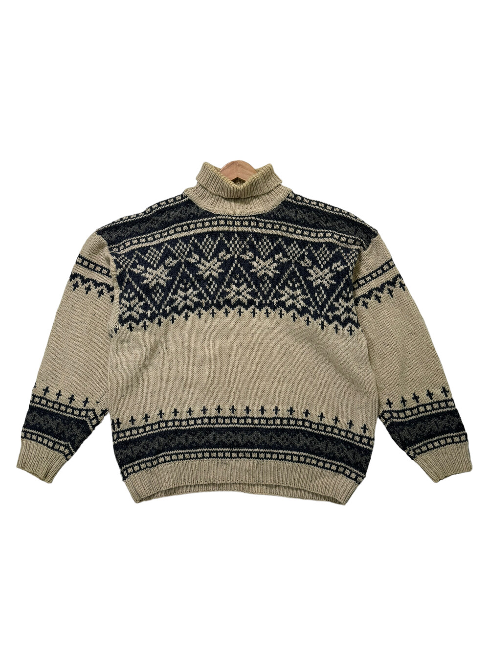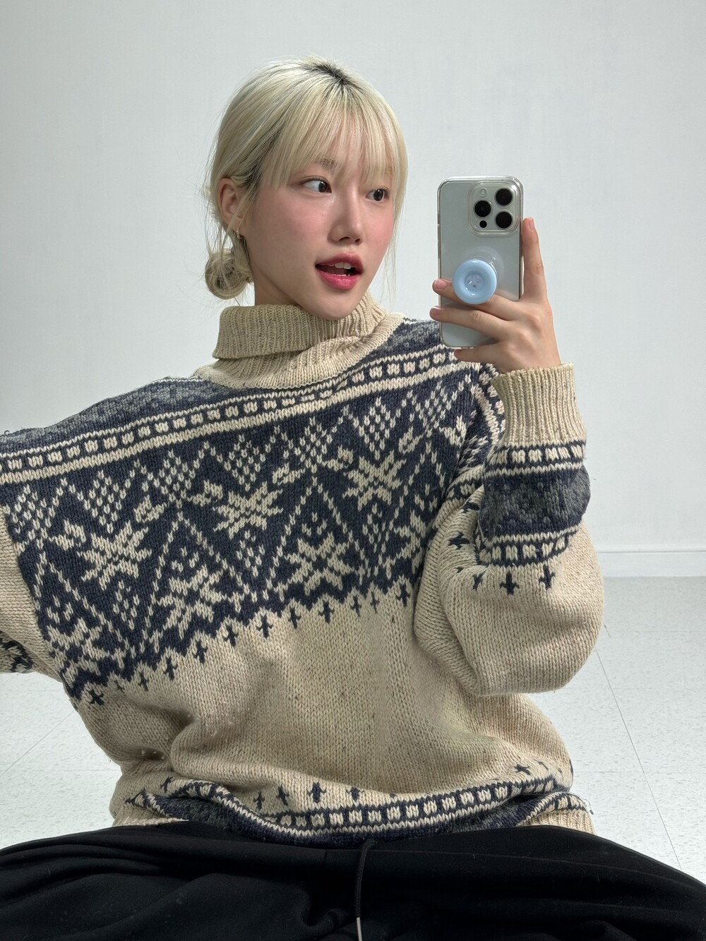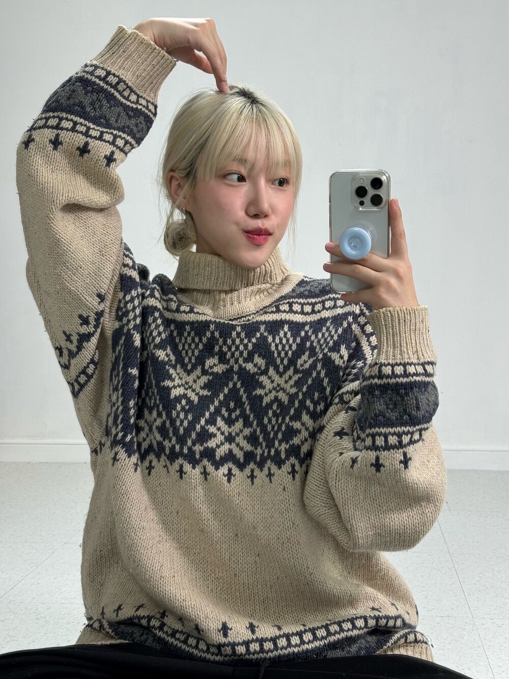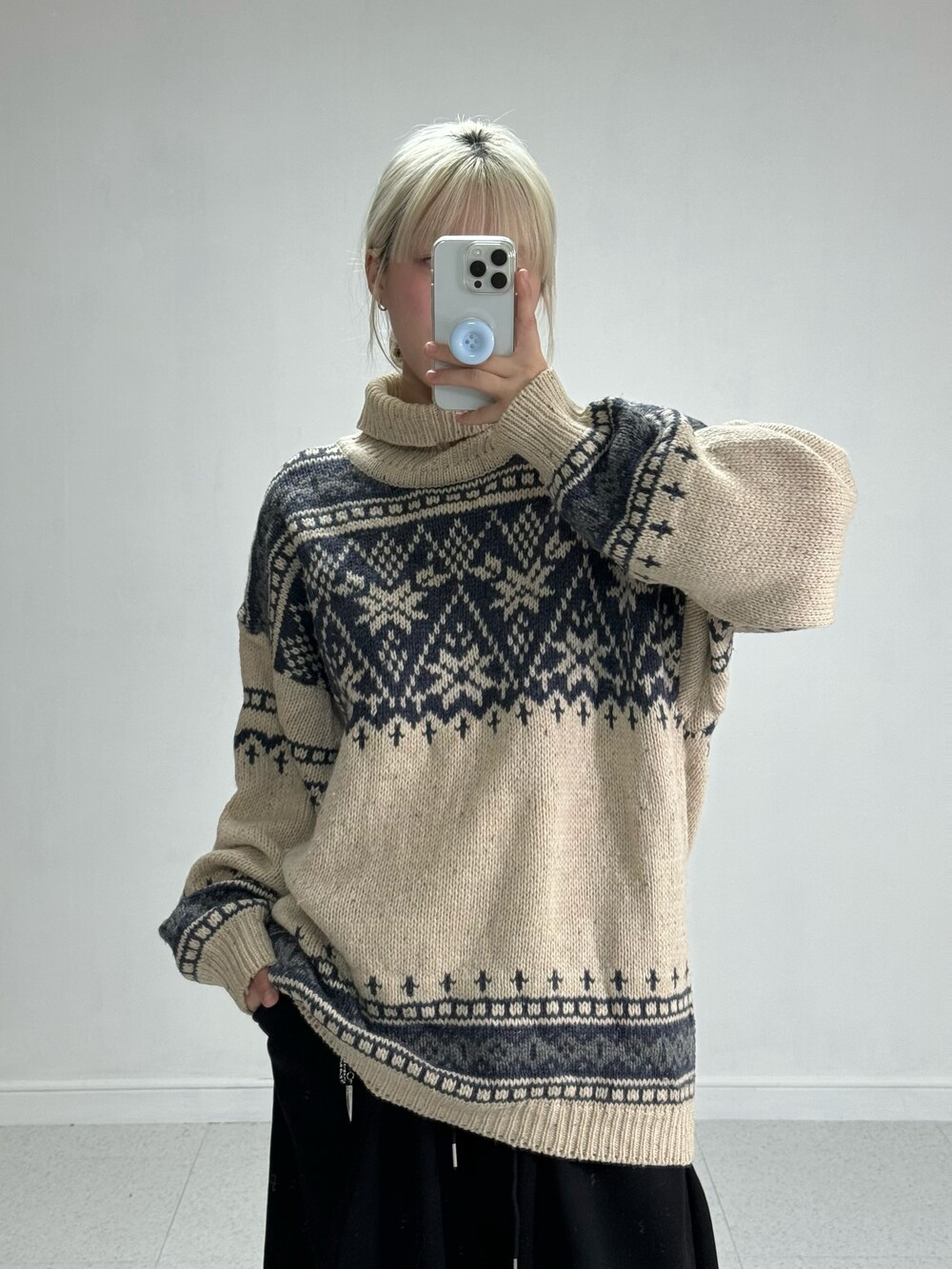 •큼지막한 노르딕 패턴들이 빈티지스러움과 멋스러움을 더해줍니다! 반목폴라로 널널하게 착용되어 오히려 좋은 대박적 니트에요 🖤