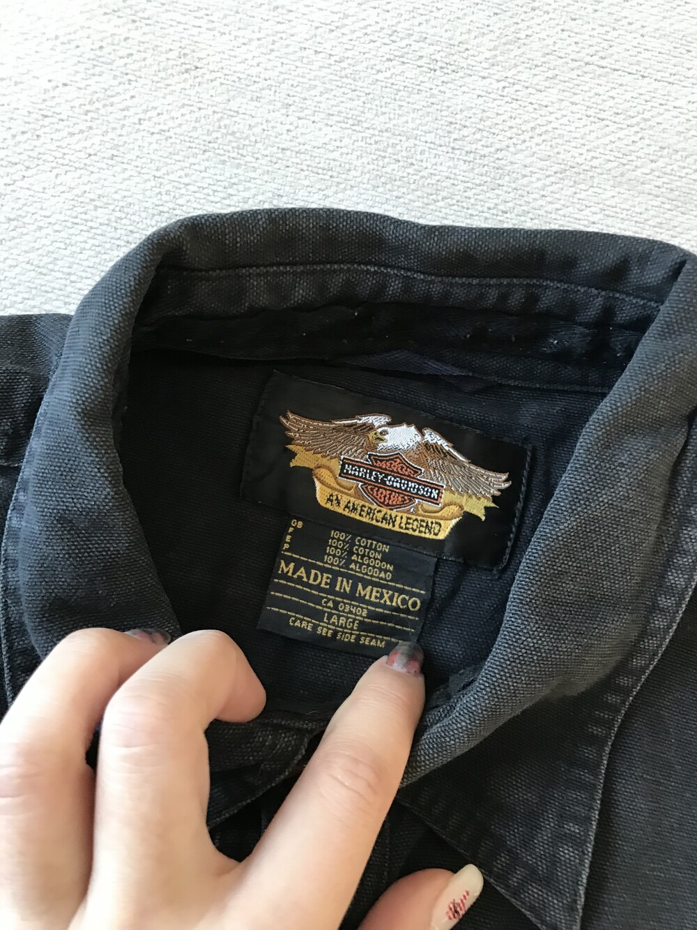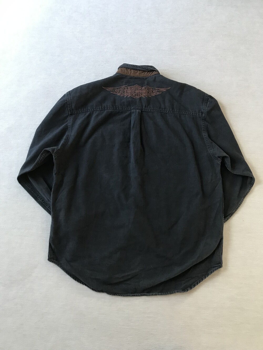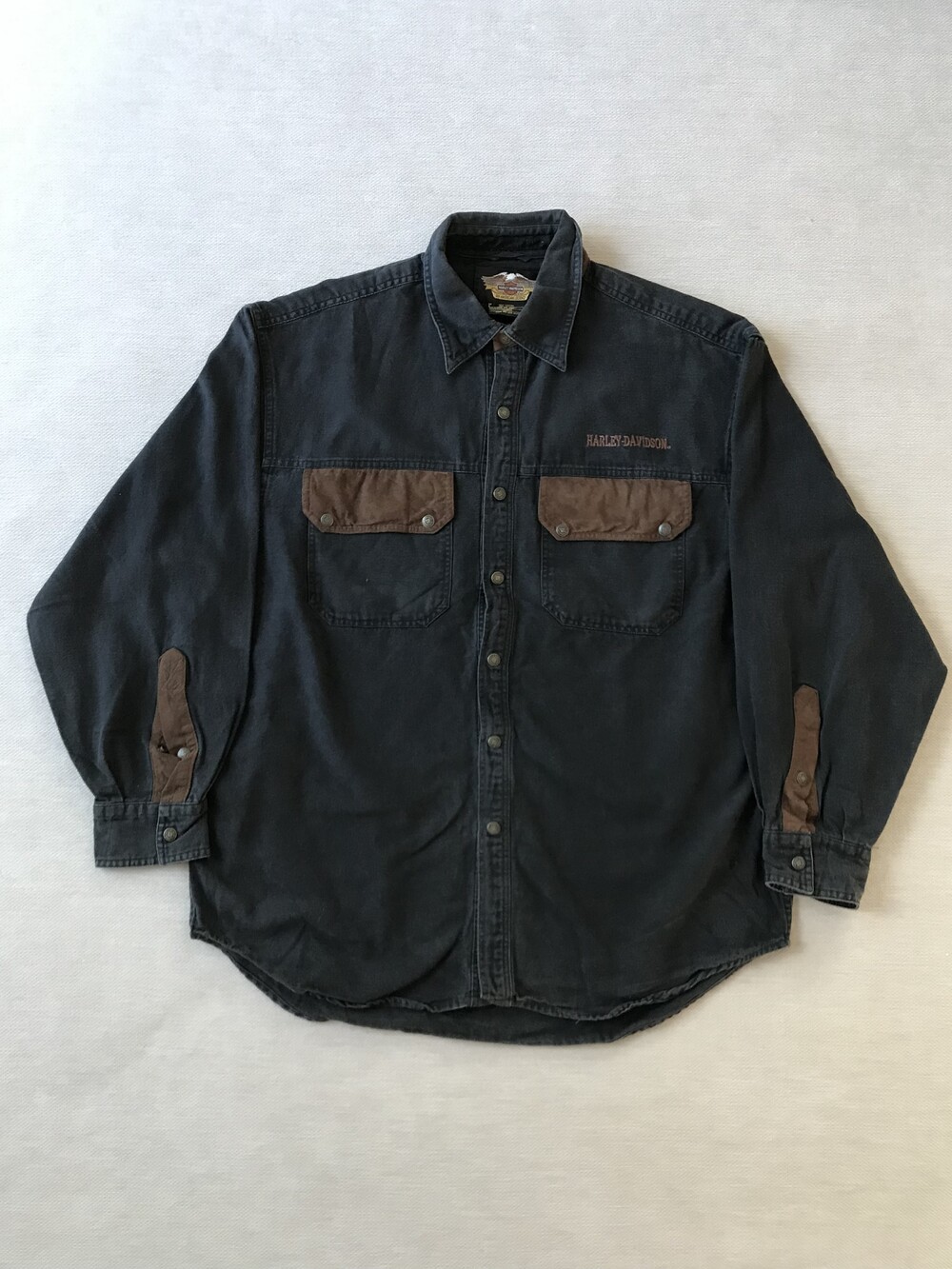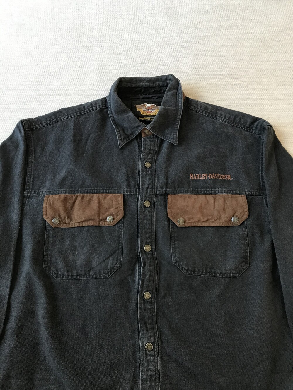•할리데이비슨 네이비 셔츠 입니다. 브라운 컬러로 포인트 되어 있어서 너무 예뻐요! 앞주머니 포켓은 스웨이드+ 로고는 브라운 자수에요🙈