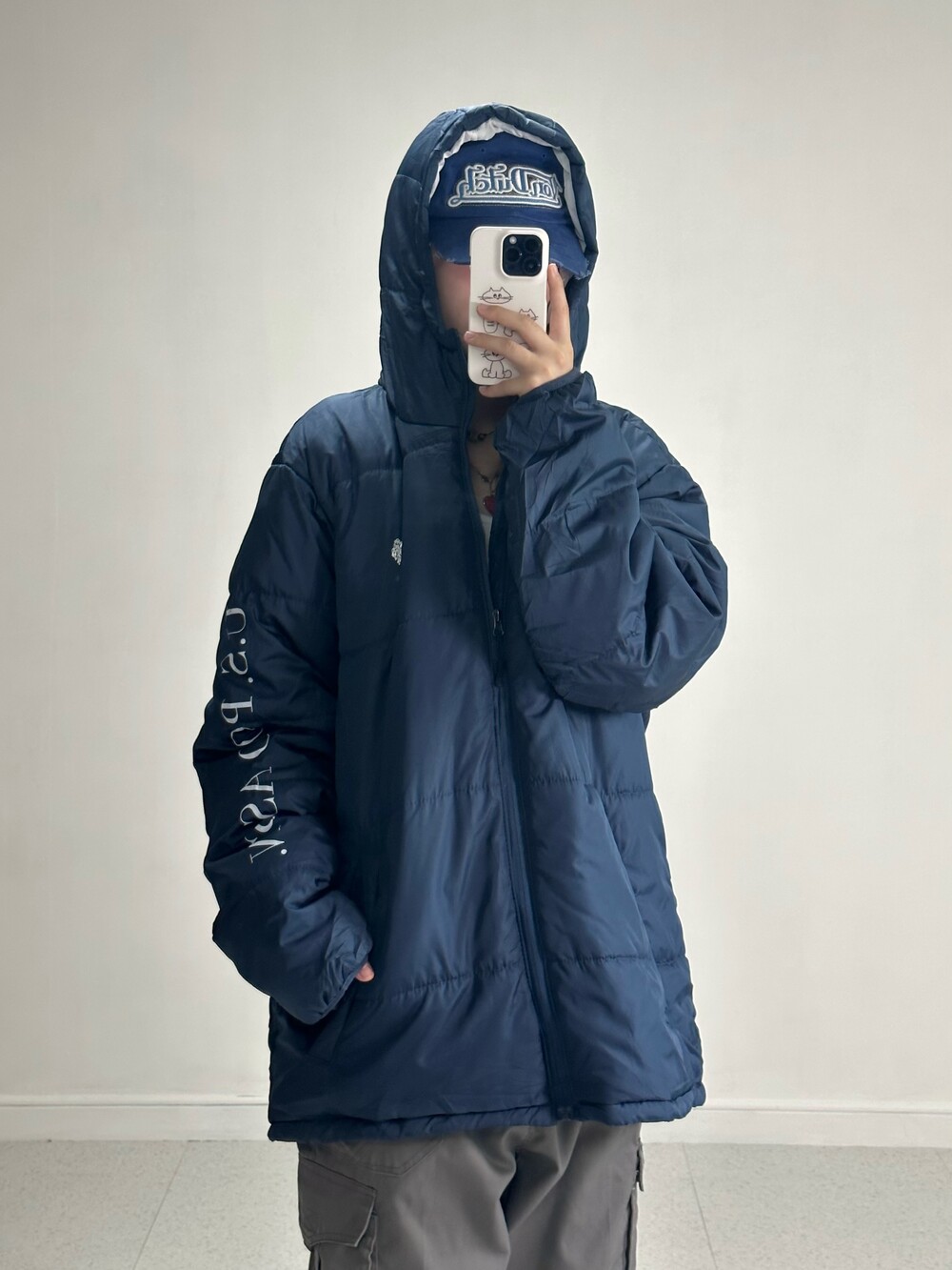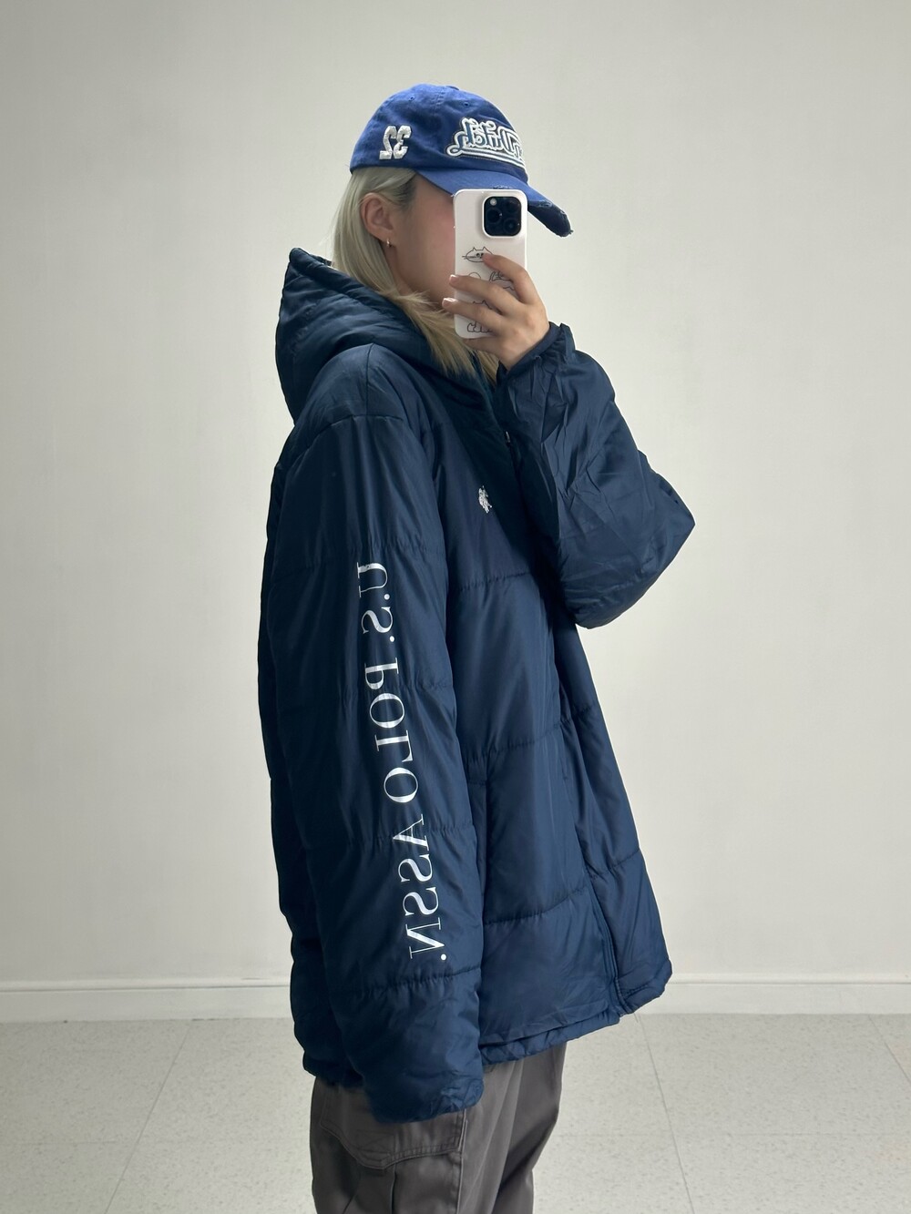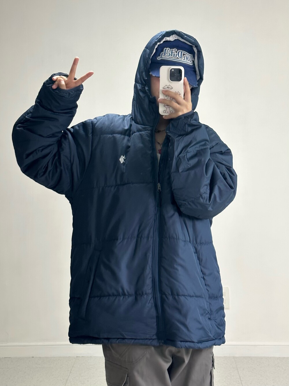 •네이비 컬러 유에스 폴로 패딩입니다! 원단은 폴리에스테르 이며 크기에 비해 옷이 가벼운 편이라 착용감이 좋더라구요! 소매쪽 프린팅이 포인트라 아방 귀엽게 착용하기 좋습니다ㅎㅎ 모자도 커서 모자써도 짱 귀엽습니다용..