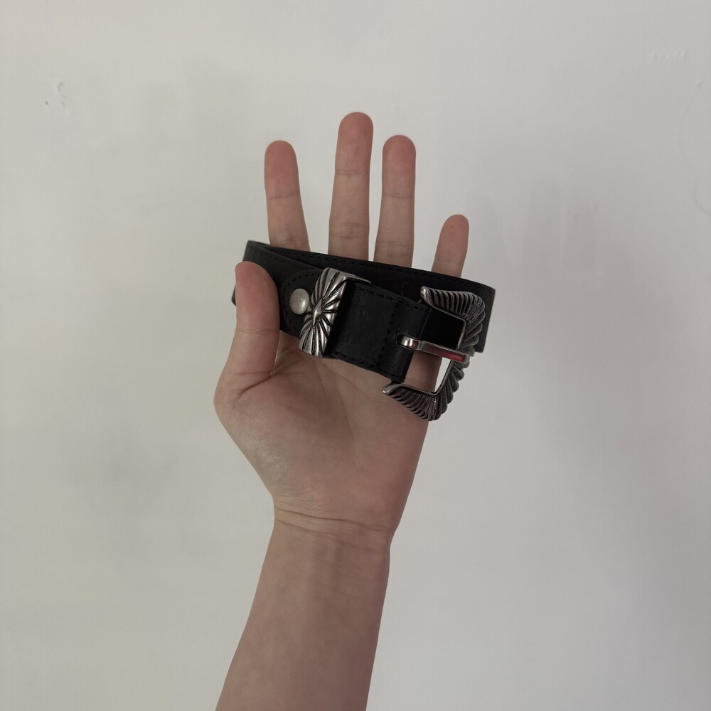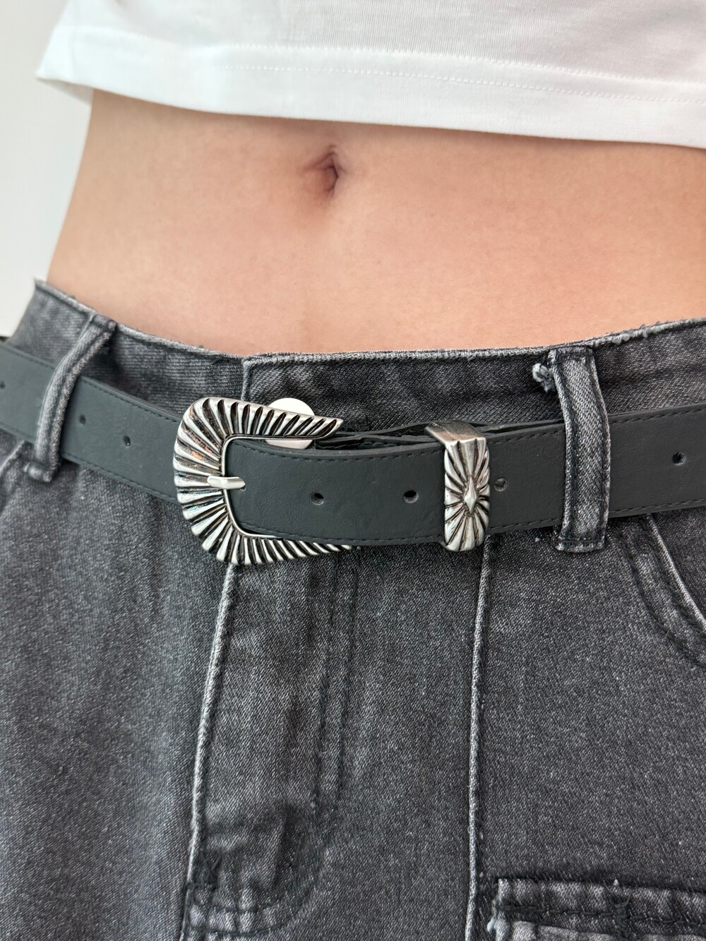 빈티지한 무드의 깔끔한 블랙 실버 벨트 입니다. 크게 코디 타지 않는 제품이라 여기저기 착용하기 좋습니다!
