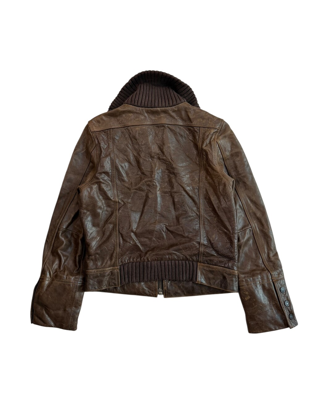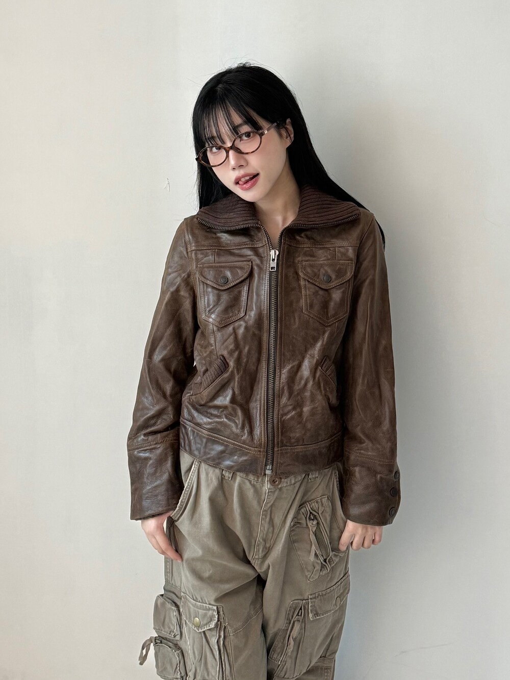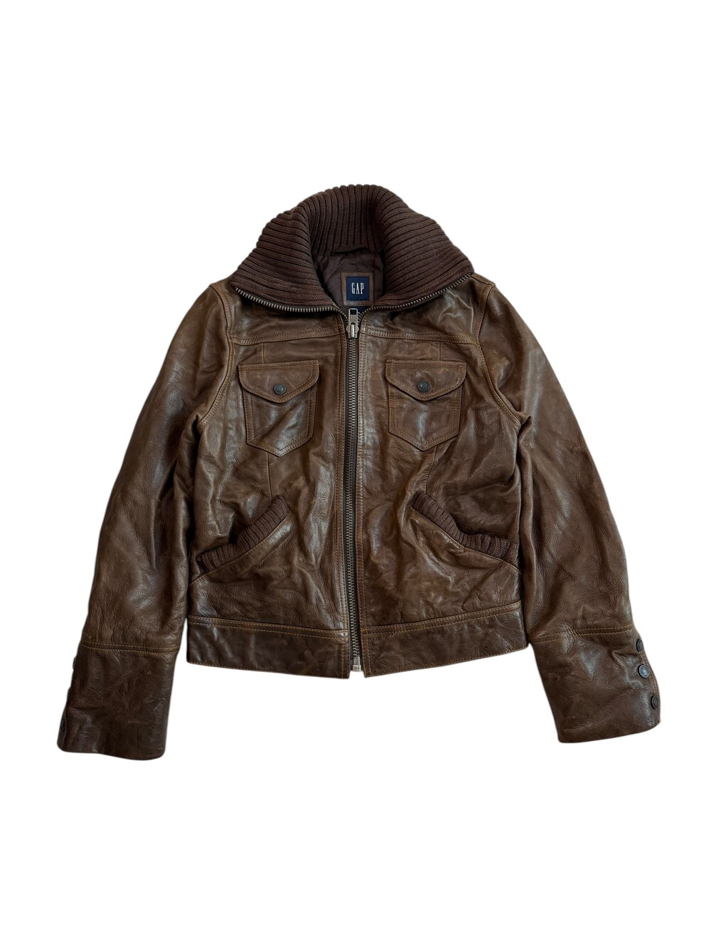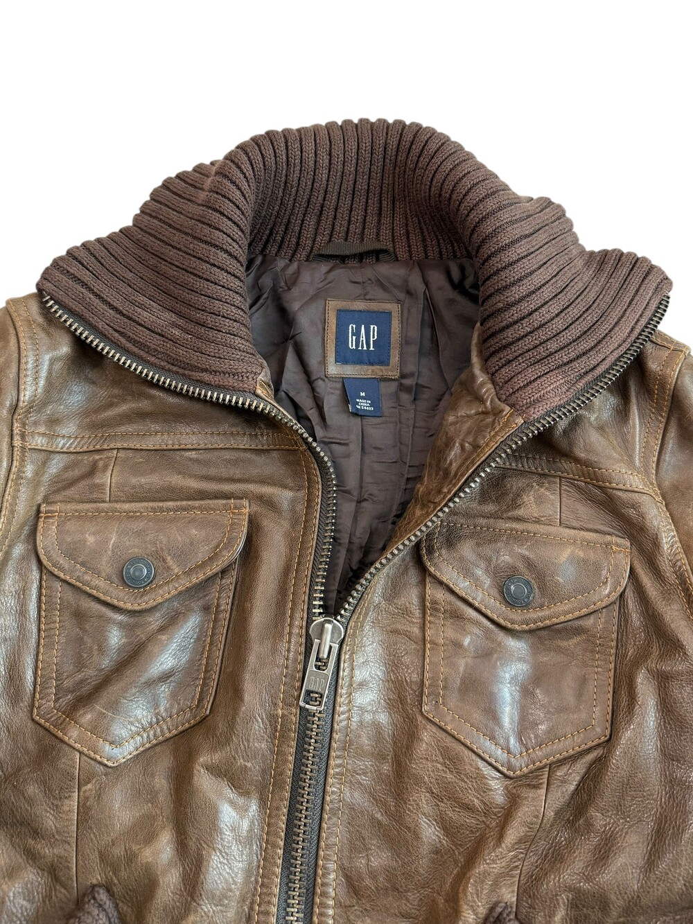 •갭 브라운 레더 자켓입니다. 소가죽 100% 이며 니트소재가 소매와 넥부분에 들어가있어 더욱 따뜻하고 고급스러운 이미지를 연출하실 수 있어요! 😎