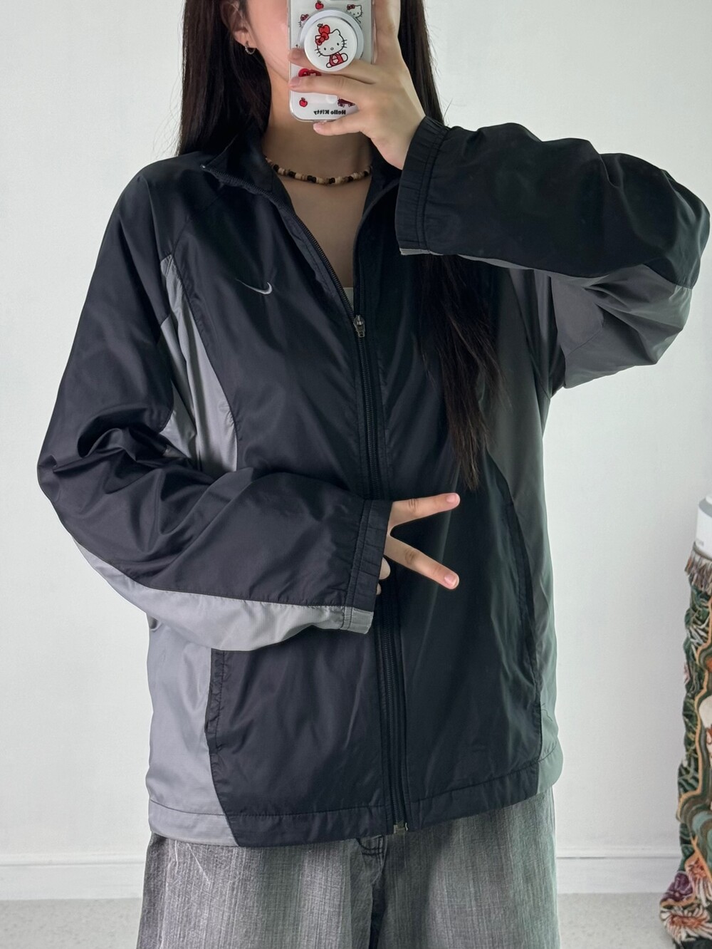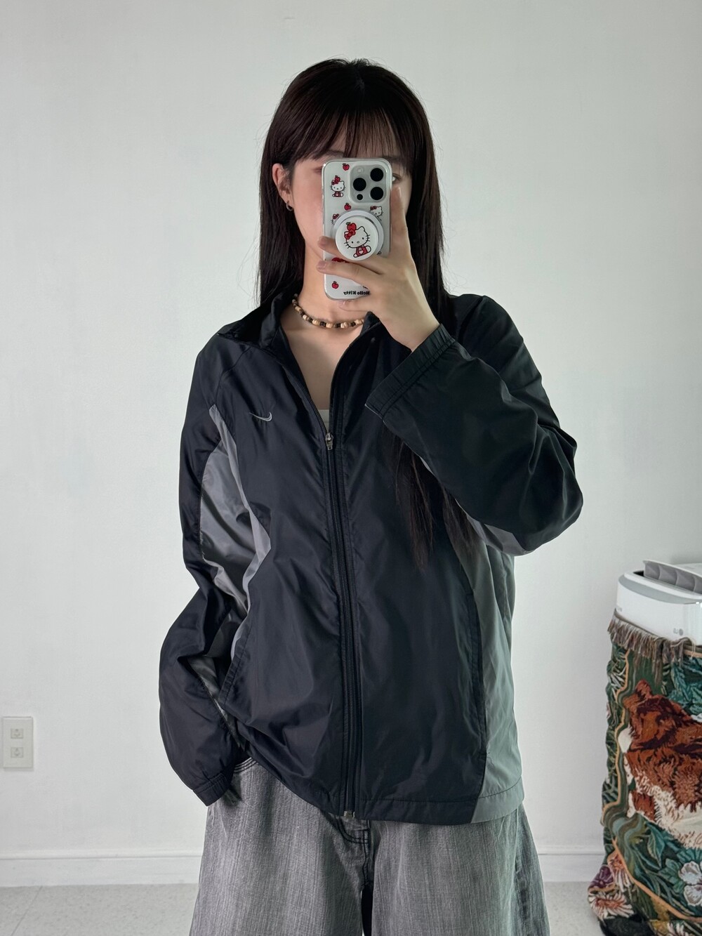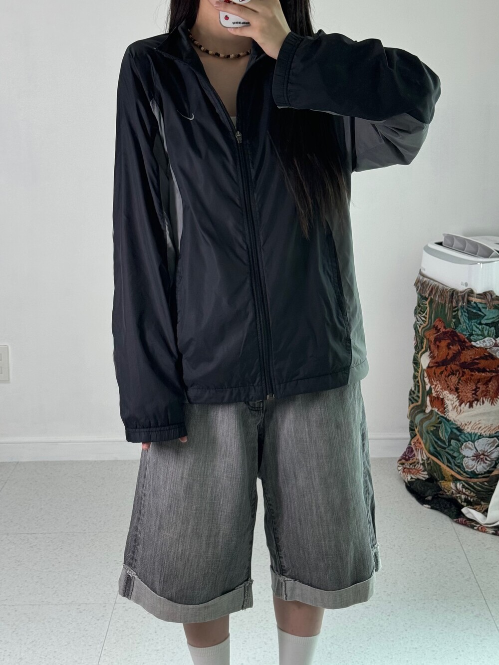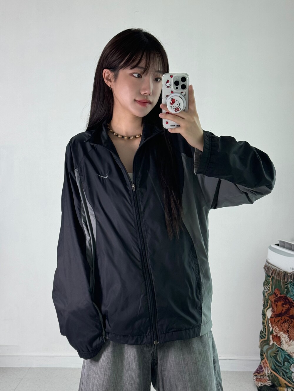 •블랙+그레이 조합의 무채색 나이키 바막이에요! 밑단 스트링도 있어서 원하시는 기장감으로 연출해주시면 됩니닷 ㅎㅎ