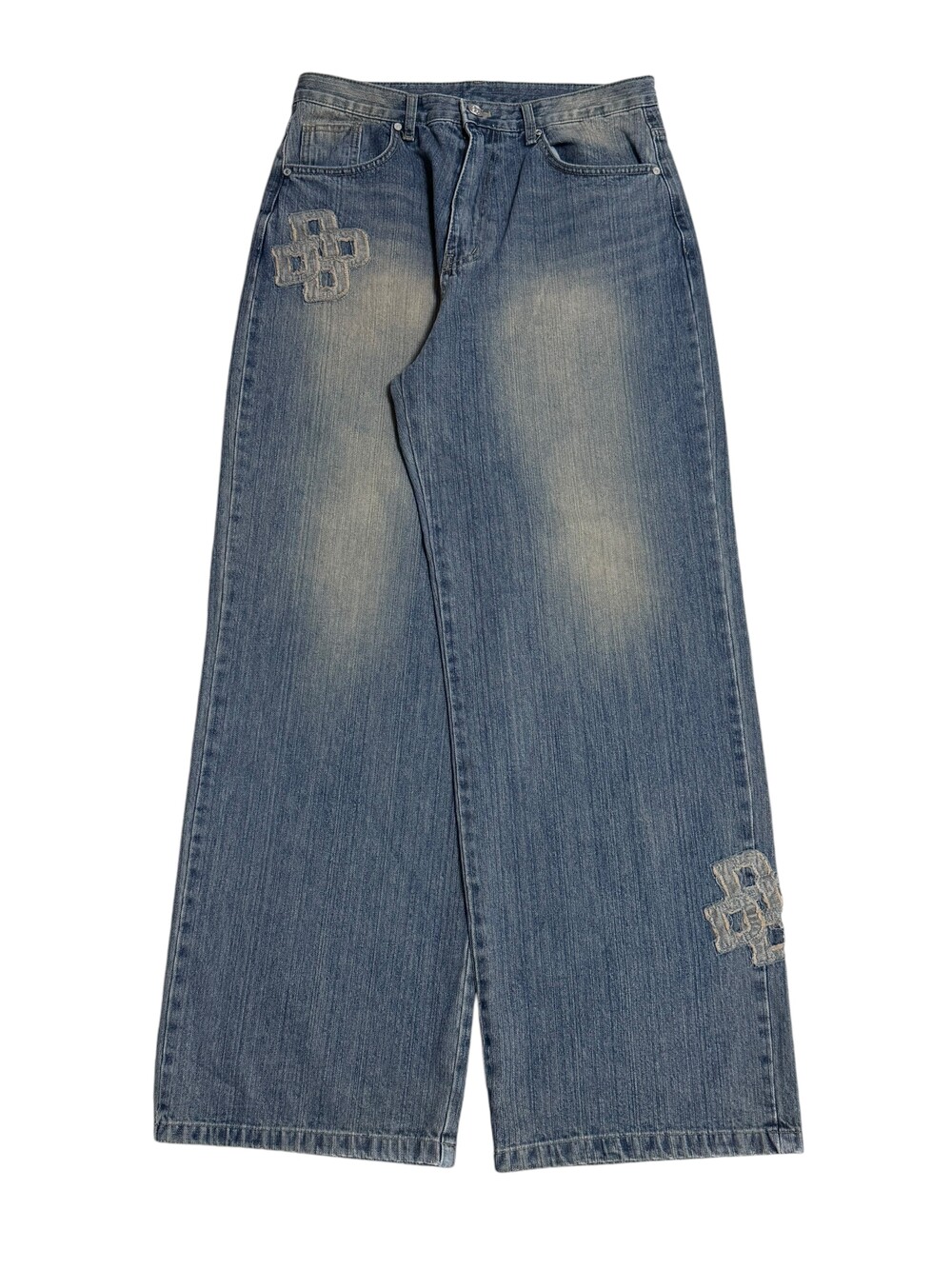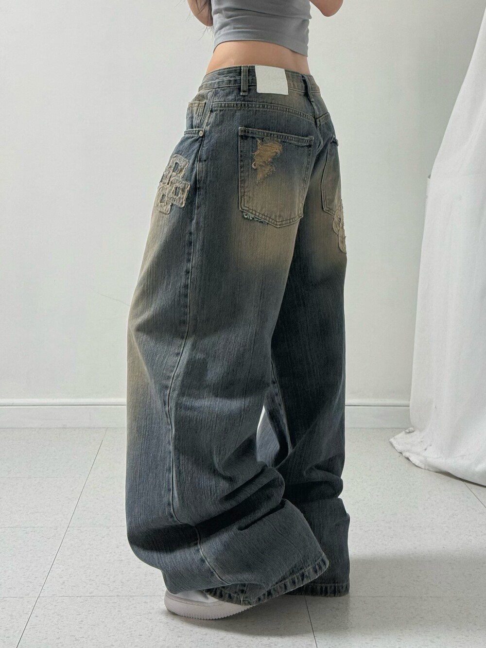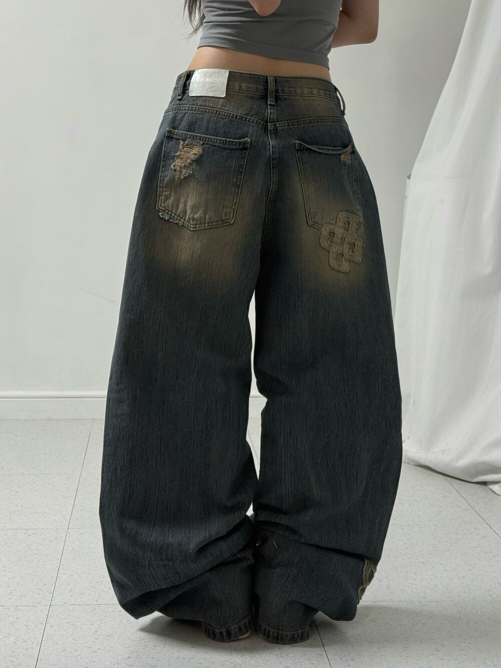 •워싱감이 너무 예쁘게 들어가있는 와이드 데님팬츠에요! 허벅지와 밑단에 들어간 패치 디테일이 멋스러운 아이템이랍니다-! 엉덩이도 졸귀 ㅠ!