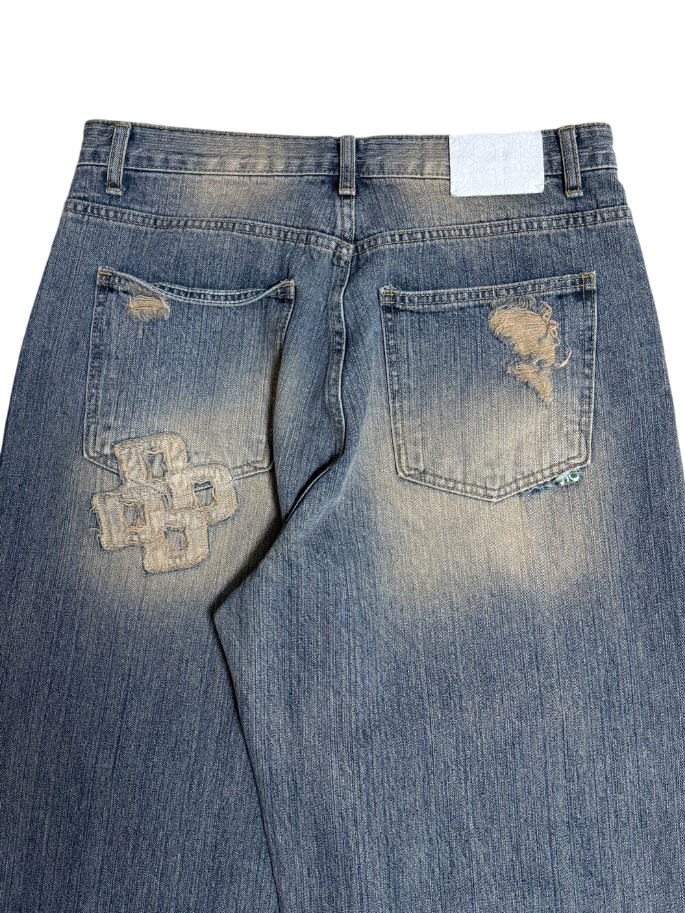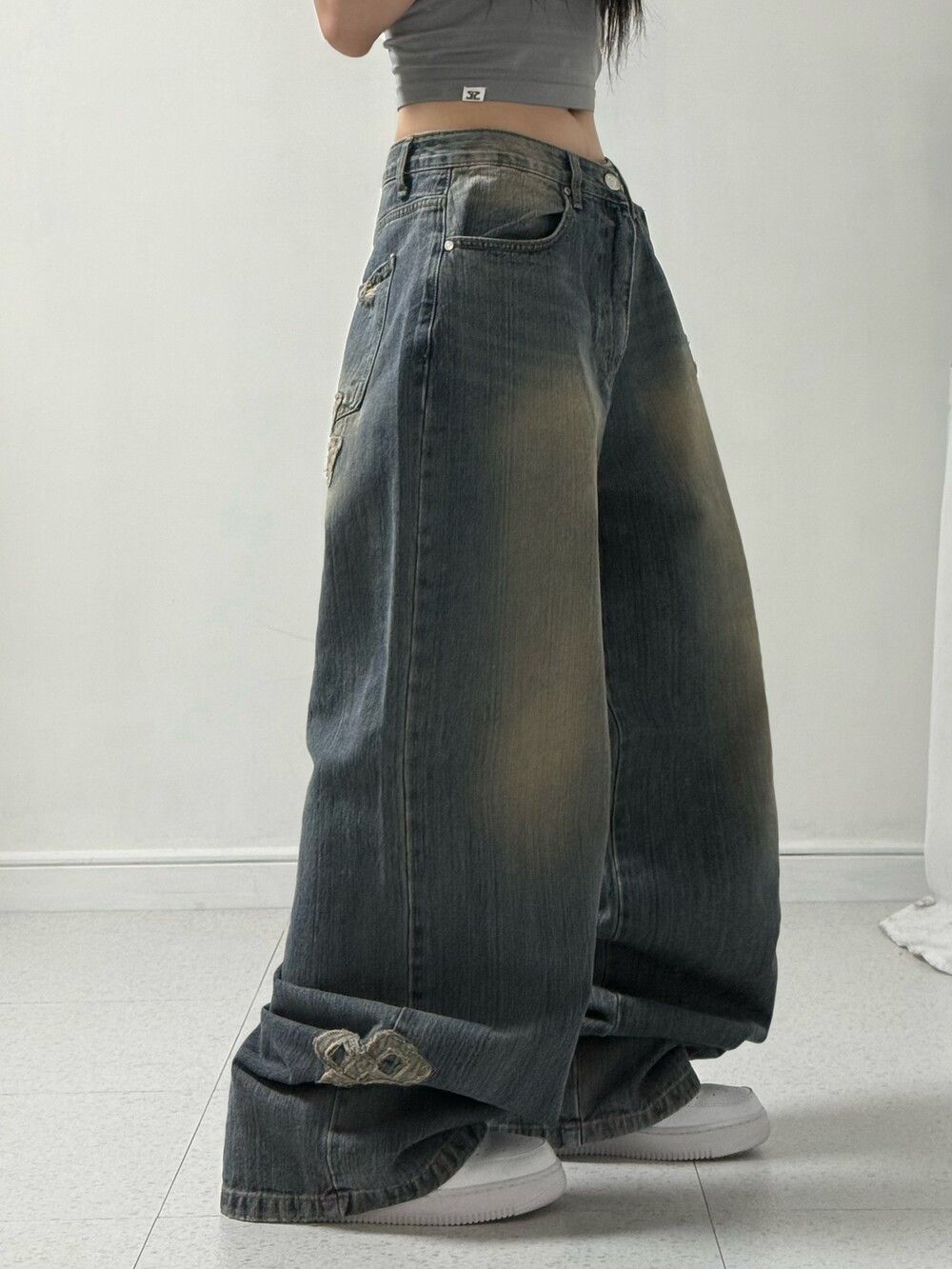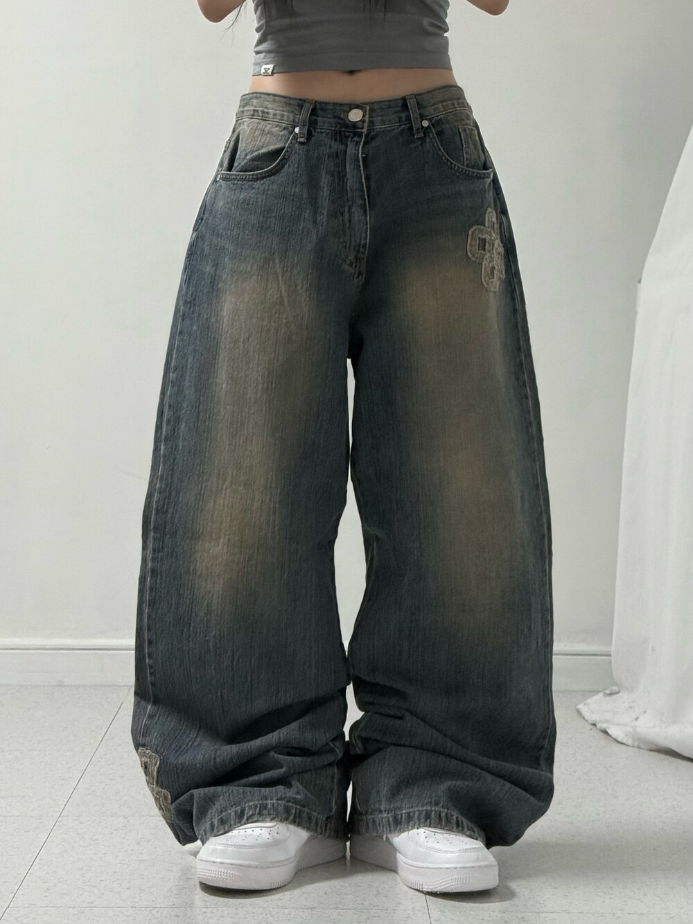 •워싱감이 너무 예쁘게 들어가있는 와이드 데님팬츠에요! 허벅지와 밑단에 들어간 패치 디테일이 멋스러운 아이템이랍니다-! 엉덩이도 졸귀 ㅠ!