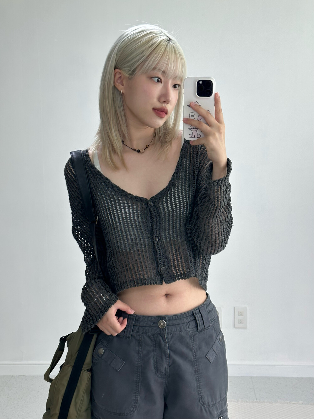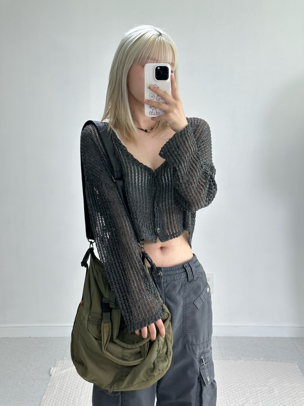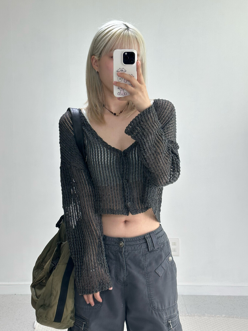 •챠콜컬러의 루즈핏 크롭 가디건이에요! 적당한 크롭기장과 널널함이라 부담없이 착용하기 좋고 섹시하면서 빈티지한 무드까지 꽈악 챙겨가실 수 있습니다>,<