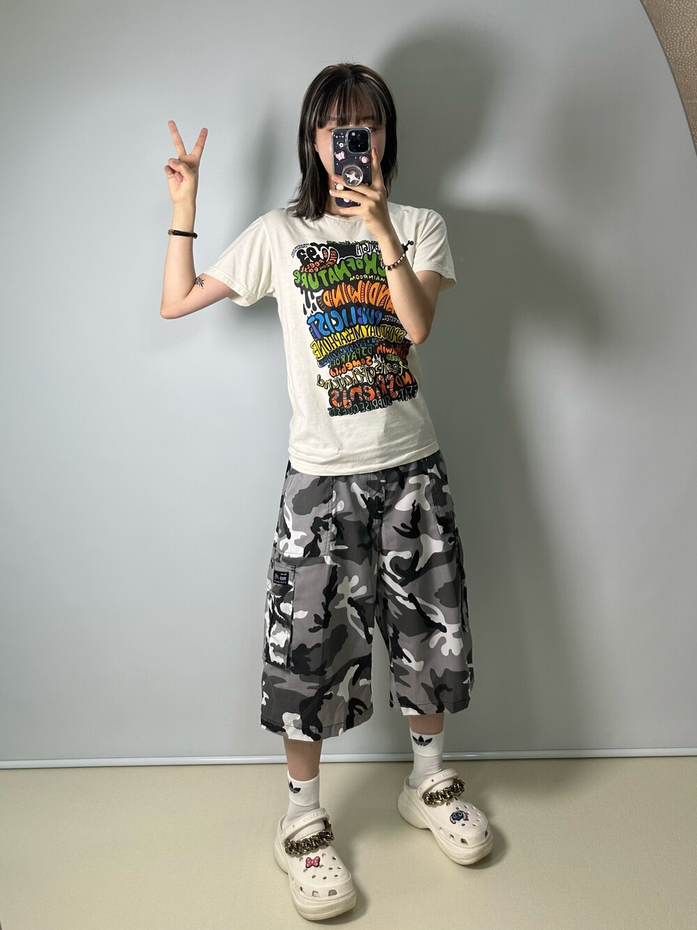 •루즈핏에 정말 예쁜 카모반바지🤍🖤 깔끔 화이트 반팔이랑 매치해도 좋은데 저는 그래피티 디자인 반팔과 매치해주었어요! 그래도 귀엽고 잘어울려서 넘 맘에 들었던 코디랍니다🤍🖤🤍