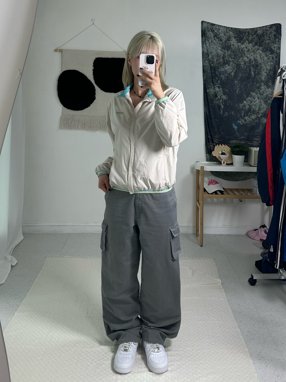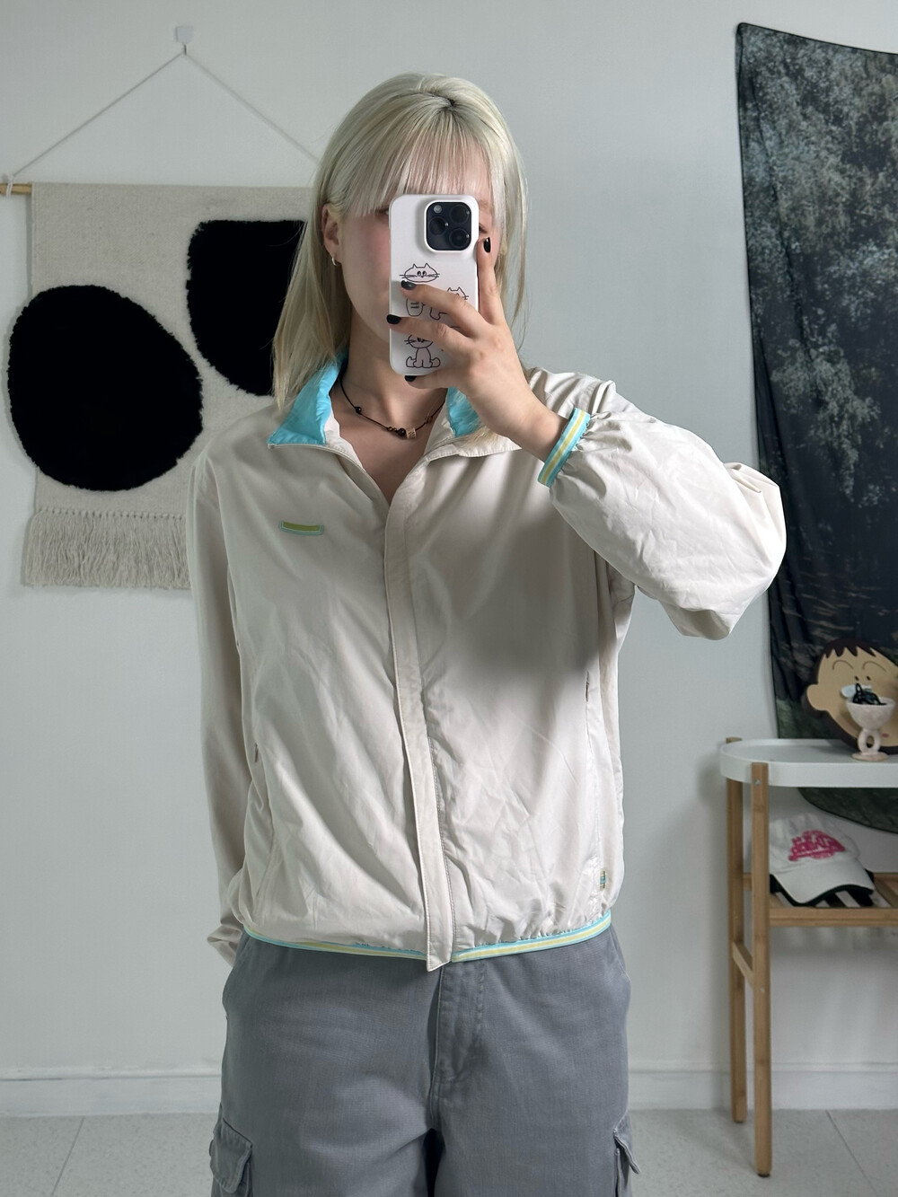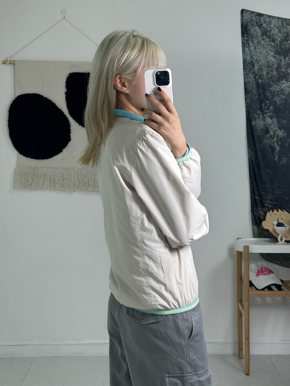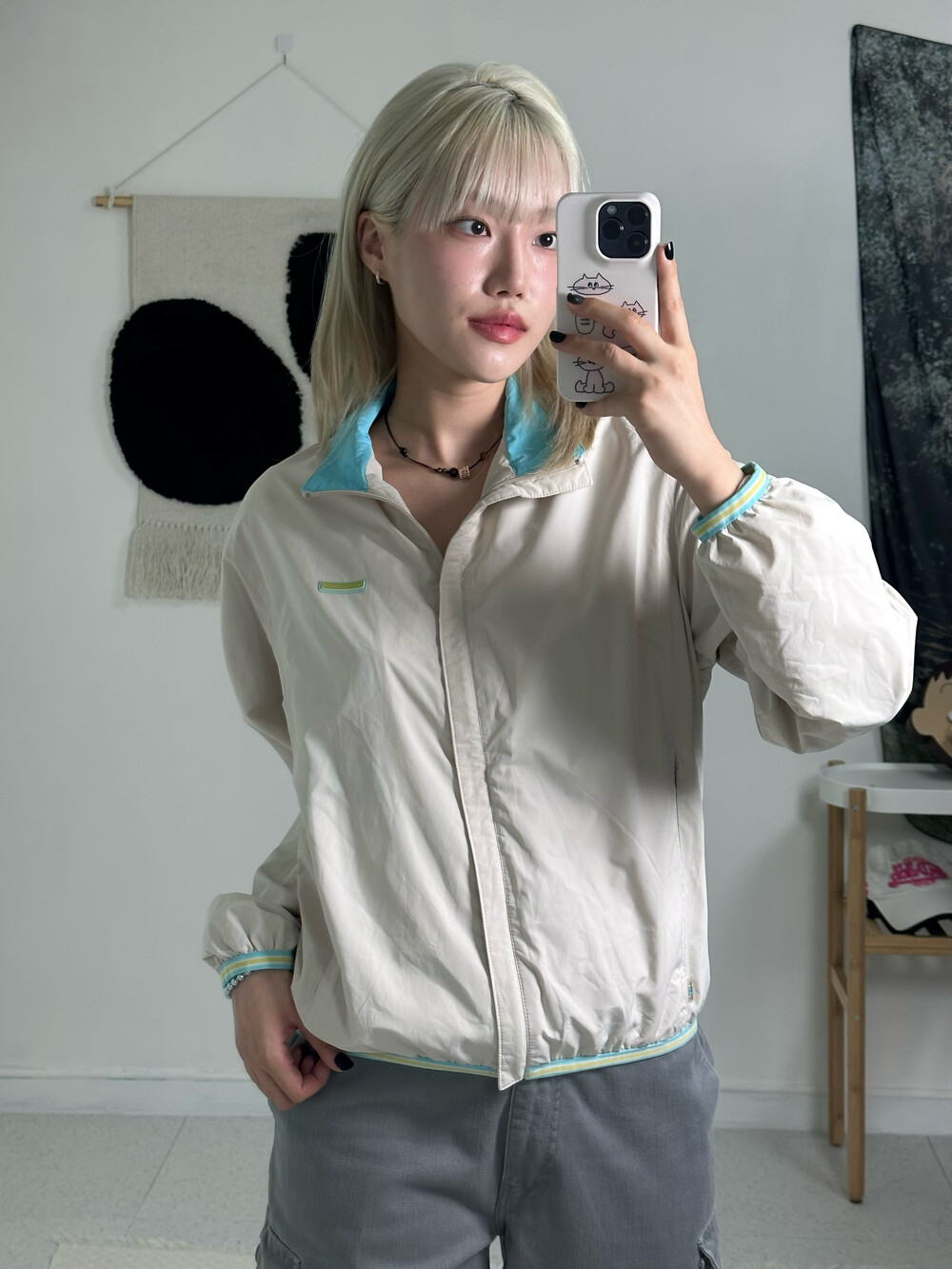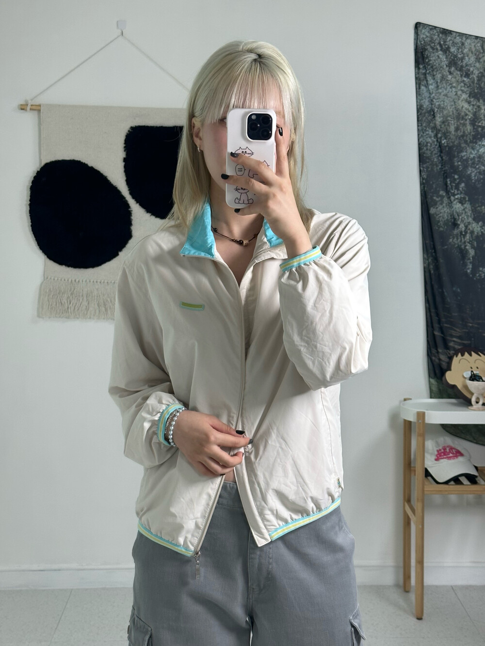 •아이보리와 민트컬러의 조합! 아방방한 핏에 기장감이 짧은편이라 오버사이즈가 부담스럽지만 아방방핏을 좋아하시는분께 추천 드려요! ㅎㅎ밑단 시보리도 짱짱 !