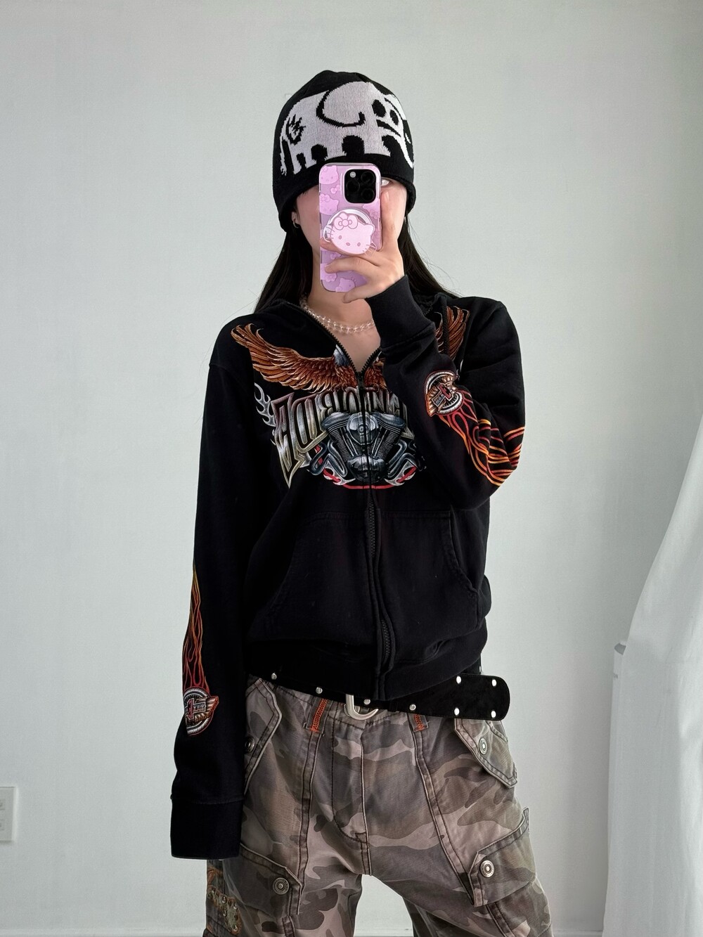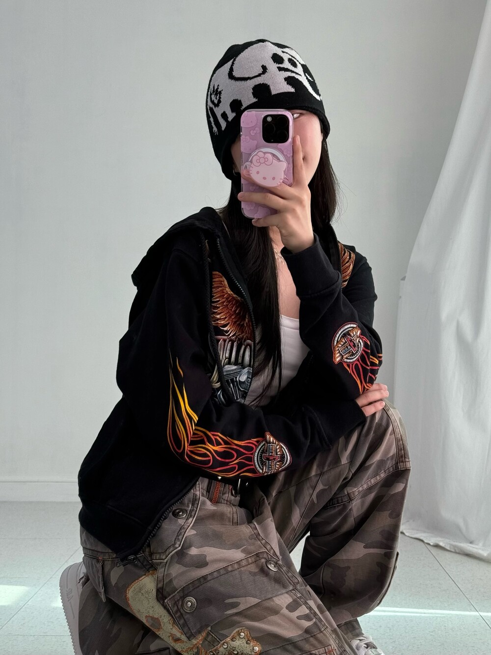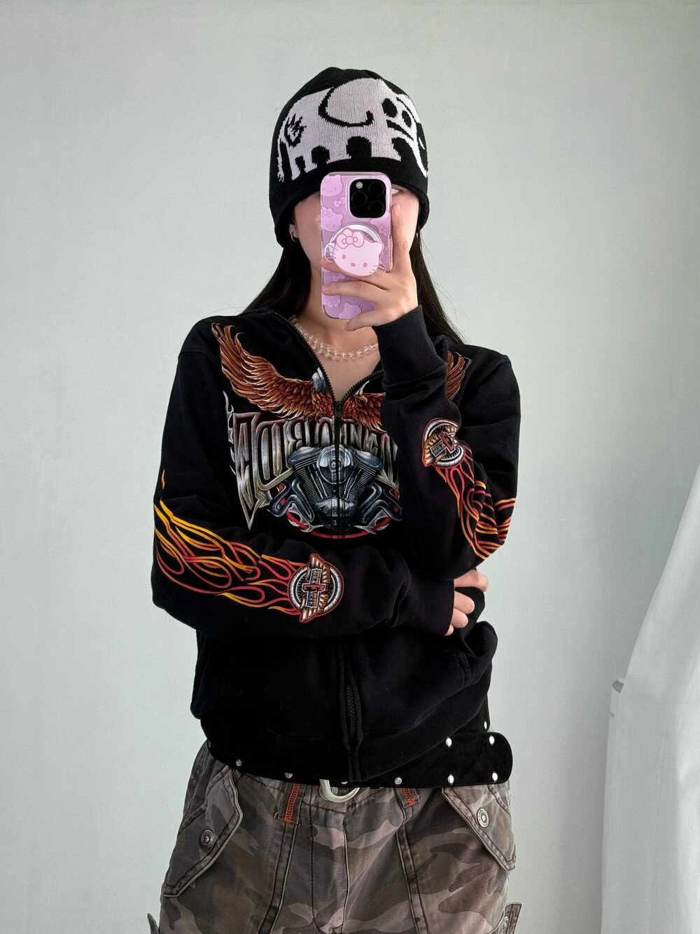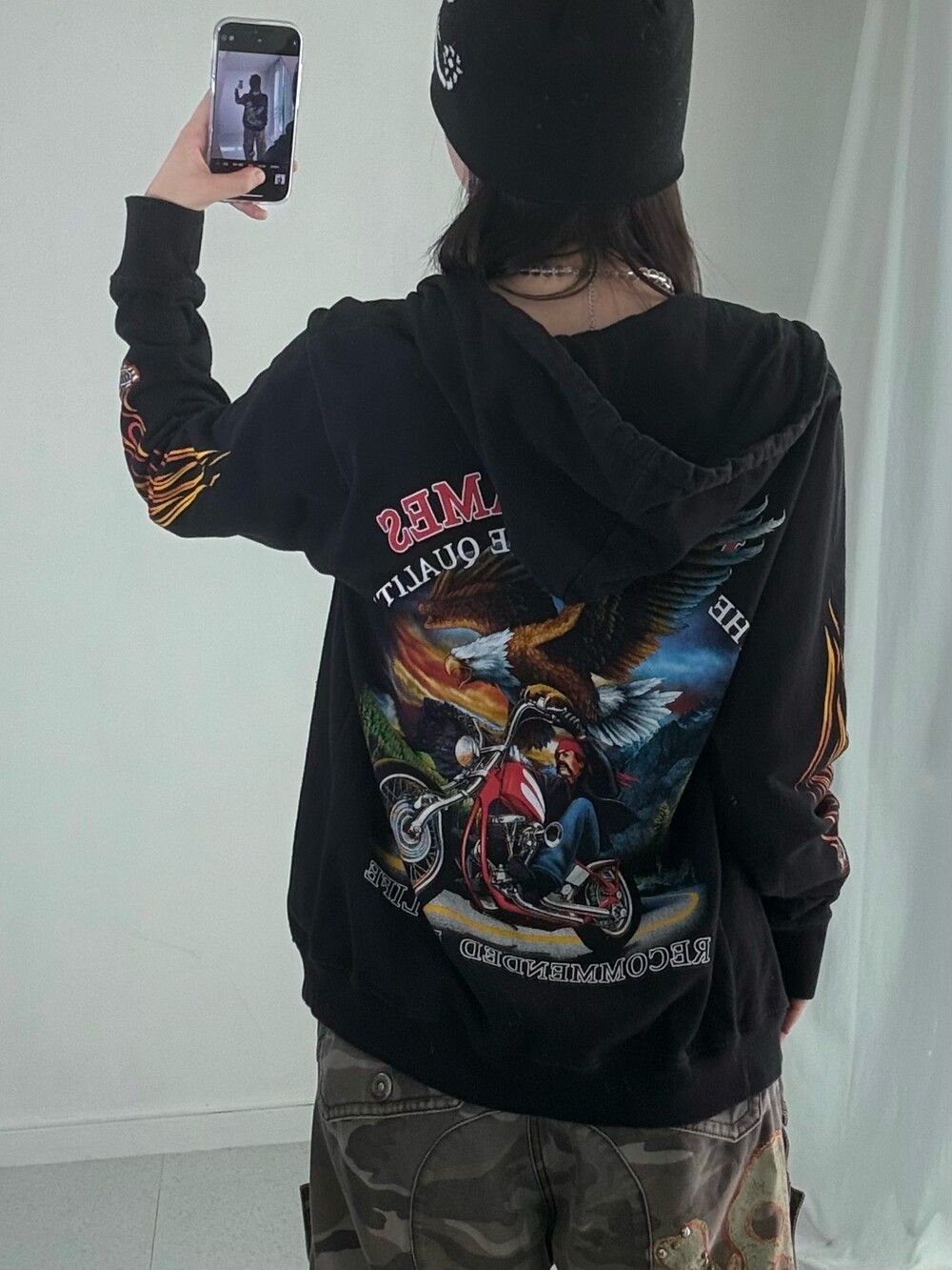 •할리데이비슨st 후드집업이에요! 평소 락티 많이들 좋아하셔서 그런깔로 준비해보았는데 어떤가요-키키. 앞,뒤,소매 전부 멋스러운 프린팅이 들어가있어 멋스럽고 핏도 적당히 루즈하게 떨어져 과히지 않게 입어주시기 좋은 아이템이랍니다!