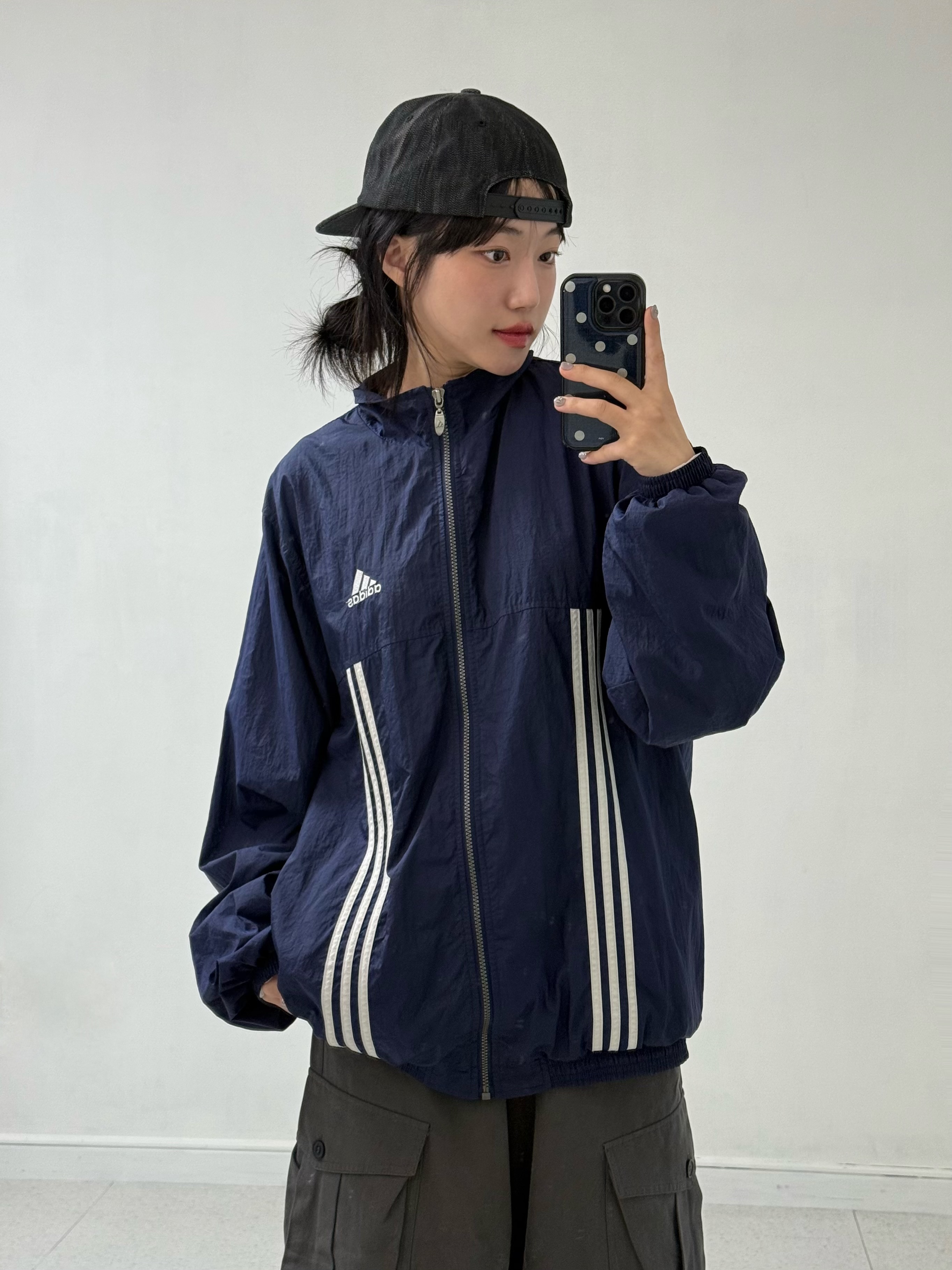•아디다스 네이비 오버핏 올드스쿨 바람막이 입니다. 앞에 삼선 디자인이 들어간게 킥이에요>,<
