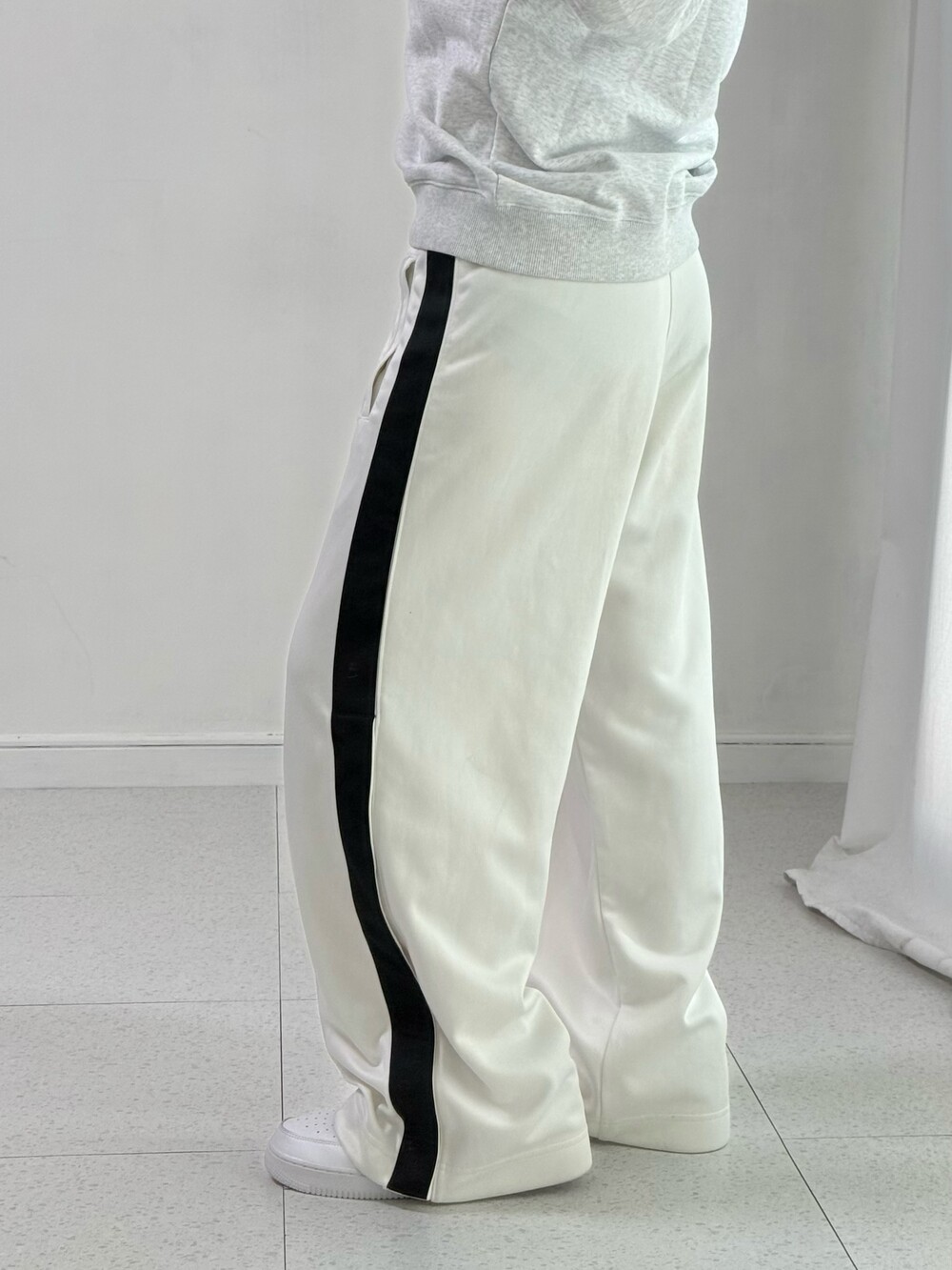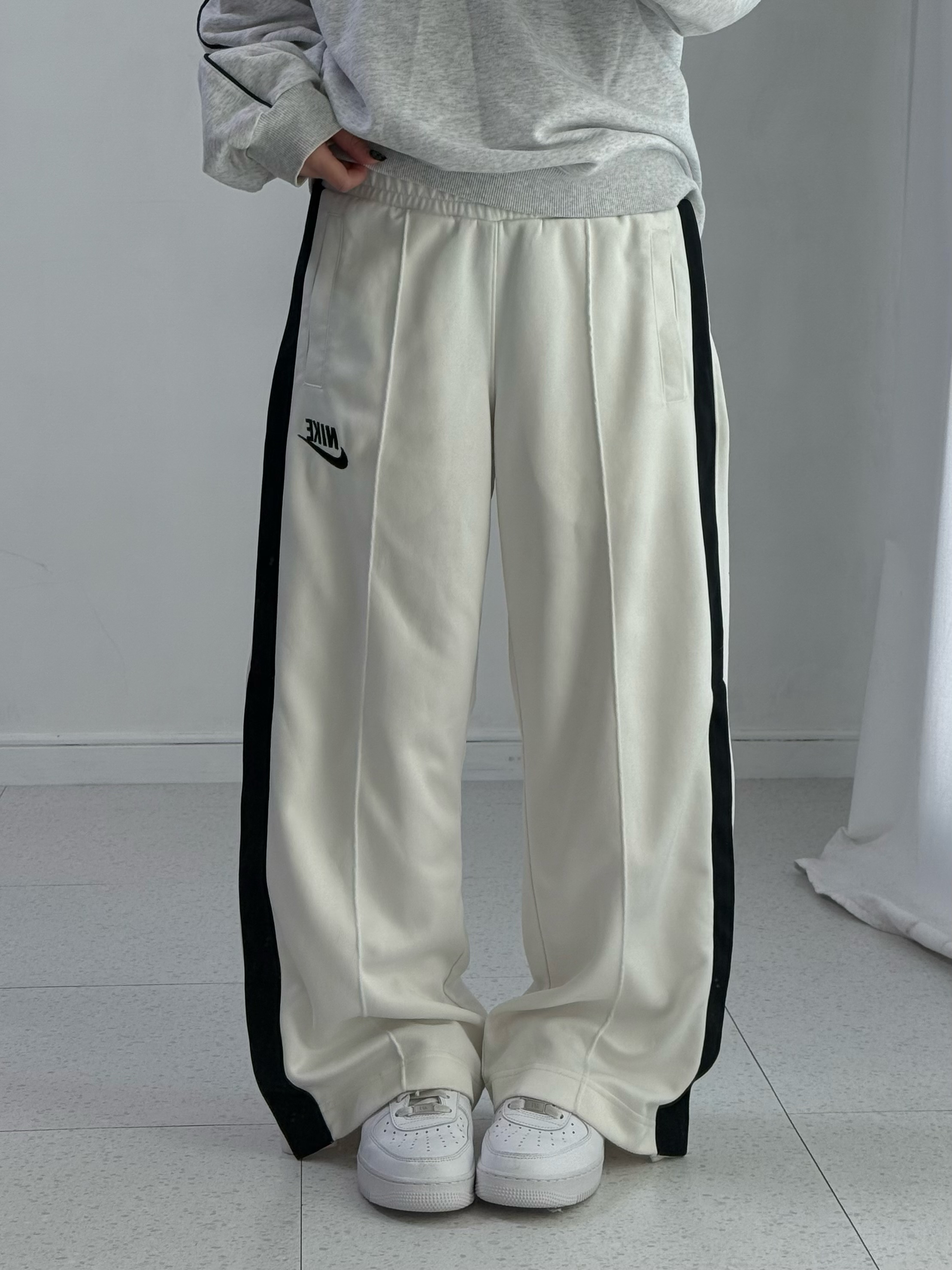 •나이키 화이트 와이드 팬츠 입니다. 밑단 사이드에 똑딱이 디테일이 들어가있어요!:)