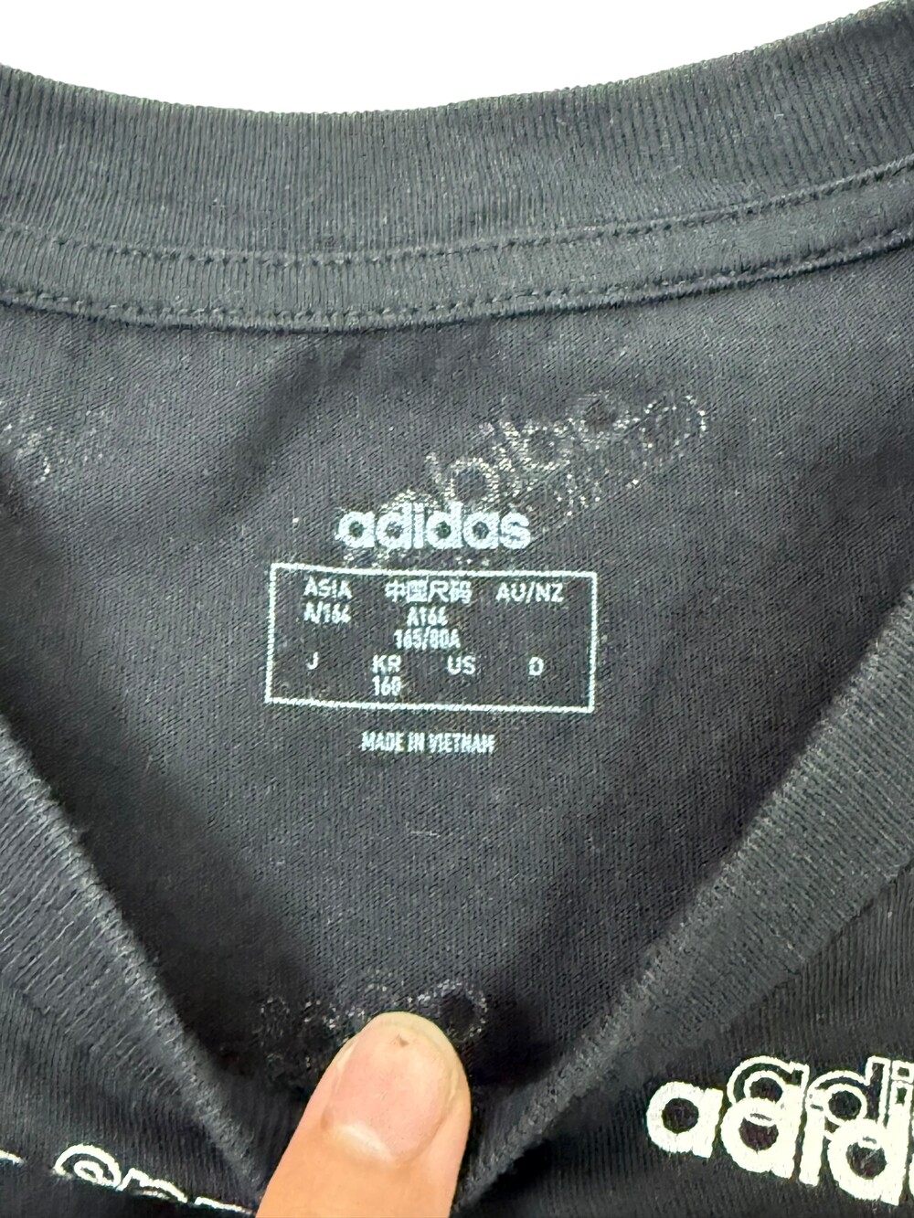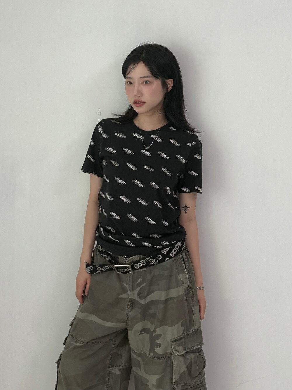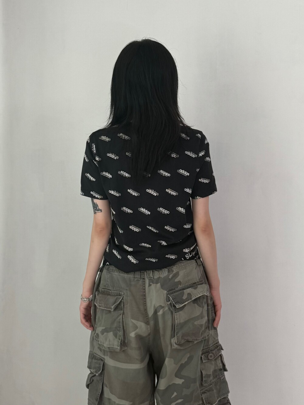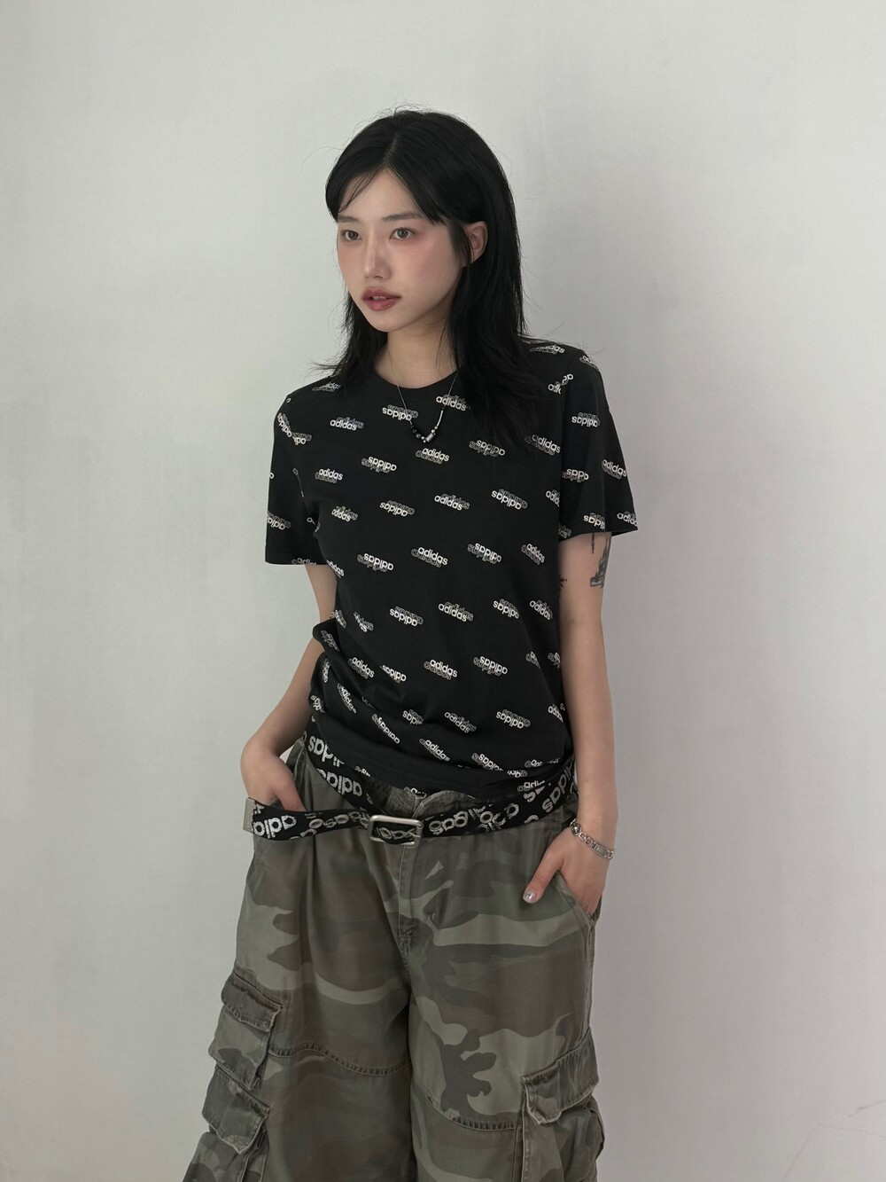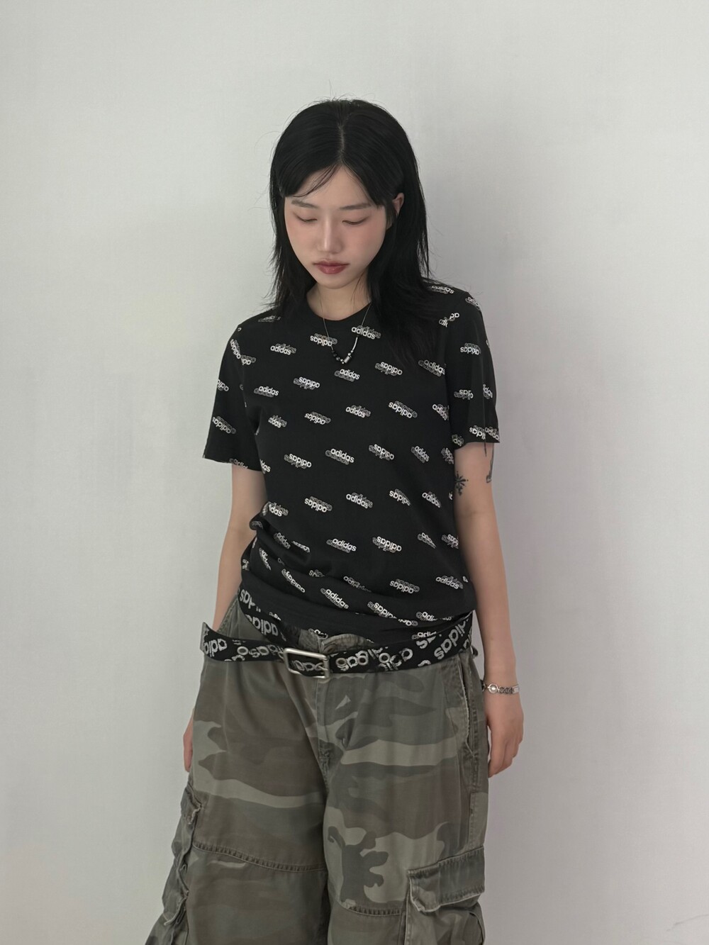 •블랙에 화이트 아디다스 로고가 슥슥 들어가 있는 티셔츠에요! 저처럼 뒤에 살짝 잡아서 크롭 느낌으로 연출해주셔도 정말 예쁘겠어요>,<