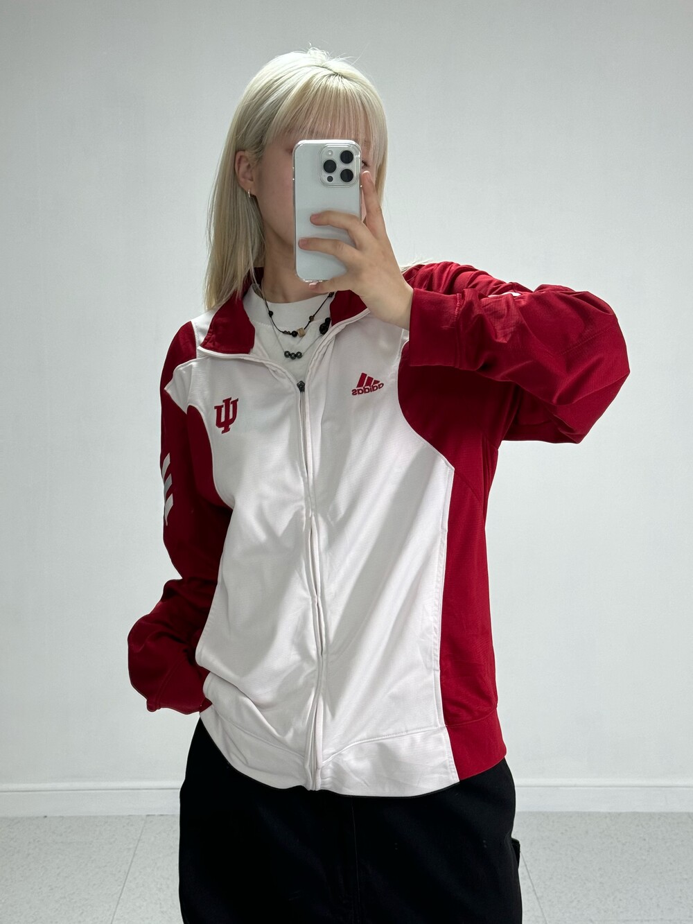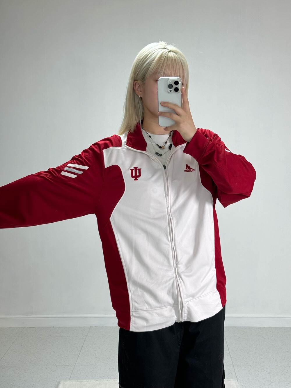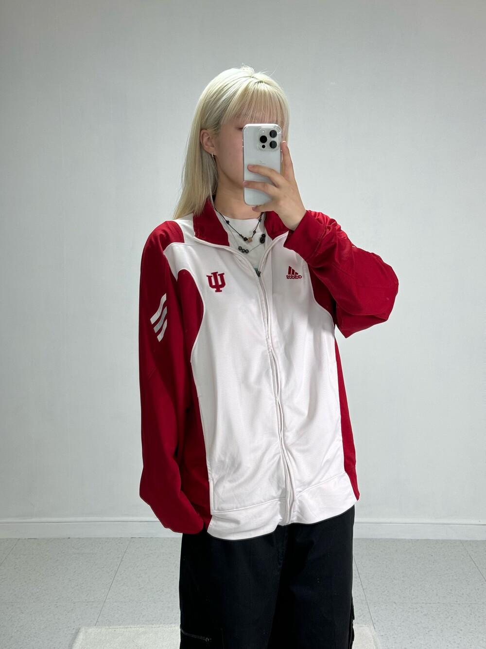 •레드와 화이트 조합으로 되어있는 져지에요ㅎㅎ 아방루즈핏으로 떨어지는 귀여운 제품입니다! 레드로 포인트가 들어가있지만 전체적으로 화이트 배경이라 부담스럽지 않고 좋아요 !
