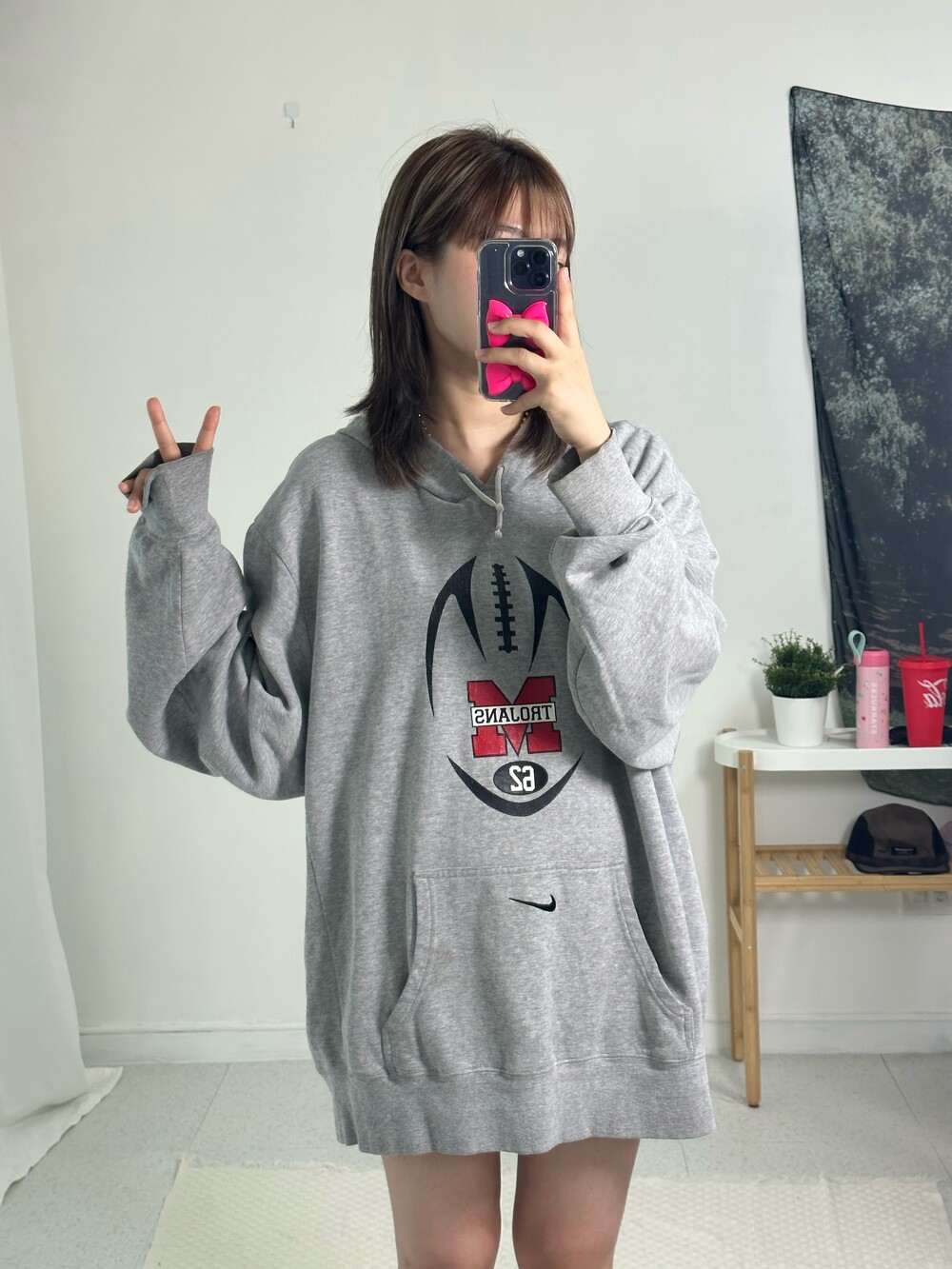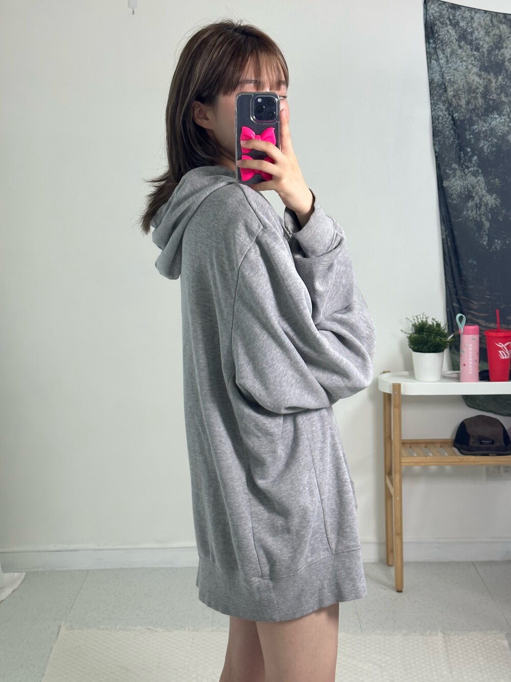 •오버한 사이즈에 루즈한 핏까지! 여리하게 연출하기 좋은 스포티한 후드에요ㅎㅎ 디자인 자체도 넘 독특하고 그레이 컬러라 데일리로 즐겨입기 좋은 제품입니다! 저는 단독으로 입어주었지만 가을에 바이커 팬츠와 함께 코디해주시는것도 좋을거같아요! 레그워머는 필수- 아니면 와이드한 데님팬츠랑도 잘어울리겠어요!