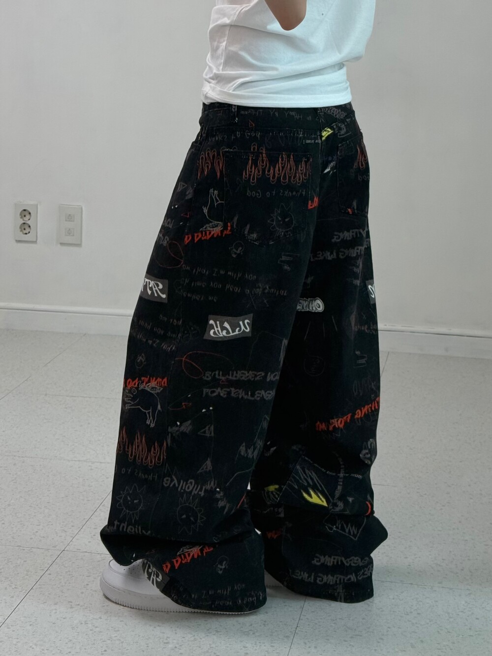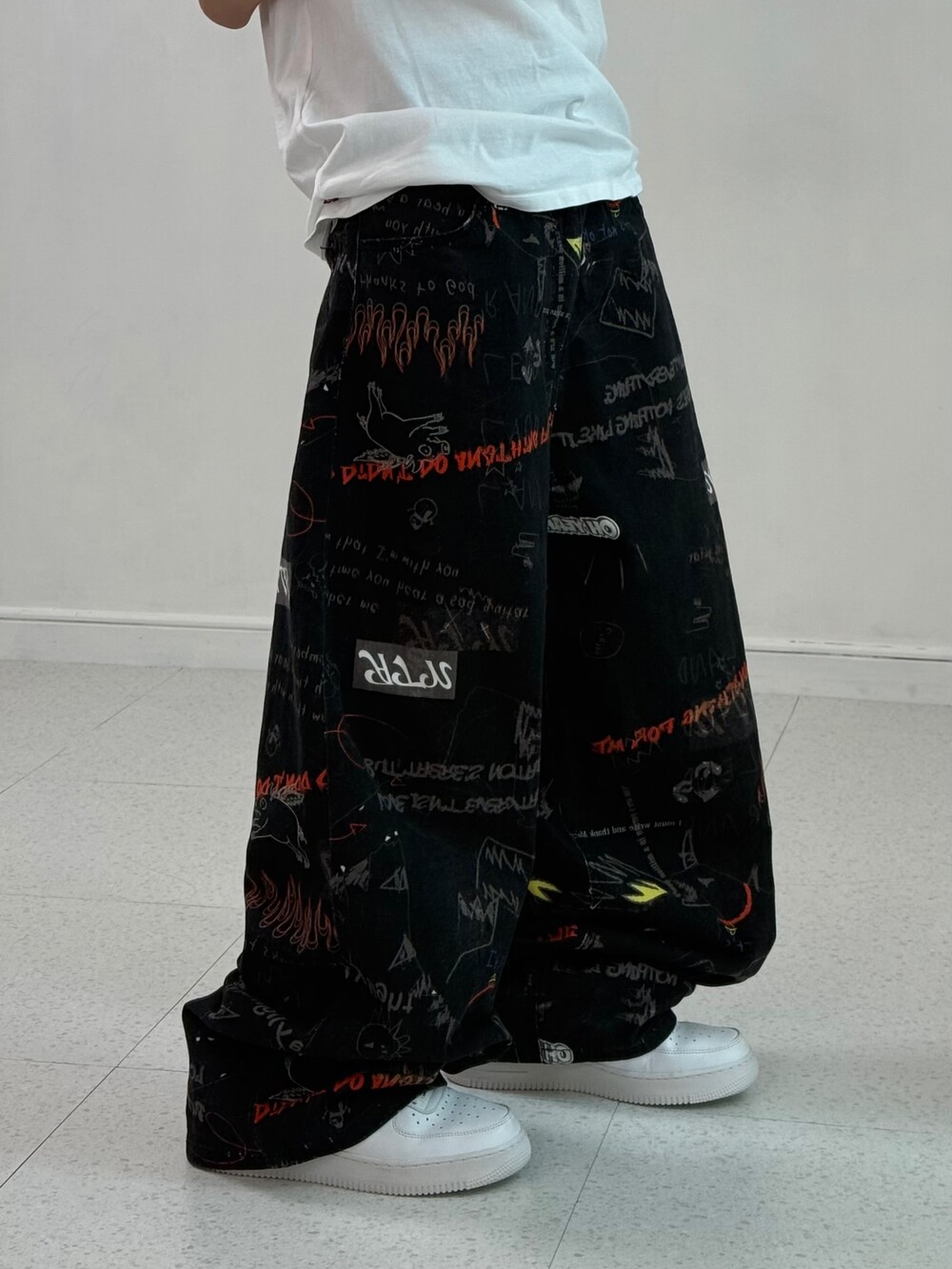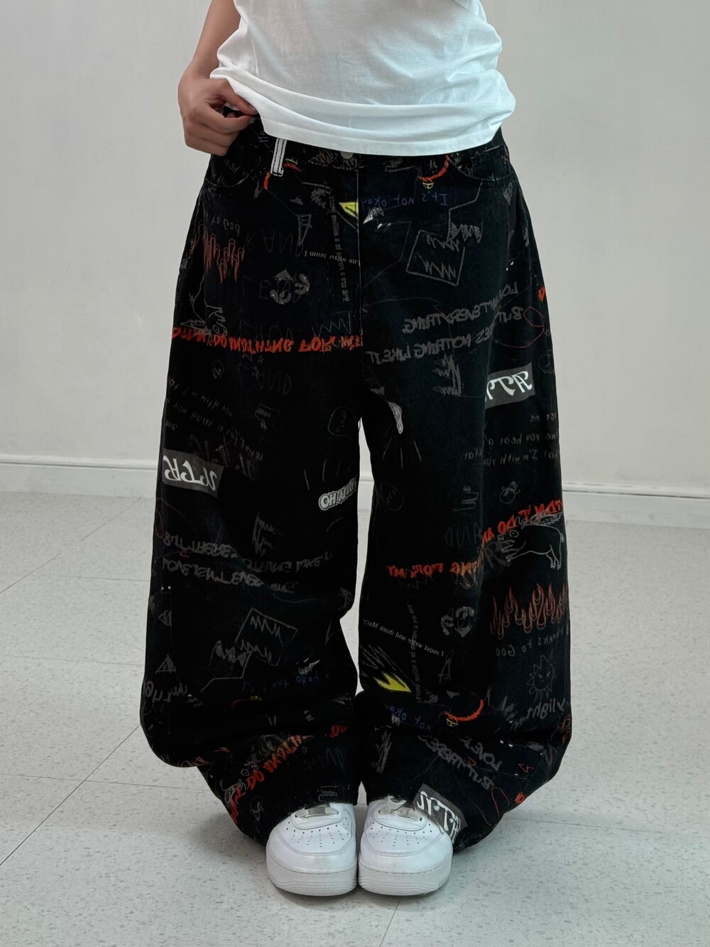 •힙한 와이드 후리추리한 핏이 멋진 블랙 페인팅st 팬츠 입니다! 올블랙 룩에 슥 입어주셔도 좋아요ㅎㅎ