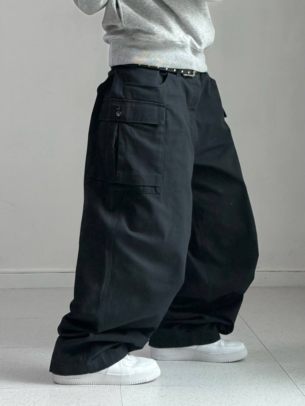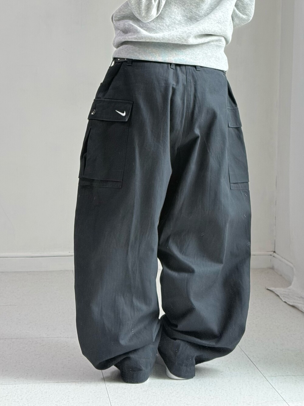 •나이키 와이드핏 블랙 카고팬츠 입니다. 블랙에 화이트 스우시 로고가 들어가있어 깔끔한 느낌까지- 데일리로 입어주시기 좋은 아이템이에요🖤😎