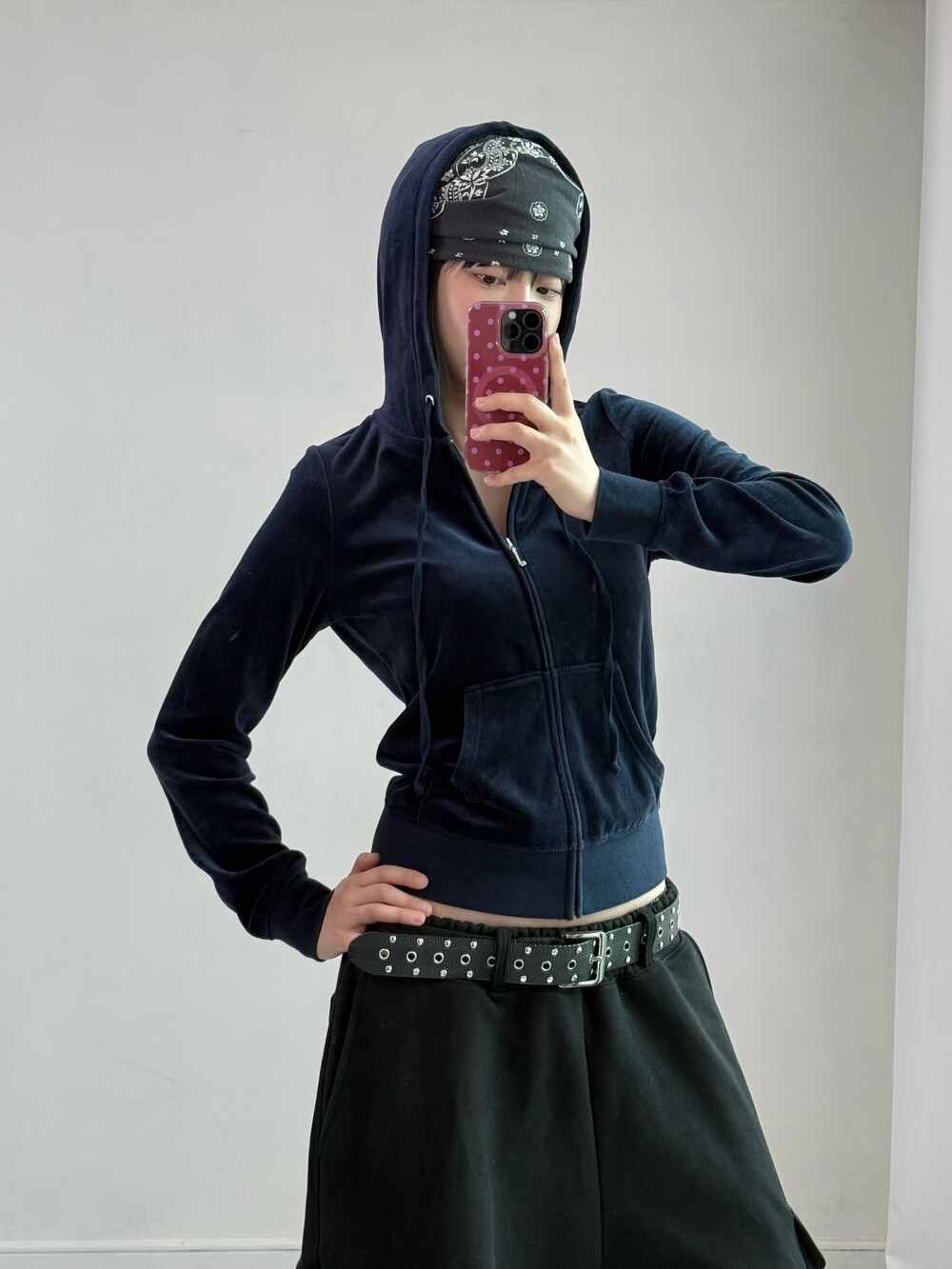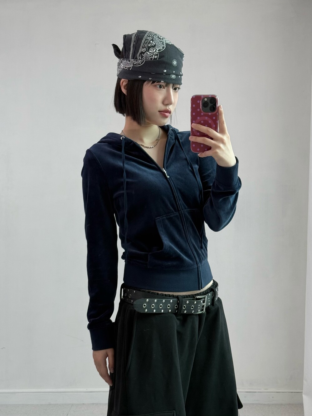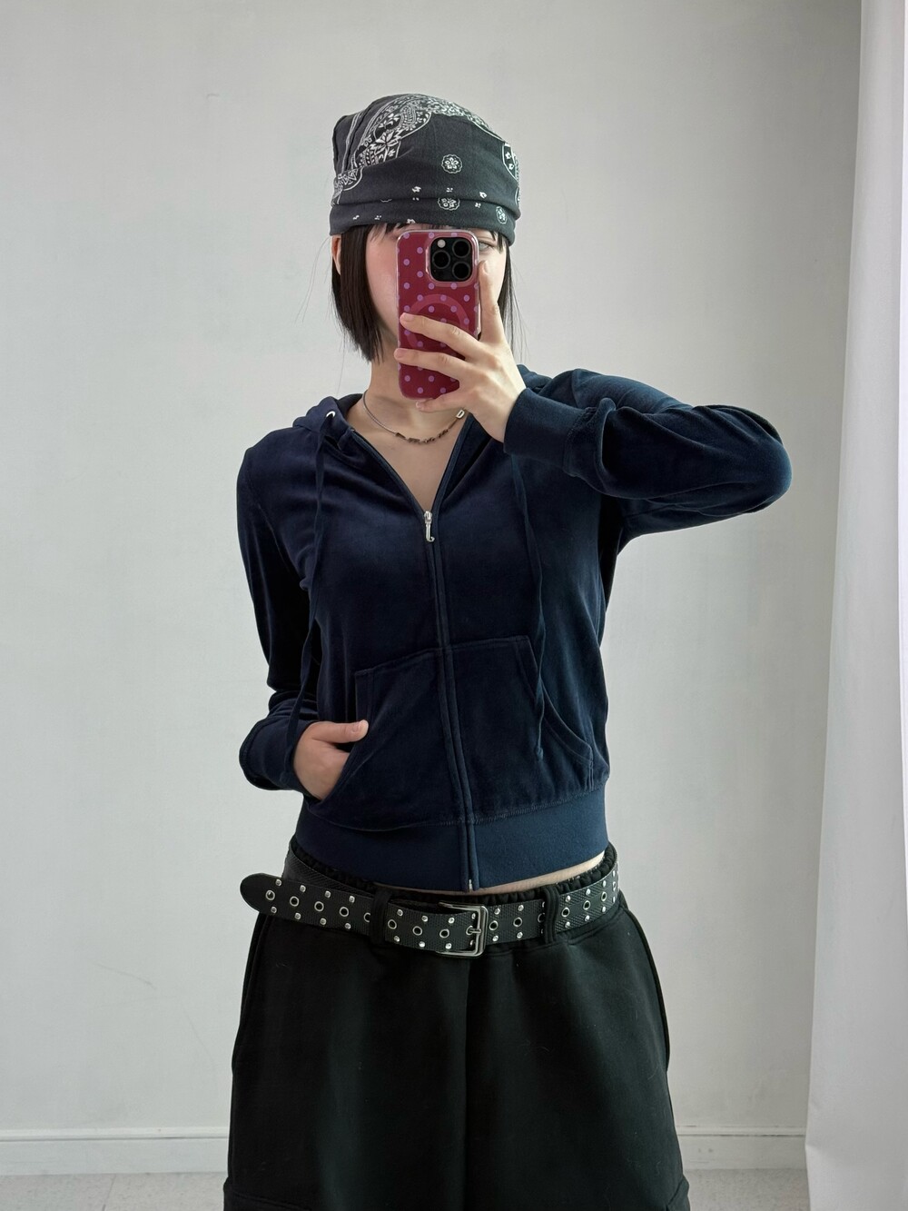 •와이투케이 무드 쥬씨 꾸뛰르 네이비 벨벳 후드집업 입니다. 핏이 넘 이뻐요,,🖤