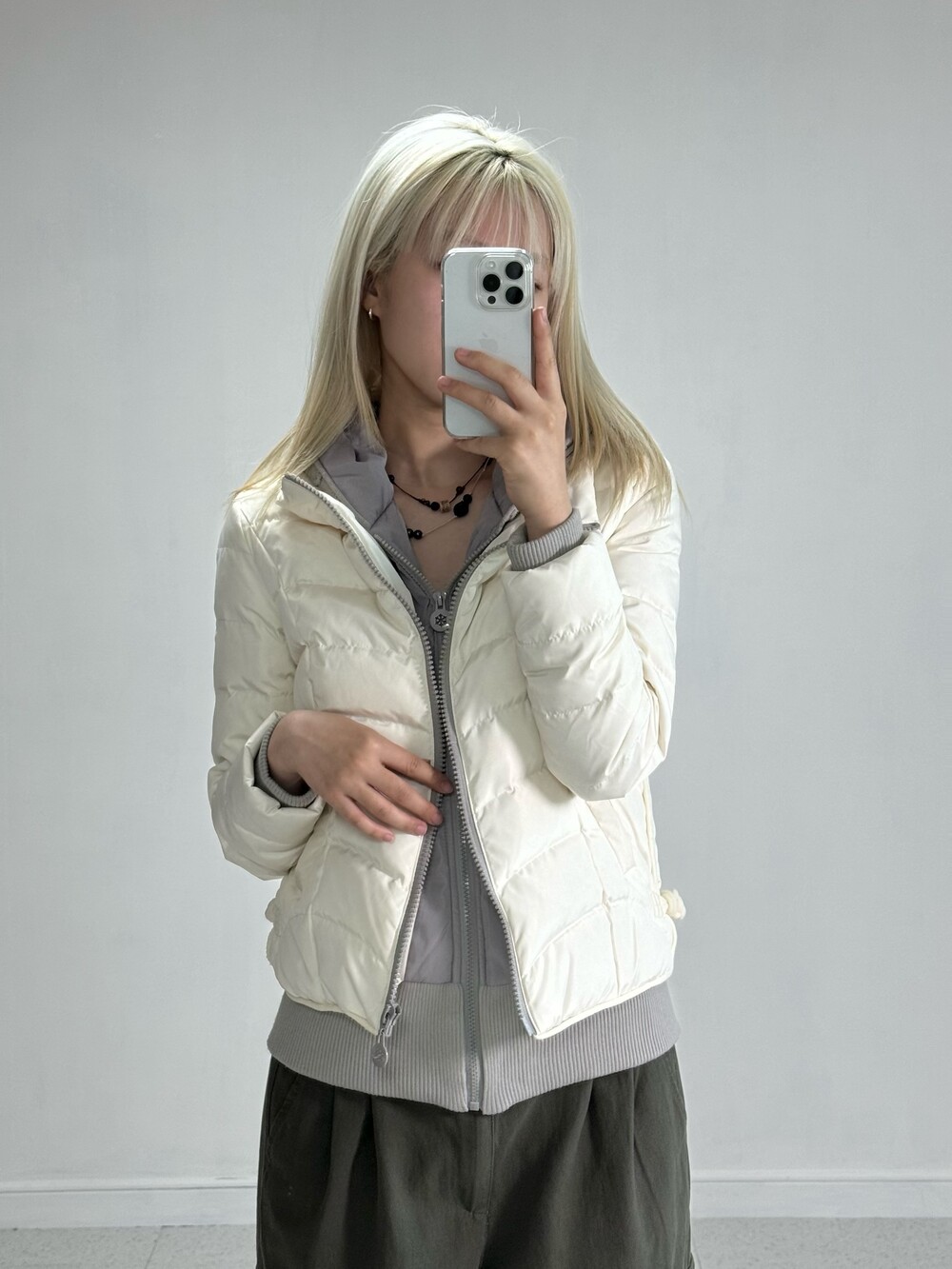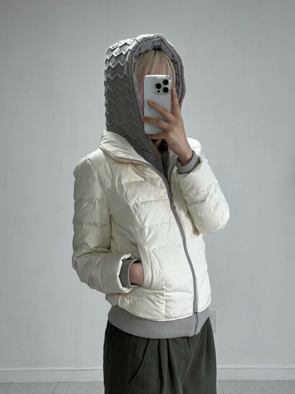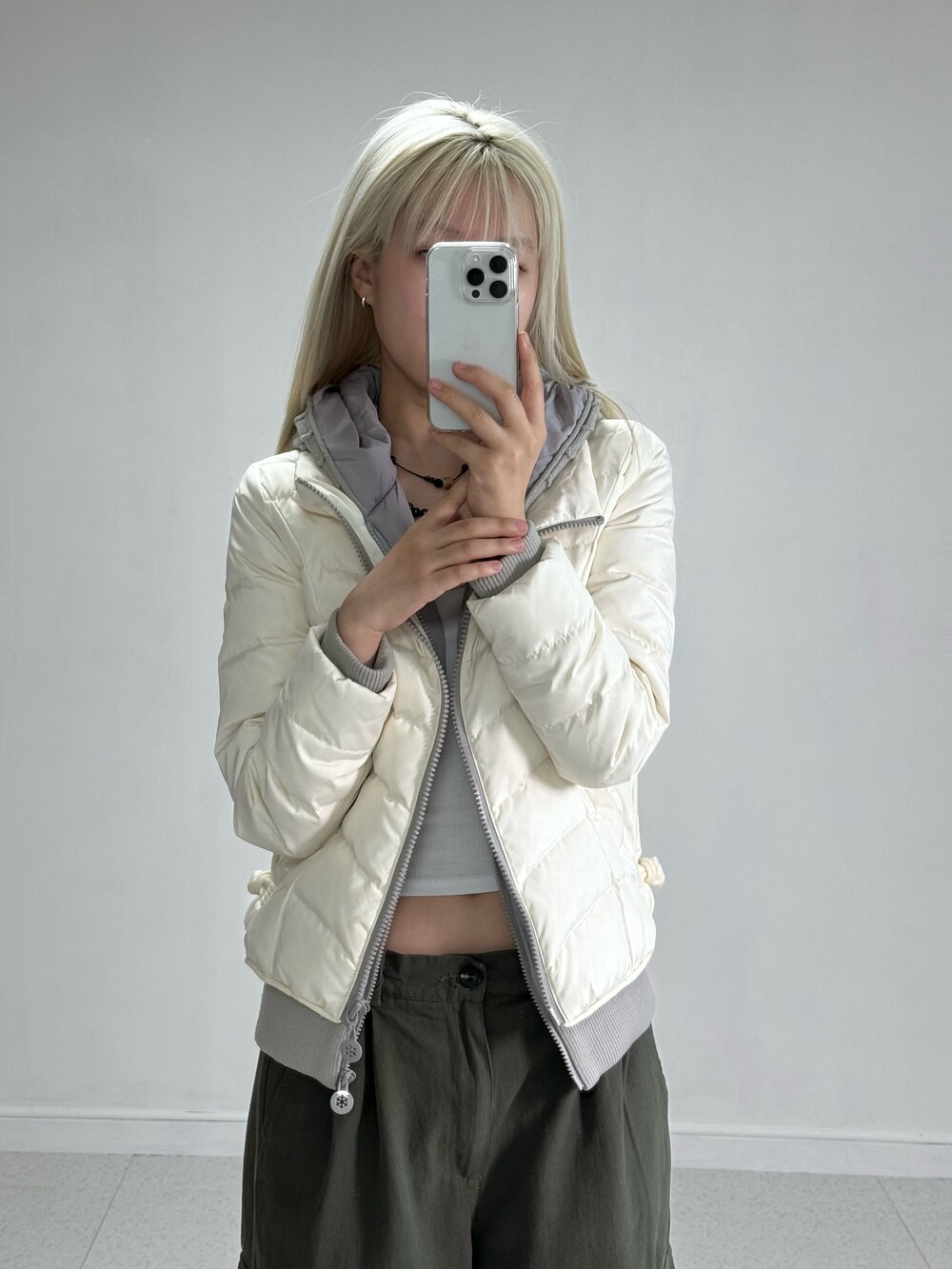 •아이보리 컬러 패딩과 안에 후디 레이어드가 되어있는 제품이에요! 심지어 모자가 케이블 니트 디자인이라 더욱 빈티지한 무드가 낭낭하더라구요>,< 살짝 핏하게 떨어지는 제품이며 귀엽게 마구 착용해주세용🖤
