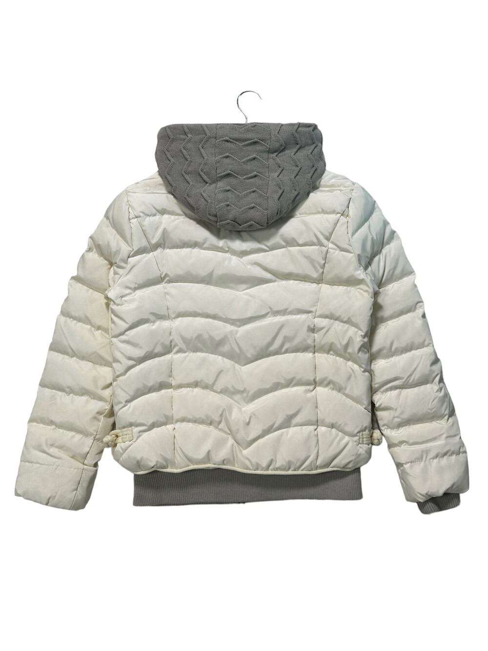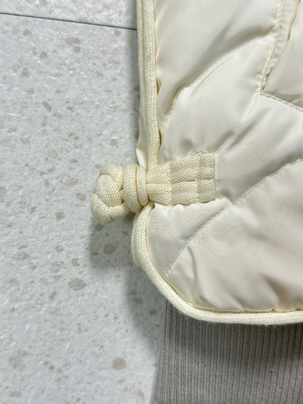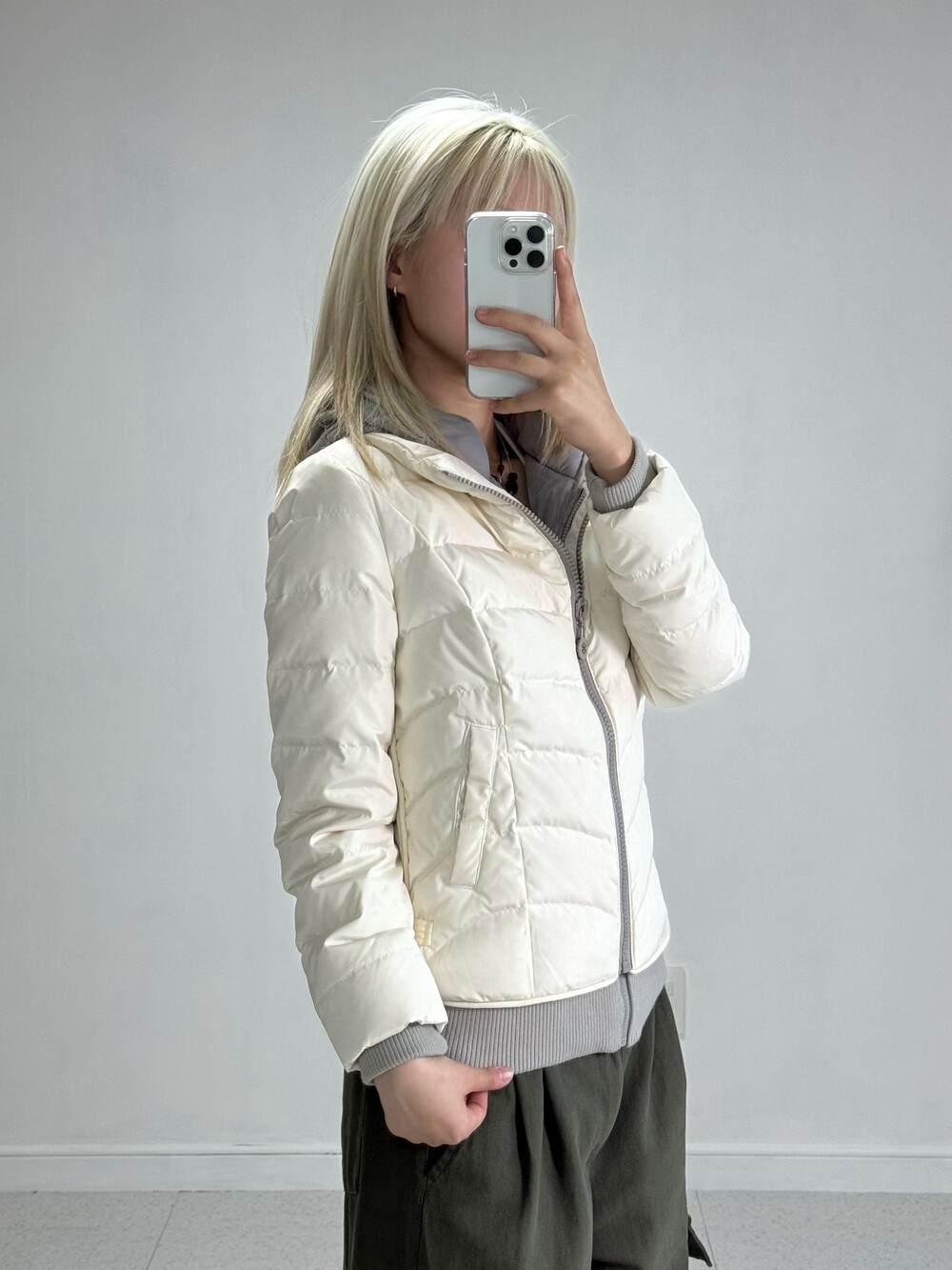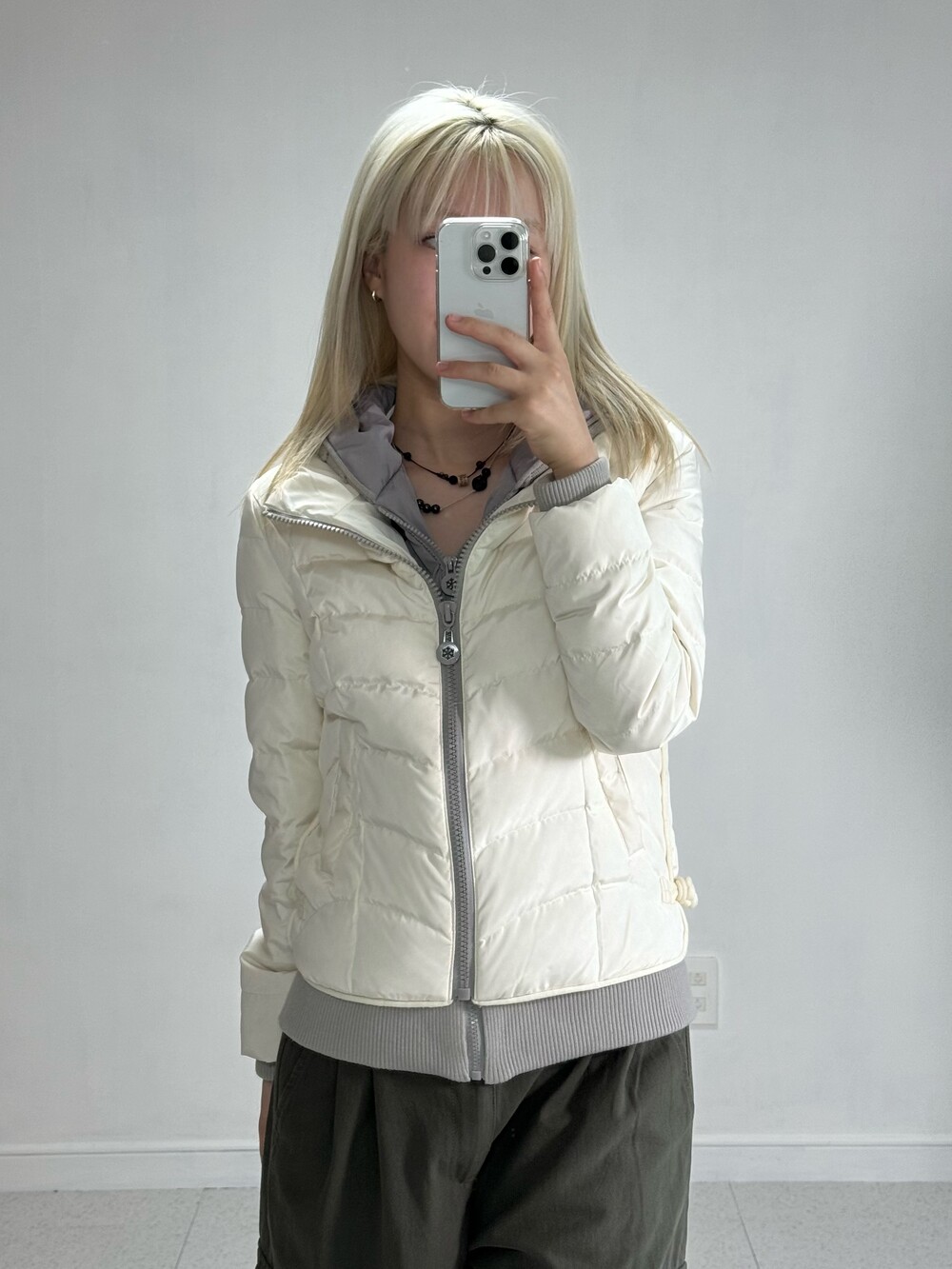 •아이보리 컬러 패딩과 안에 후디 레이어드가 되어있는 제품이에요! 심지어 모자가 케이블 니트 디자인이라 더욱 빈티지한 무드가 낭낭하더라구요>,< 살짝 핏하게 떨어지는 제품이며 귀엽게 마구 착용해주세용🖤
