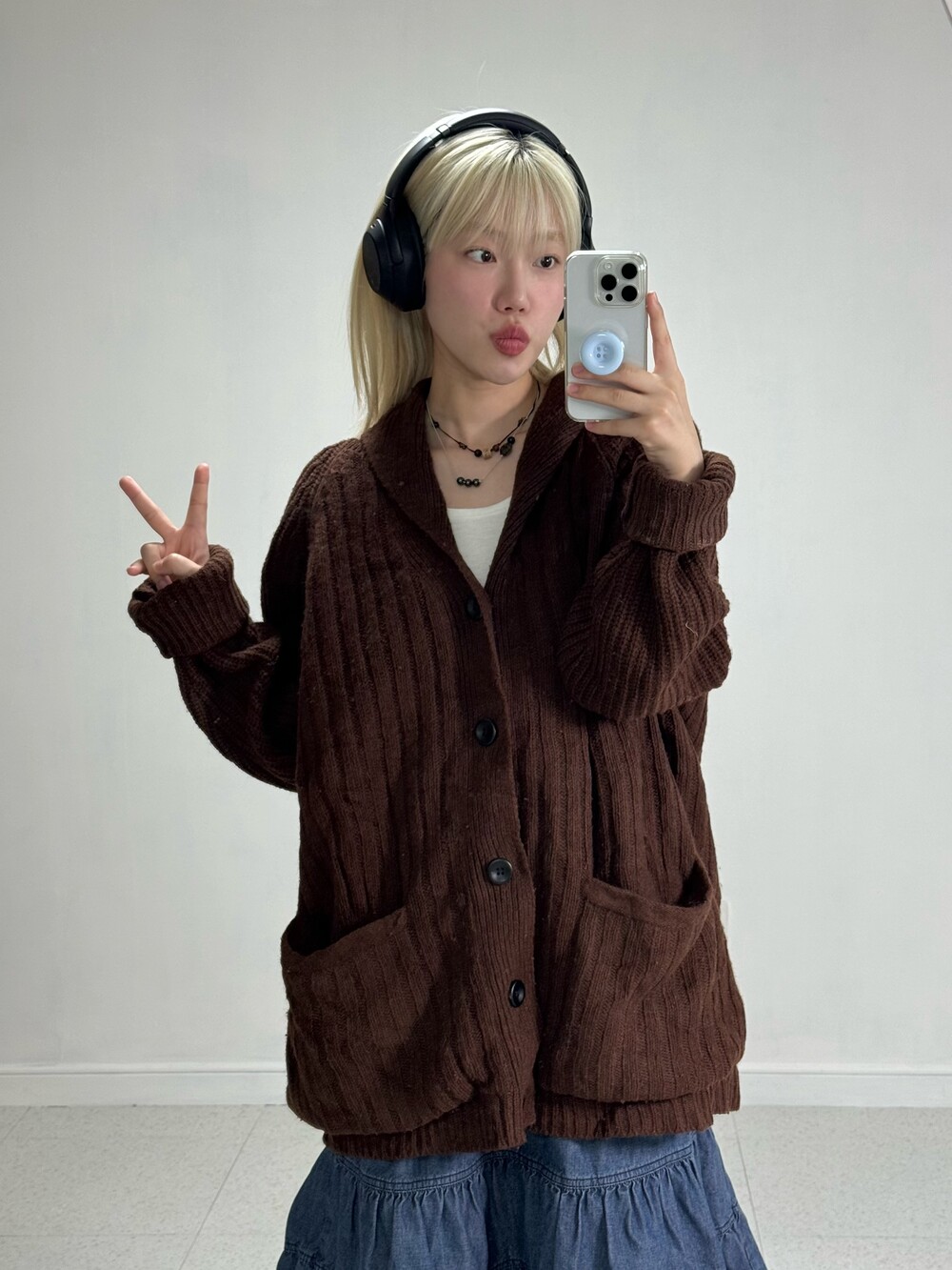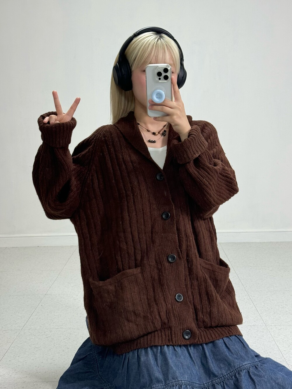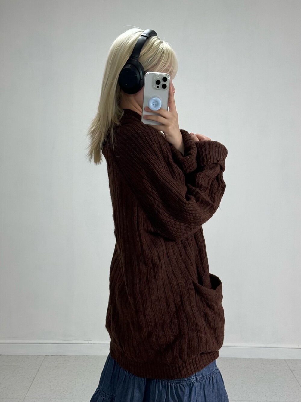 •라방하면서 제가 극찬했던 브라운 니트 가디건이에요! 아방묵직루즈핏의 정석이라고 볼 수 있구요, 오두막에서 모닥불 피고 담요 덮고있는 소녀감성 입니돠,. 크게 들어간 포켓 디자인이 신의 한 수 ..
