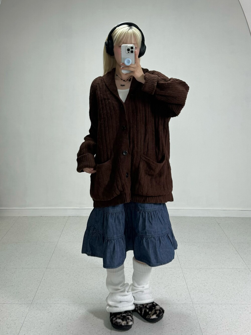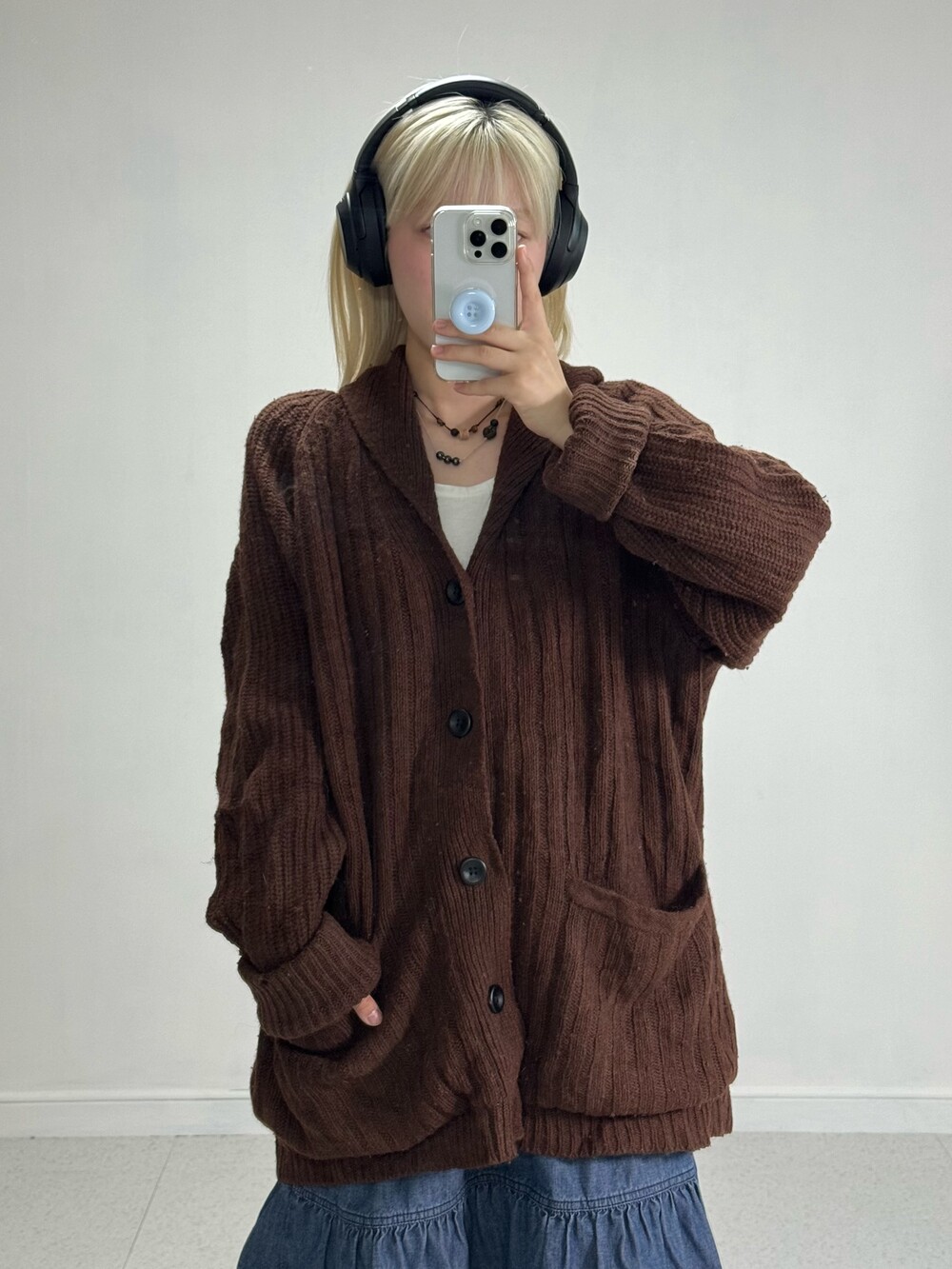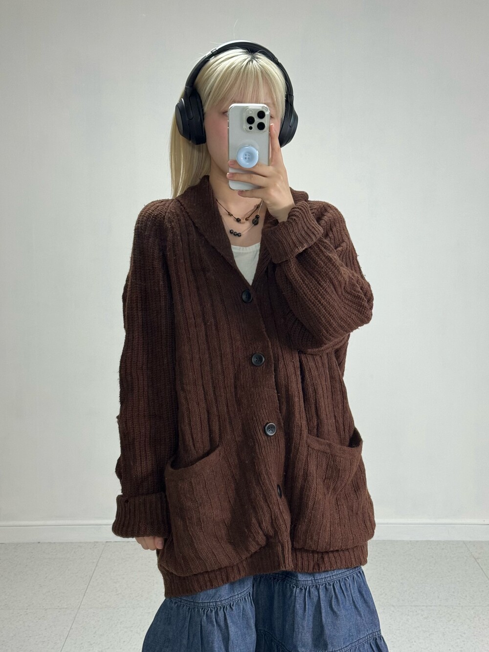•라방하면서 제가 극찬했던 브라운 니트 가디건이에요! 아방묵직루즈핏의 정석이라고 볼 수 있구요, 오두막에서 모닥불 피고 담요 덮고있는 소녀감성 입니돠,. 크게 들어간 포켓 디자인이 신의 한 수 ..