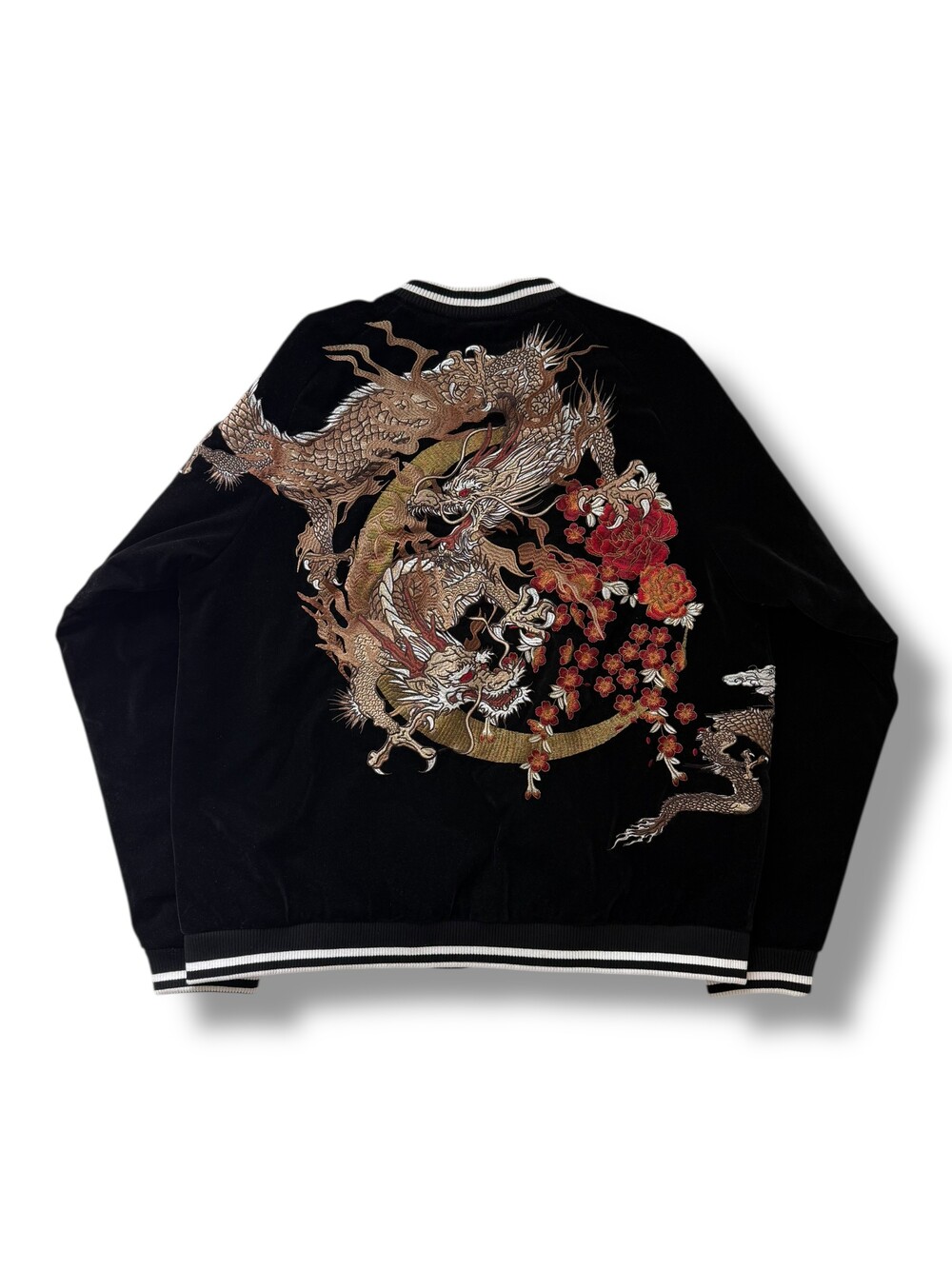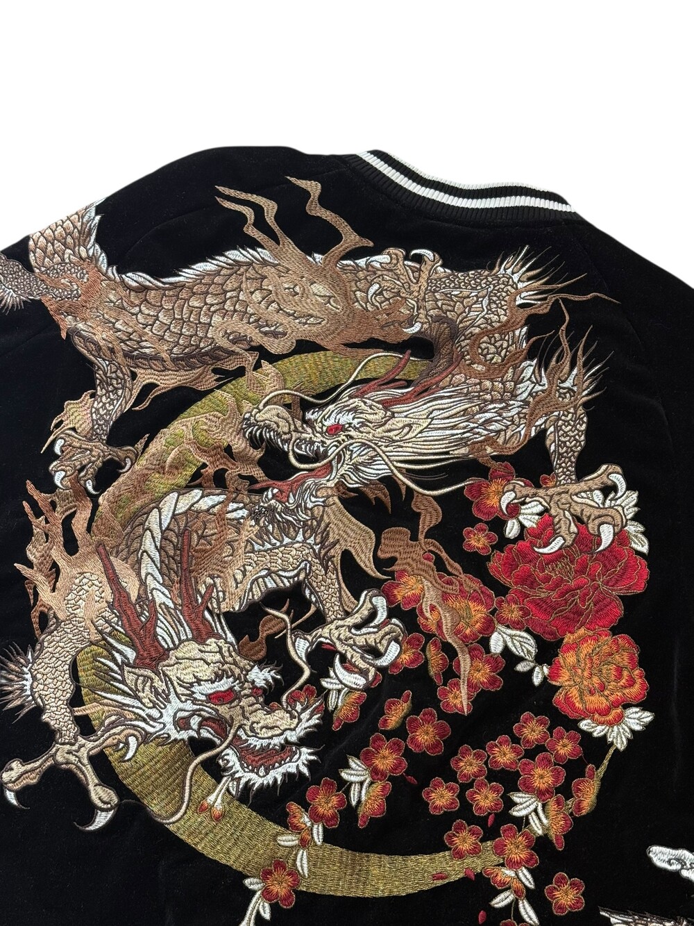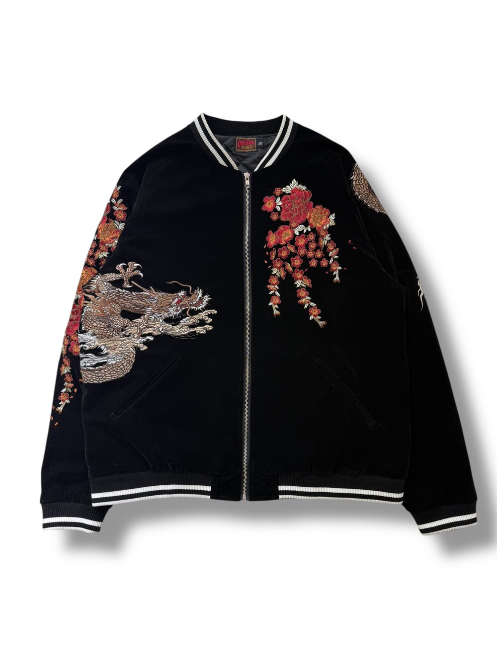 •오니데님 스웨이드 스카쟌 입니다. 화려하고 큼지막한 자수 디자인이 돋보이는 유니크한 아우터에요!