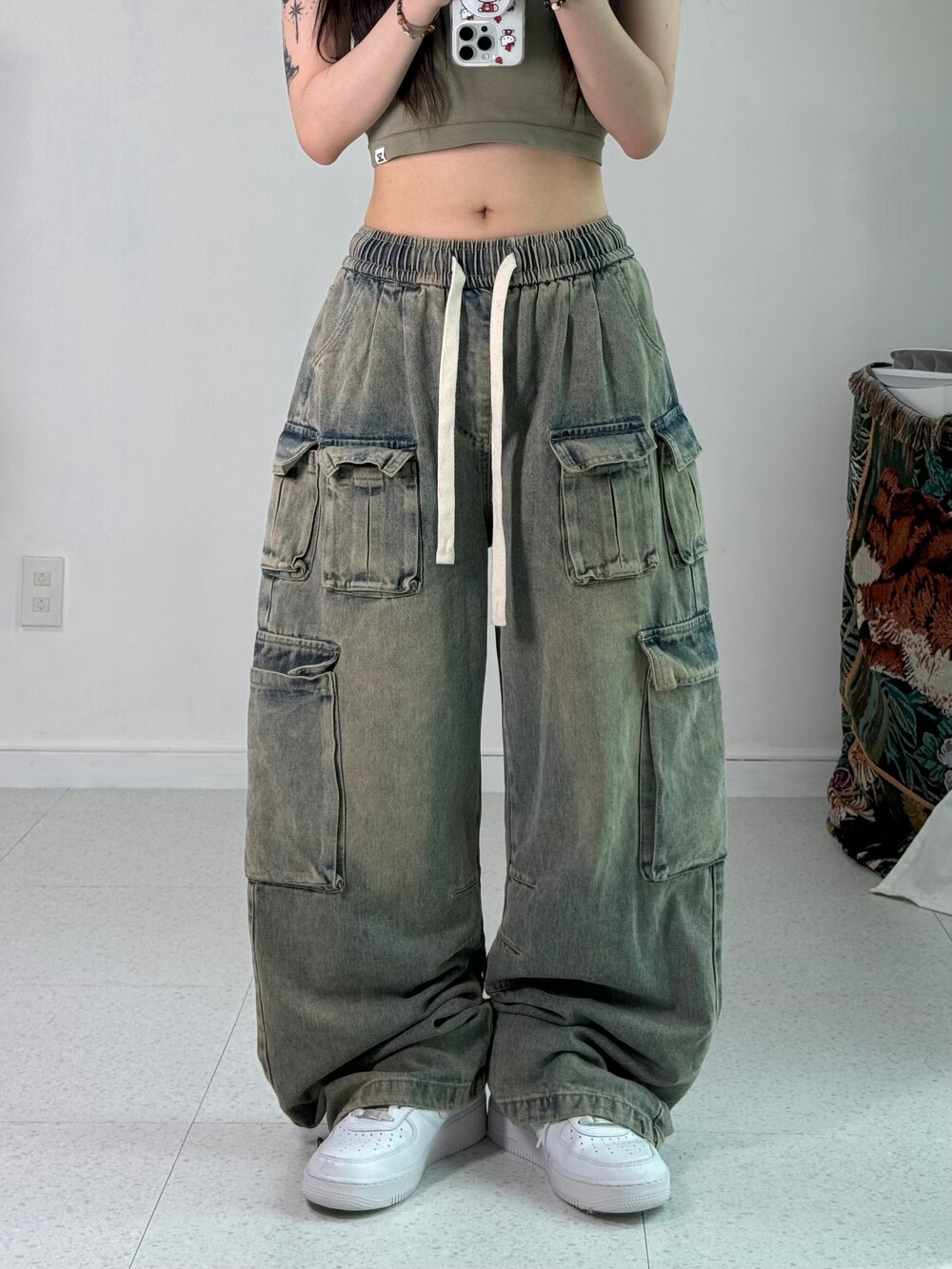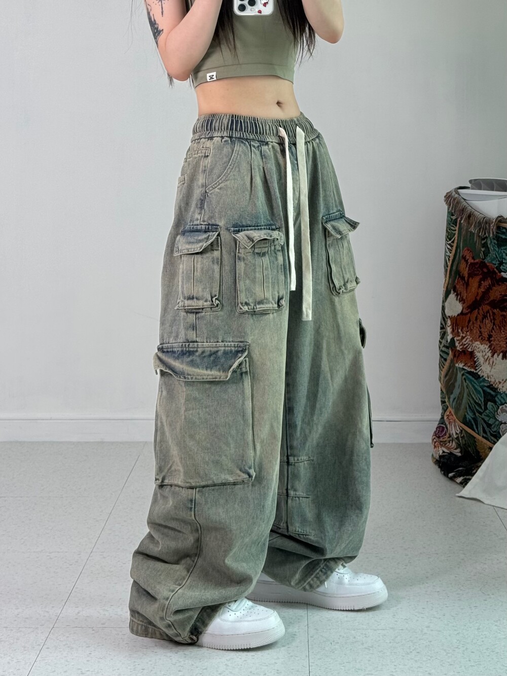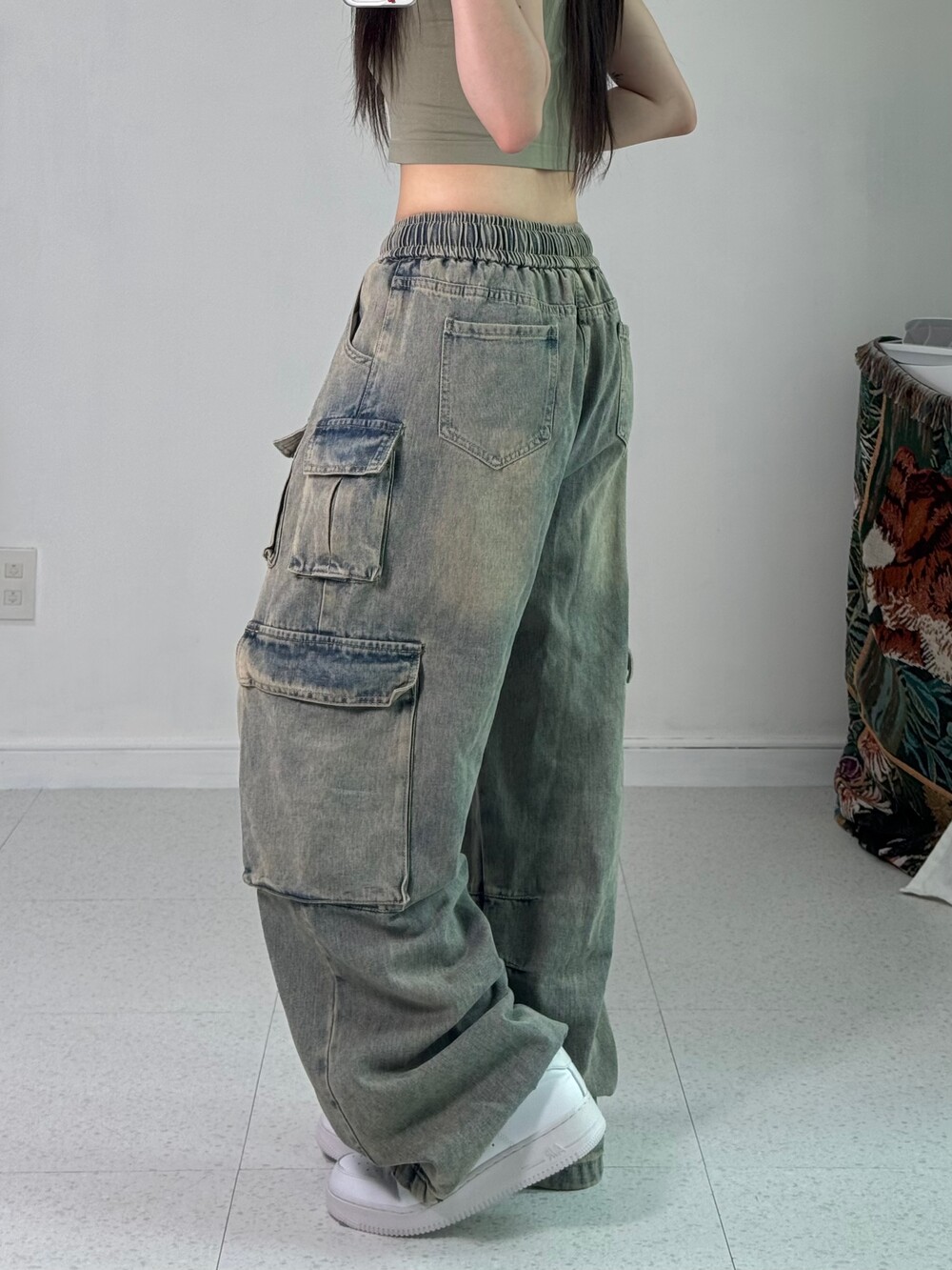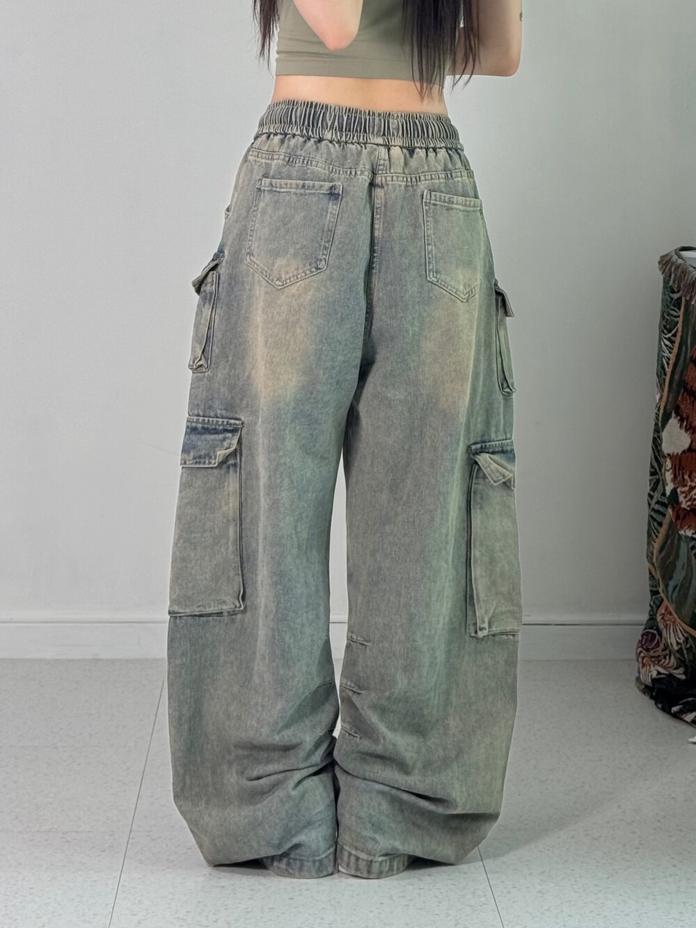 •허리가 밴딩이라 편안하고 빈티지 무드 낭낭한 멀티포켓 카고 끝판왕 디자인 팬츠 입니다! 와이드루즈묵직핏..최공..🖤