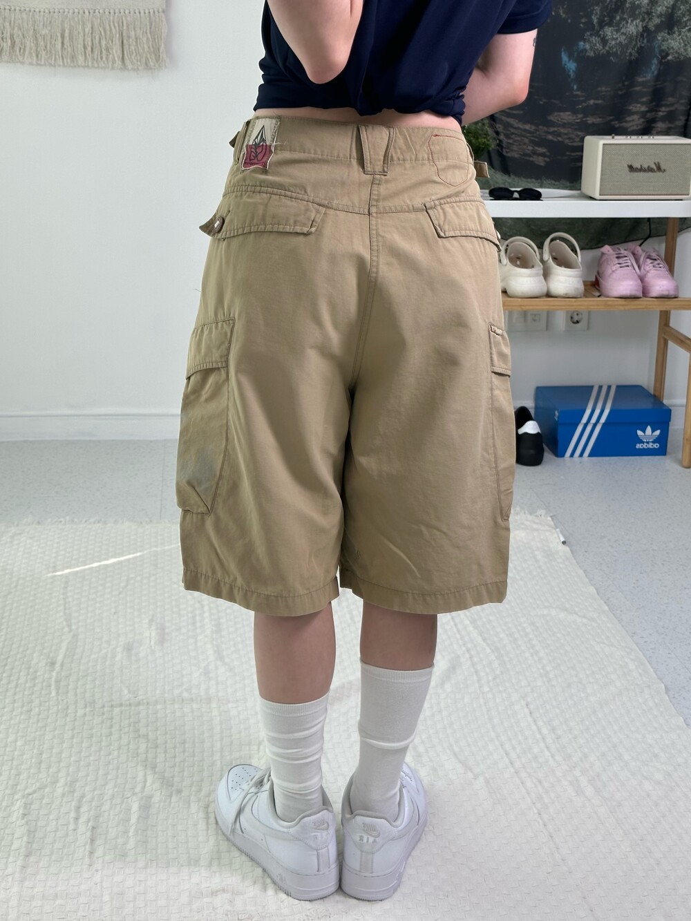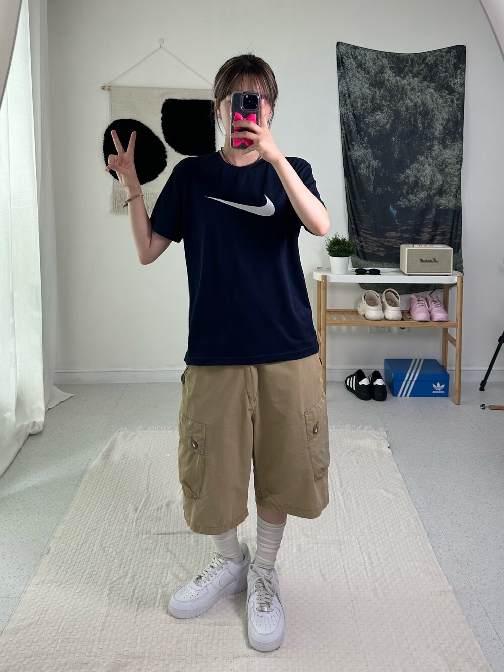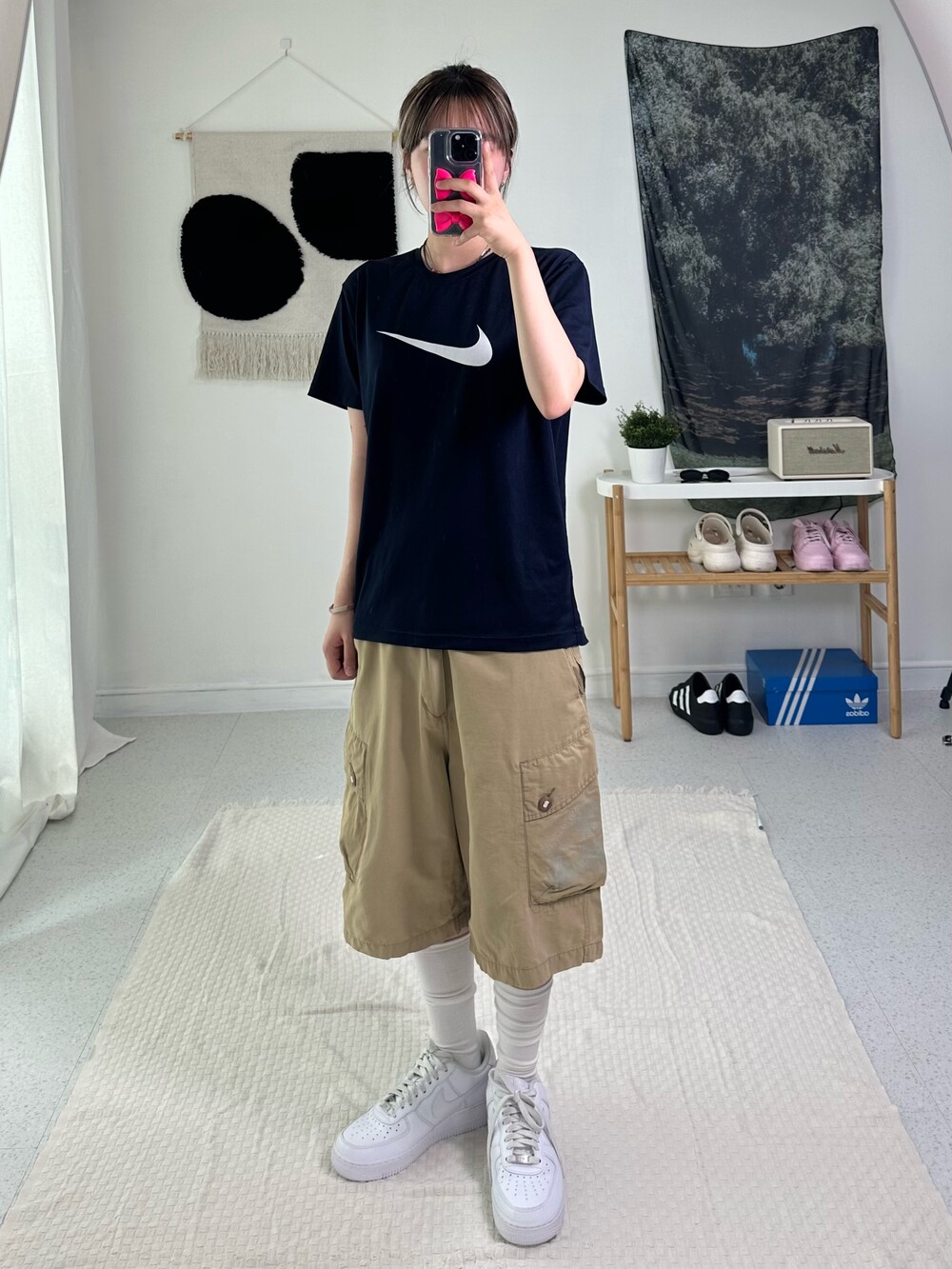 •루즈한 느낌이 가득한 베이지 컬러 하프카고>< 포켓에 프린팅이 되어 있어 디테일이 더욱 있는 제품이에요! 단추가 귀여워서 그런지 아메카지룩에도 찰떡 일듯해요<3