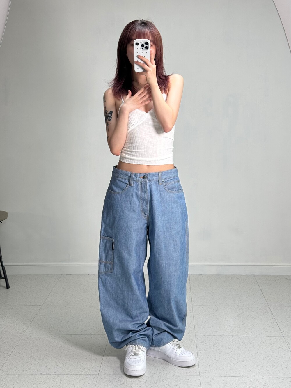 •사이즈나 핏이 완벽한 데님팬츠라고 말씀 드리고 싶어요! 전체적으로 아방한데 밑단이 크지 않아서 끌리지 않고 예쁘게 신발 위로 안착되어 깔꼼하게 착용하시기 좋습니다👍🏻