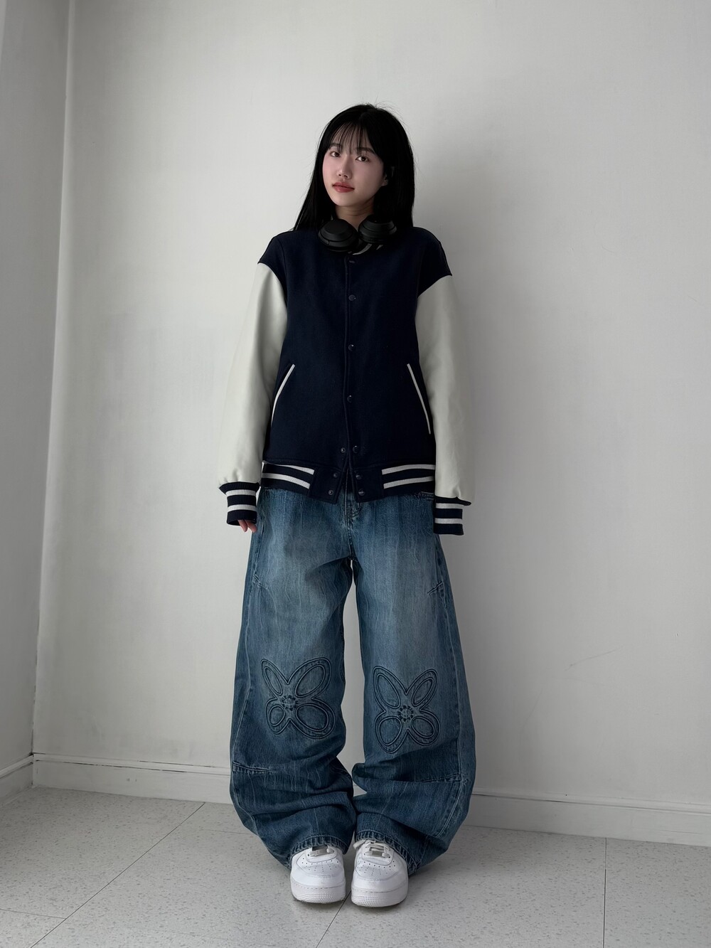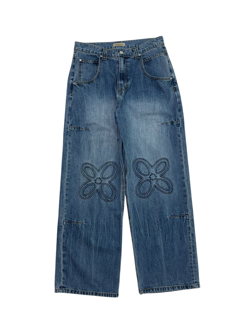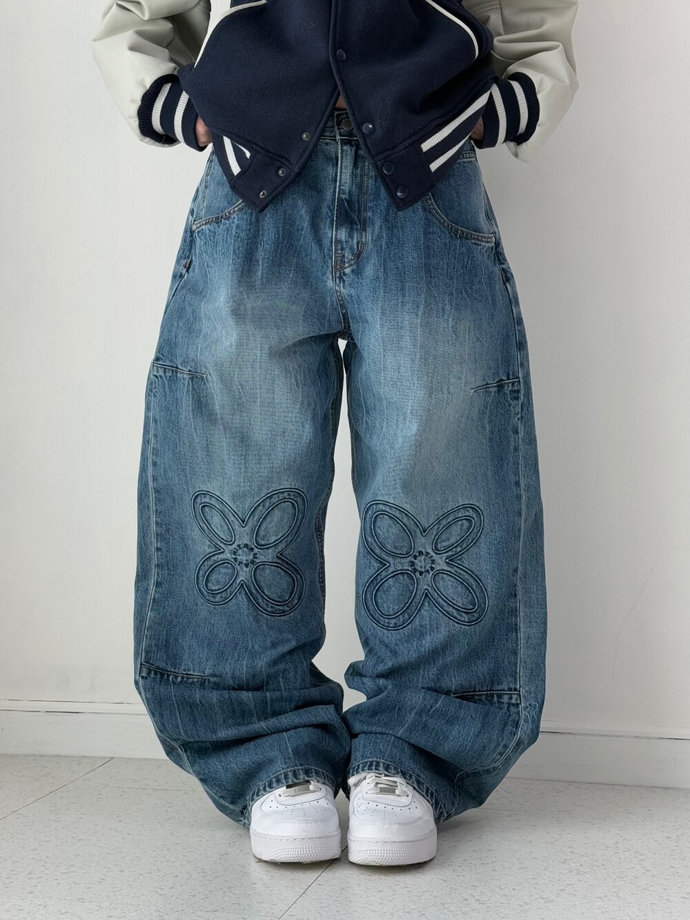 •귀여운 플라워 패턴이 쫑쫑>,< 포인트로 착용해주시기 좋은 데님팬츠에요! 와이드묵직핏입니닷. 데님 치곤 무겁지 않은편이라 활동하실때도 편하실거에요!